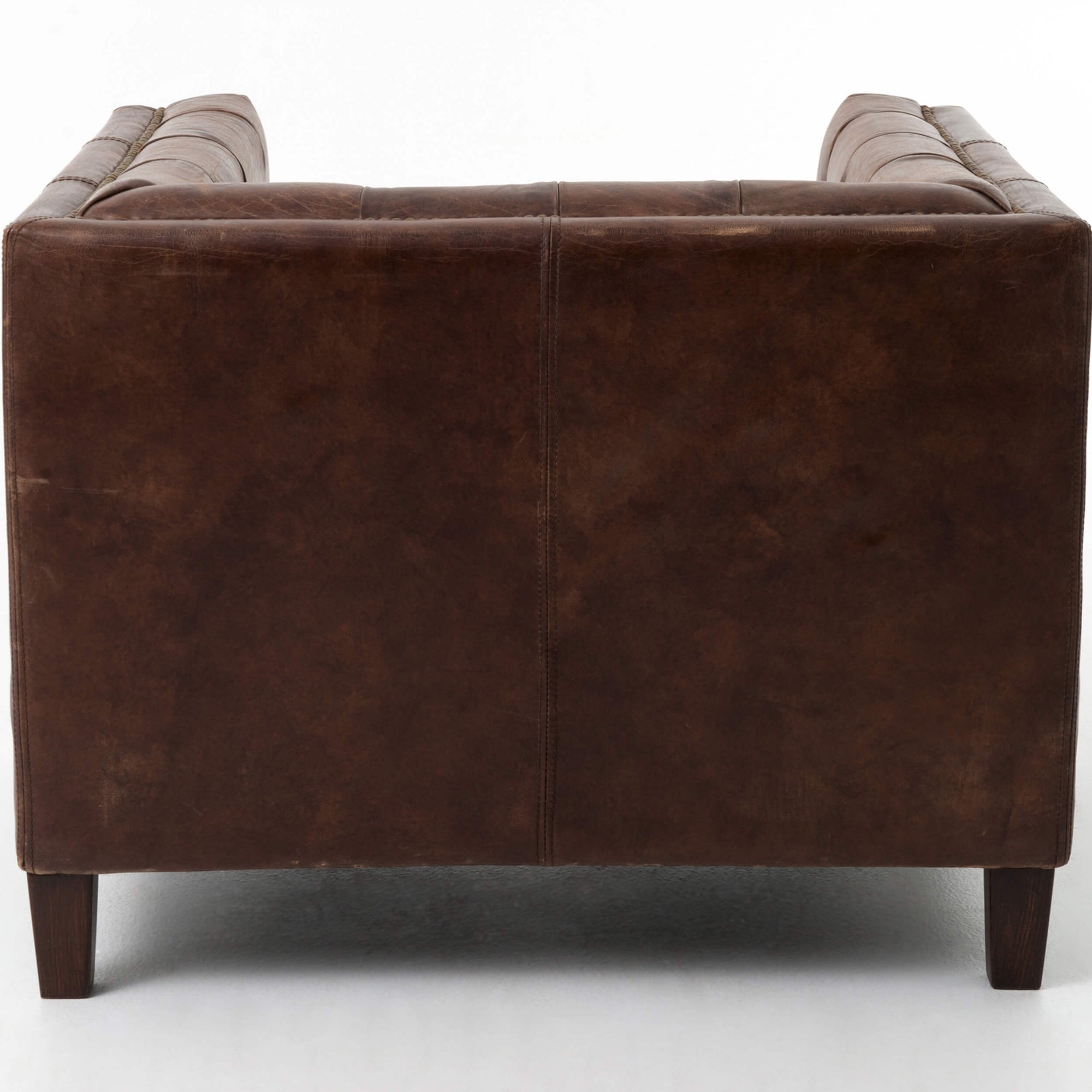 A staunchly traditional, English library-style club chair features perfectly distressed top-grain leather, with tufting for texture and brass nailhead trim for a modern touch.