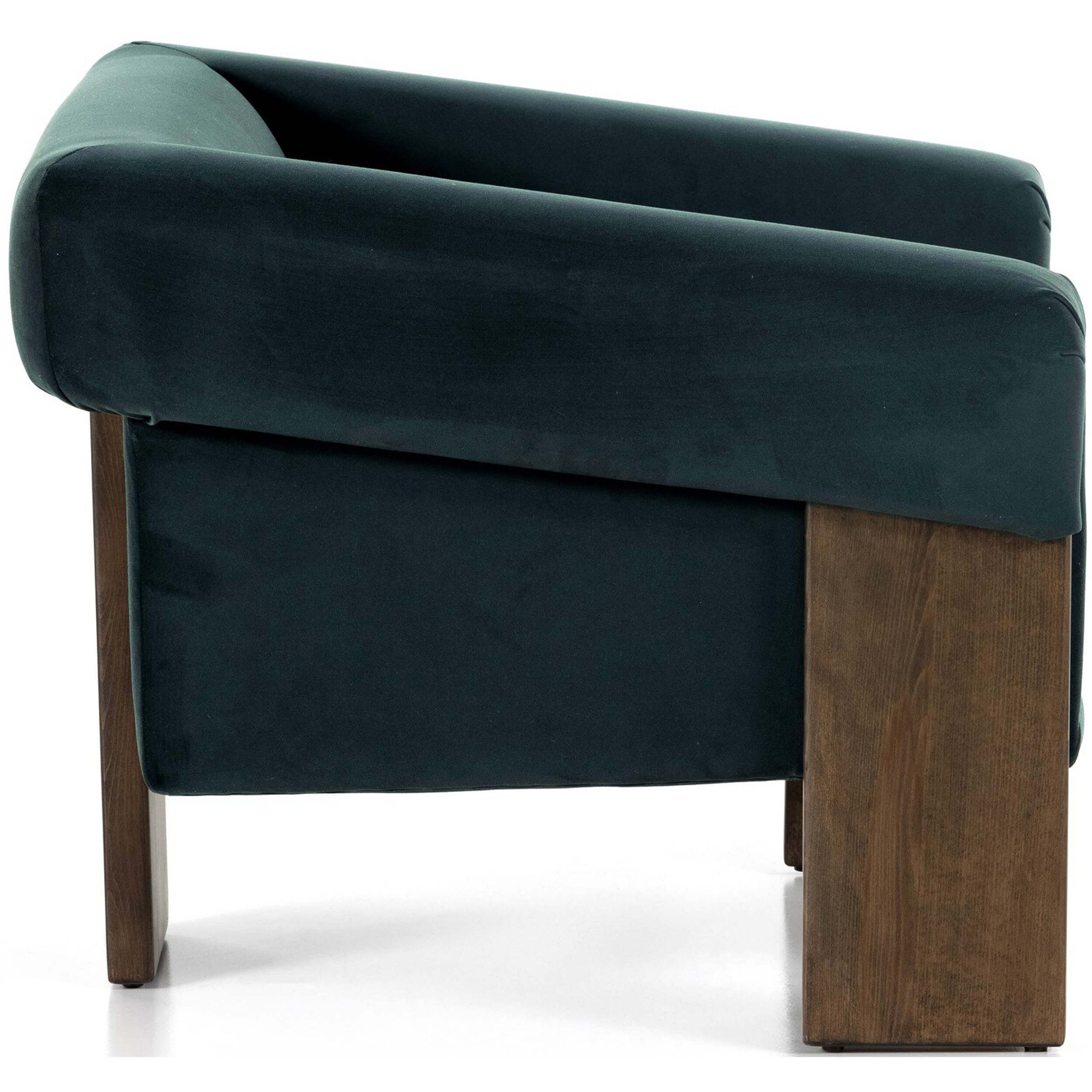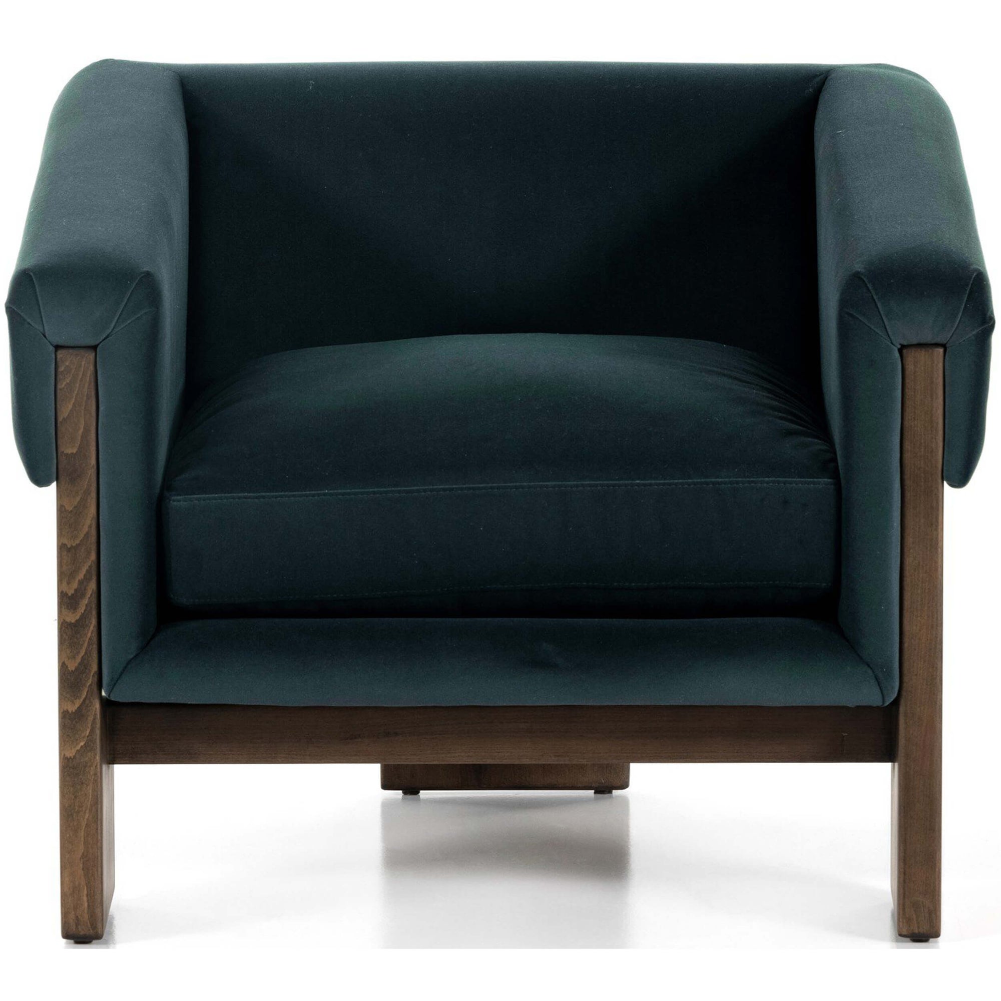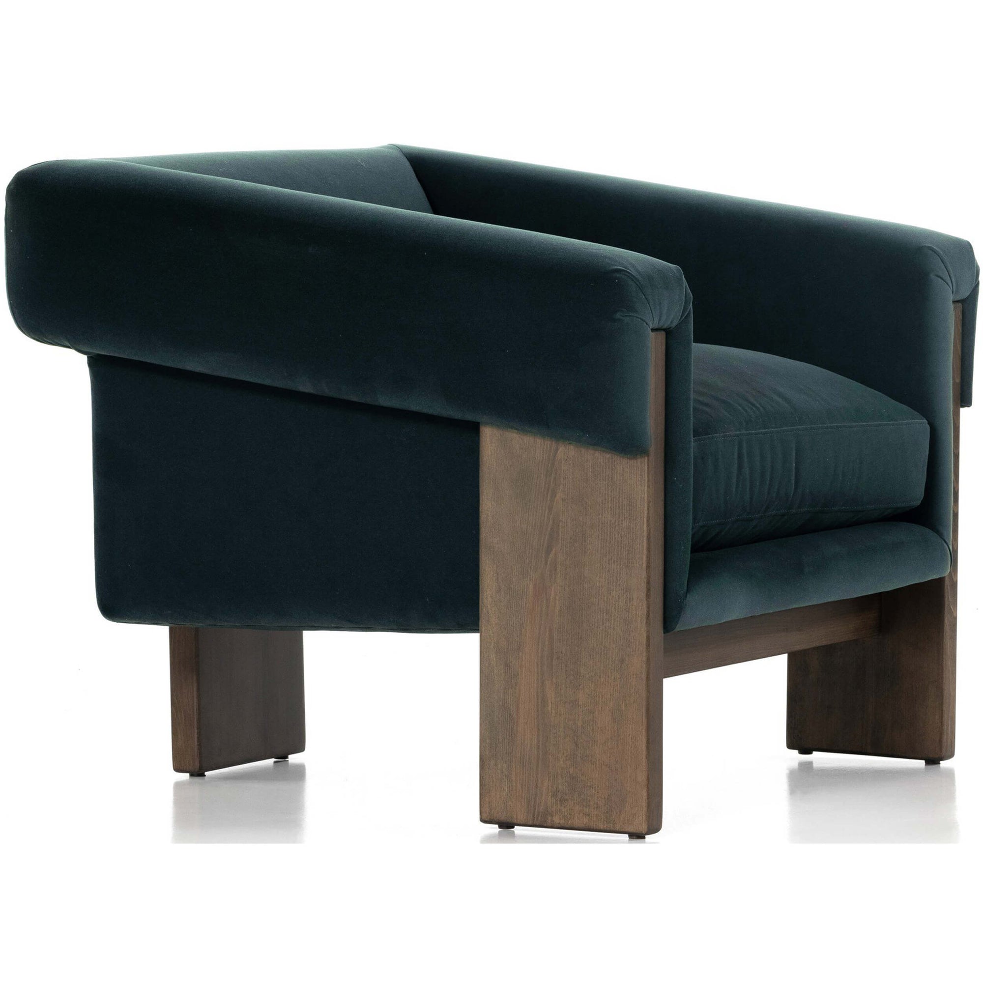 A striking silhouette that commands attention from all angles. Inspired by vintage Brazilian designs, wide plank legs form an architectural tripod and frame for a floating cushioned seat. Tight upholstered back with wraparound arms and a loose, plush seat cushion.