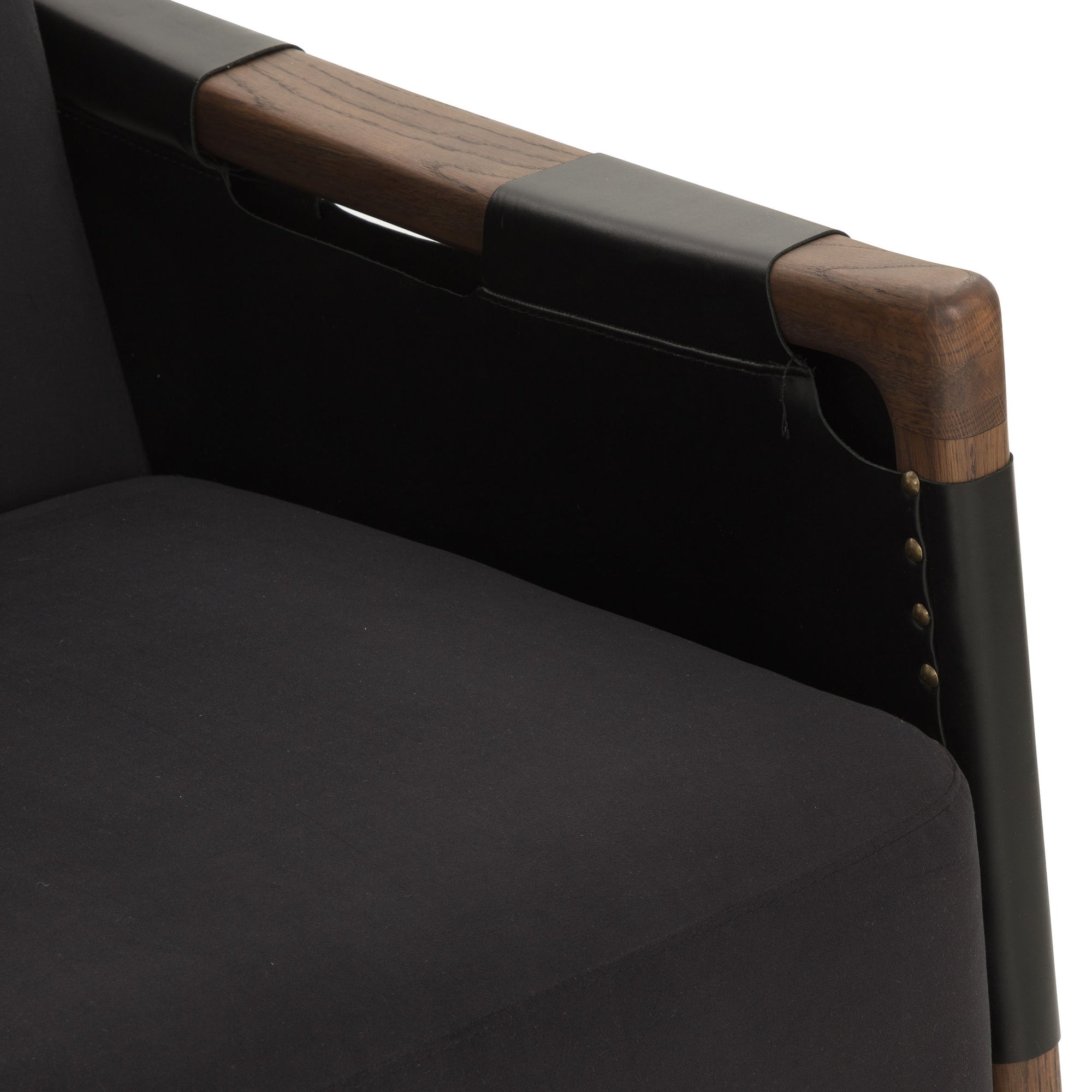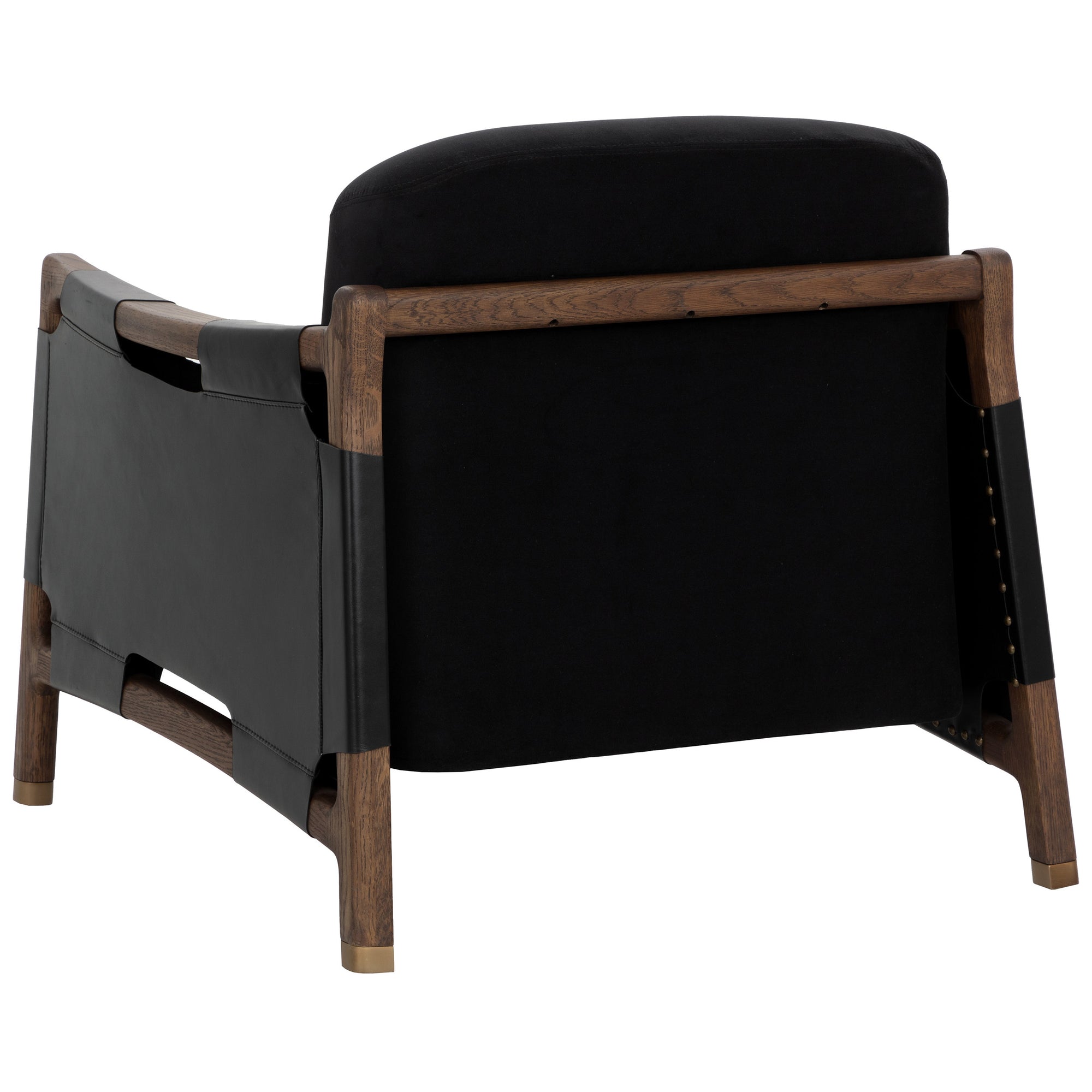 The Calloway Leather Chair combines a solid oak frame with smooth abbington fabric and Italian leather-wrapped arms for a blend of modern comfort and classic craftsmanship. Hand-applied nailhead accents and gold-capped feet add a refined touch, making it a standout lounge chair for living rooms or reading corners.
