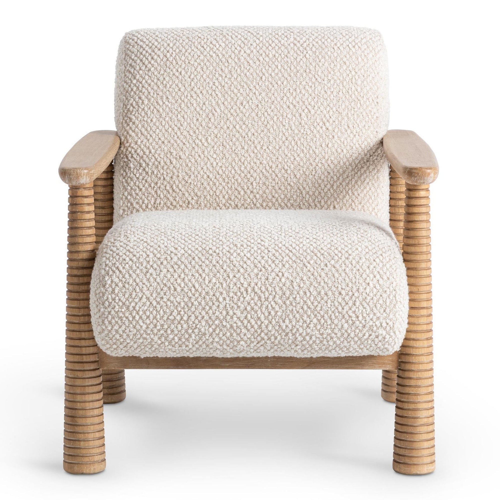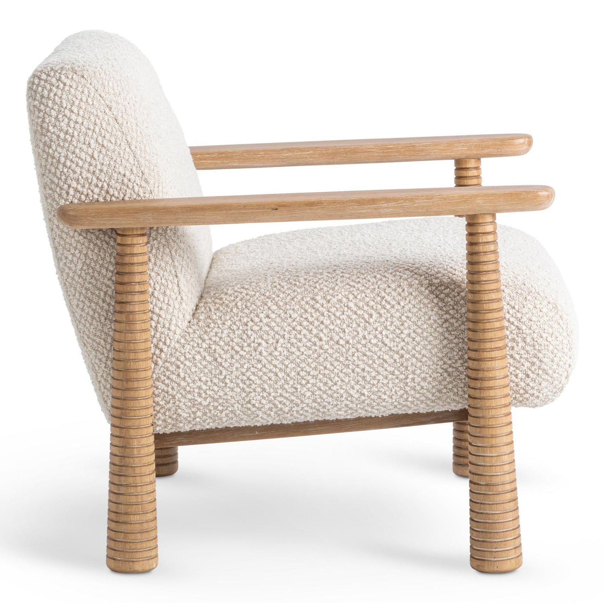 The Caprice Accent Chair brings texture and warmth to your space. Upholstered in a soft fabric blend, its cozy, boucle-like fabric invites you to sink in and relax. The sculpted wood frame with ribbed detailing adds an artisanal touch and timeless character. This chair blends modern comfort with organic charm, instantly elevating any interior.