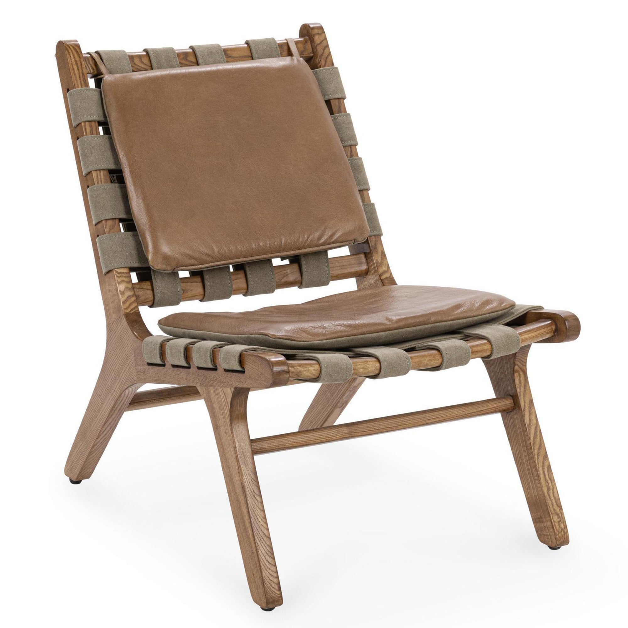 The Casen Leather Accent Chair blends craftsmanship with modern comfort. Featuring a solid ash wood frame, handwoven canvas straps, and plush top grain leather cushions, this chair offers a warm, organic feel that complements modern, rustic, or Scandinavian spaces. Its low-profile silhouette and natural materials create a timeless, relaxed look—perfect for living rooms, reading corners, or bedrooms.