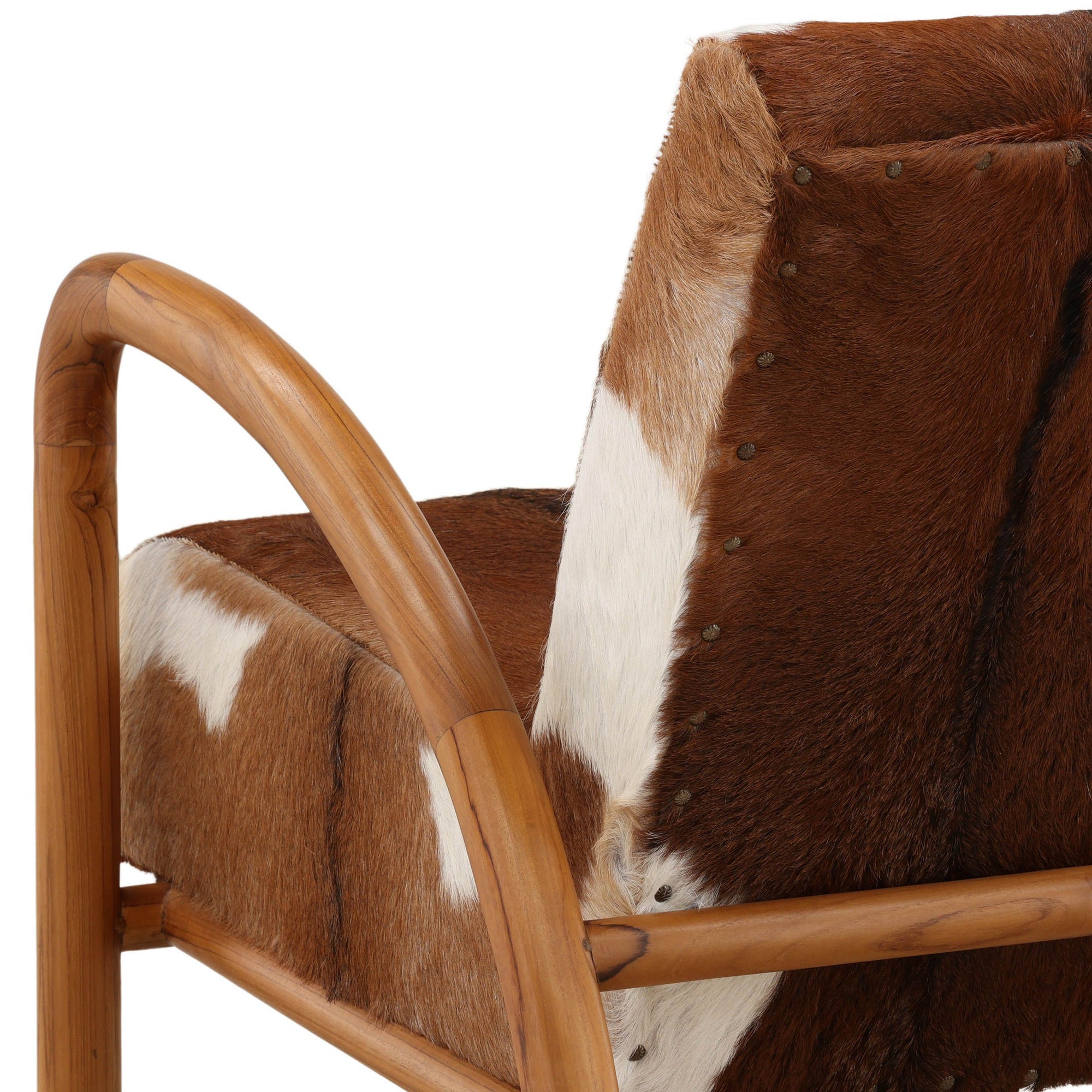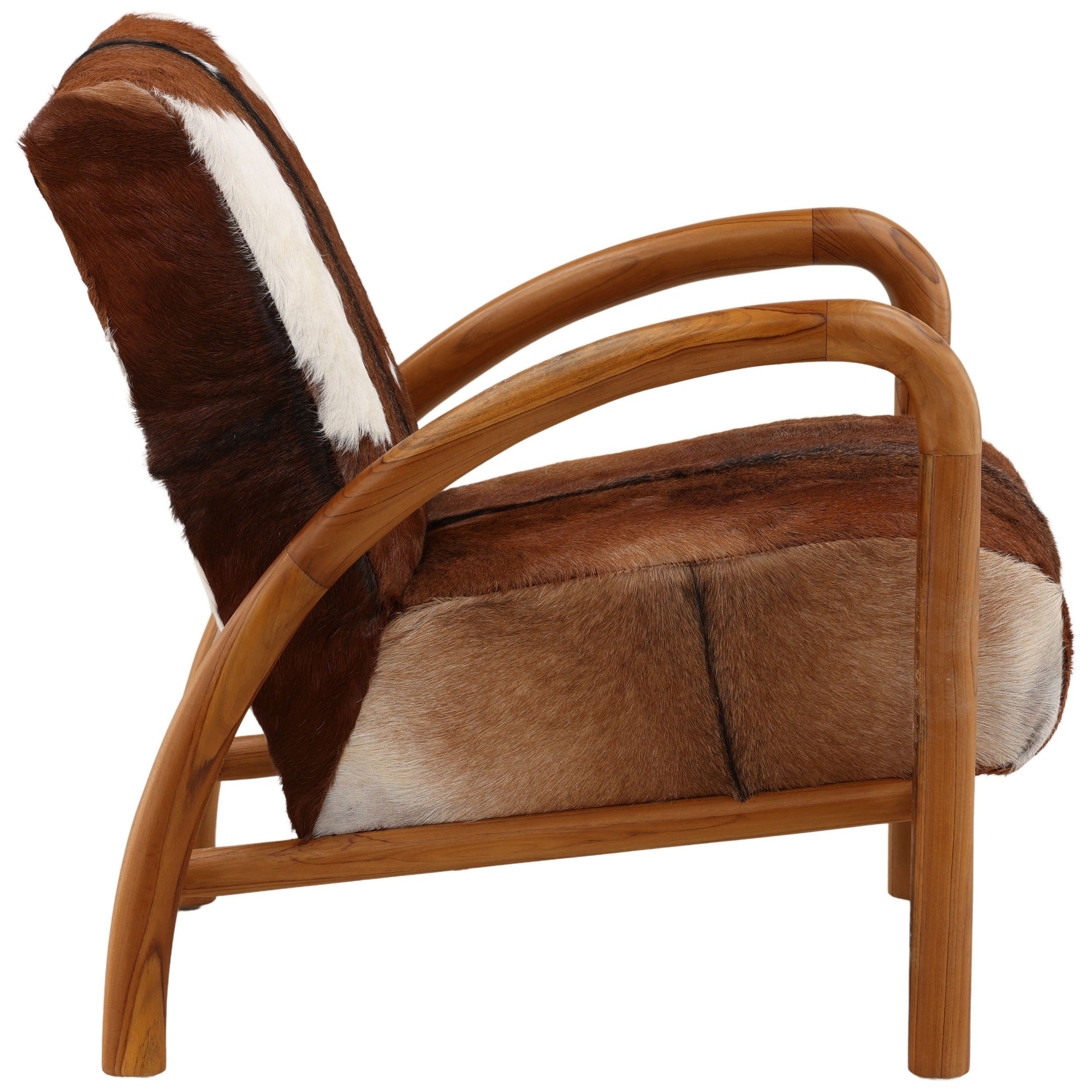 The Charlton Chair combines natural goat hide upholstery with a solid teak wood frame for a striking blend of texture and warmth. Its compact silhouette and organic materials make it a distinctive accent piece that adds character to any space.