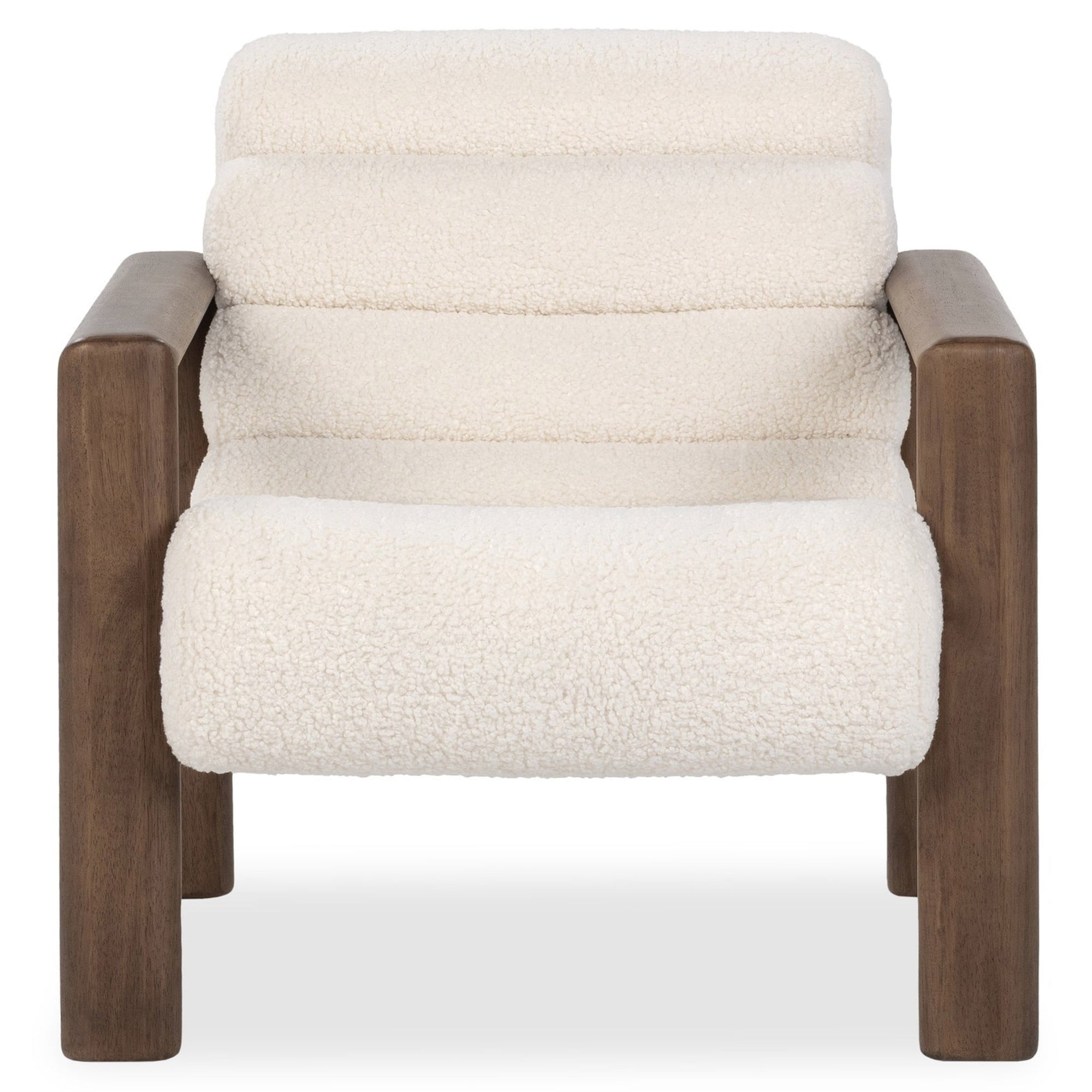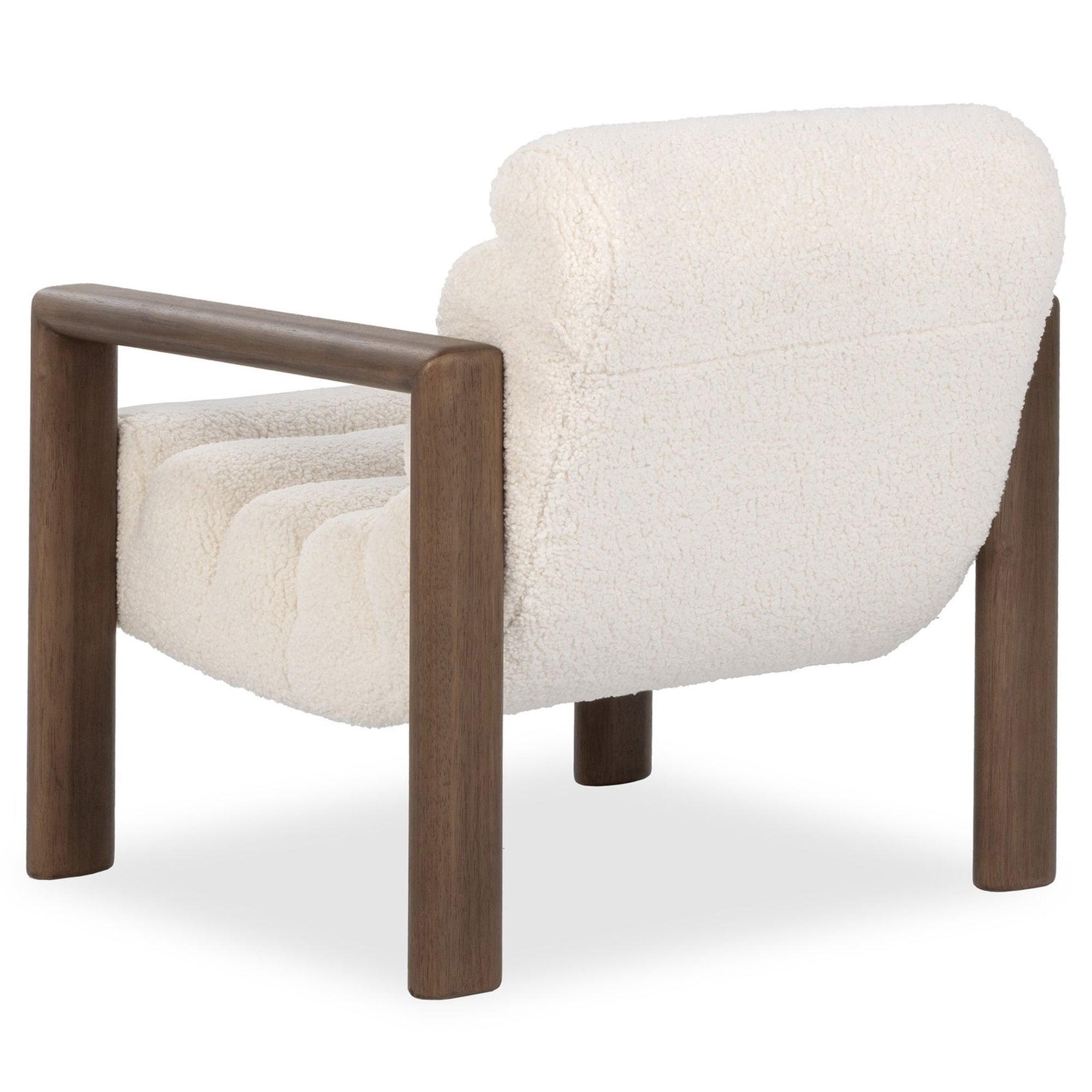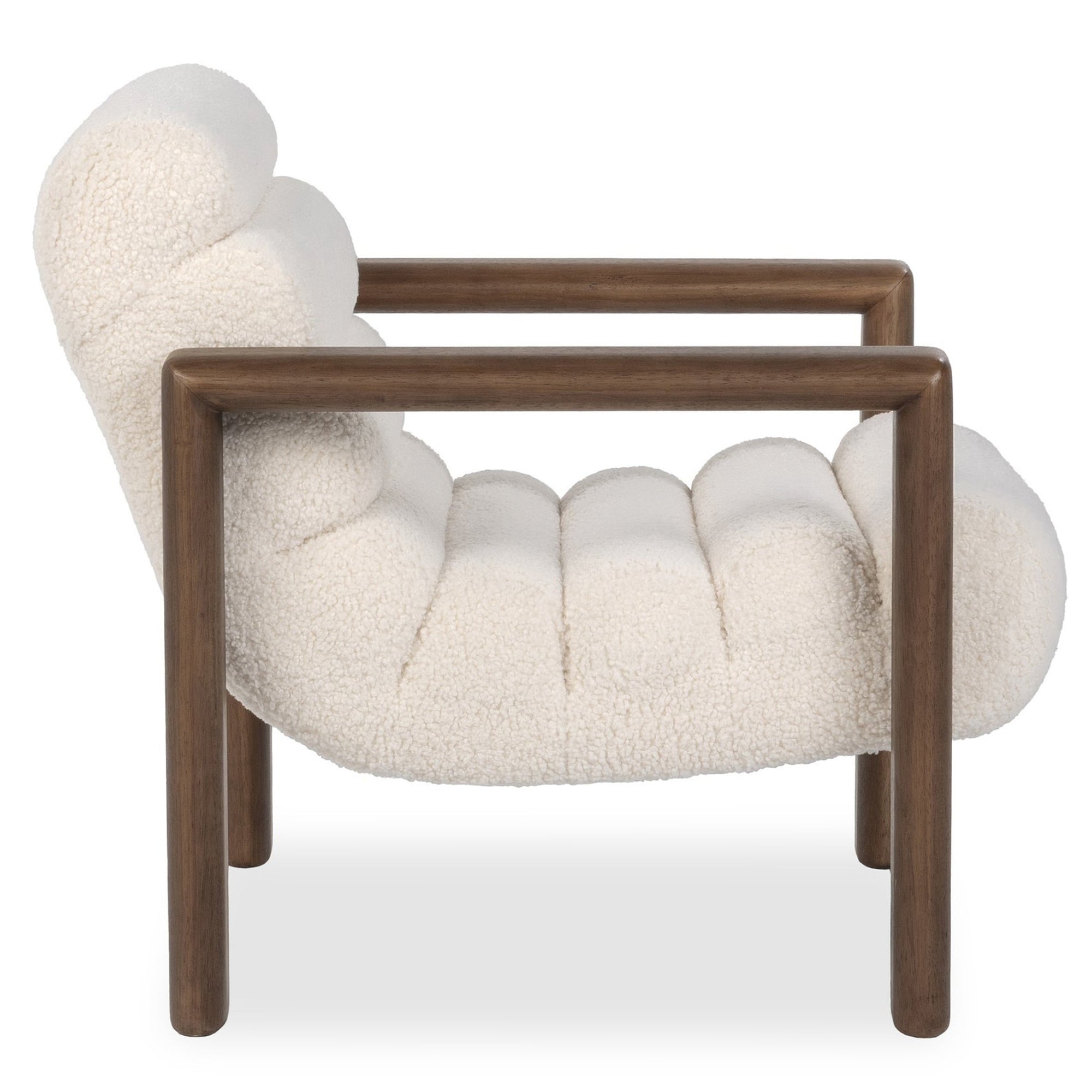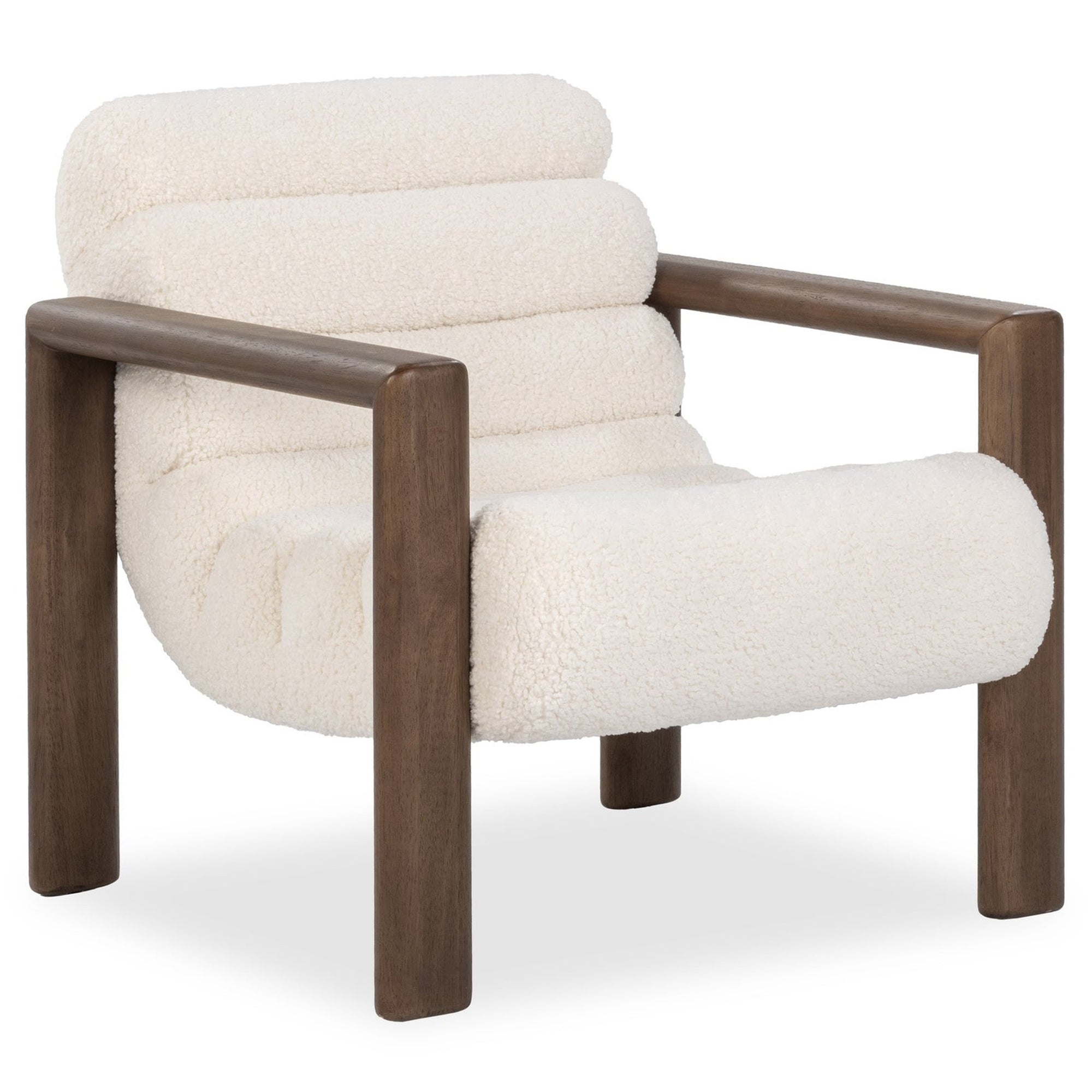 The Dahlia Accent Chair blends sculptural form with cozy texture. Upholstered in plush fabric, the channeled seat and back offer inviting comfort and visual depth. Sleek, rounded arms and legs crafted from solid wood bring natural warmth and durability. This chair delivers organic style with a bold, contemporary edge designed to elevate any space.