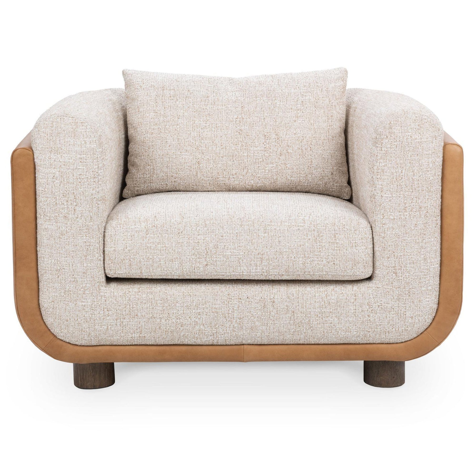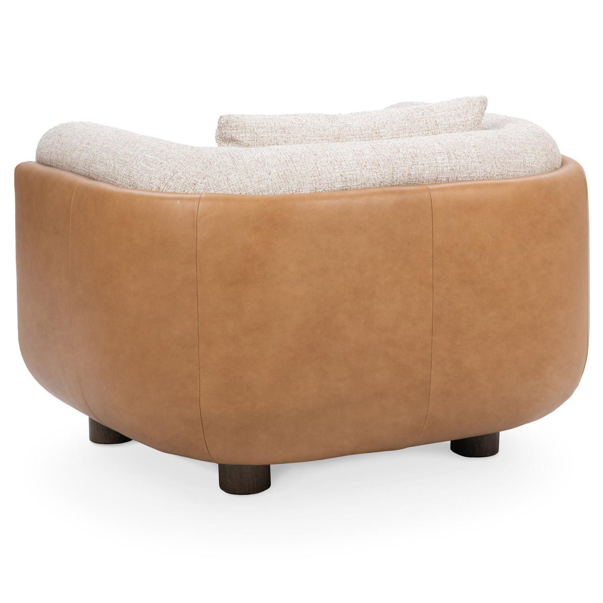 The Dania Accent Chair elevates your space with this modern barrel accent chair. Upholstered in soft fabric with luxurious leather side lining and a sturdy wood base, the rounded silhouette and plush cushion offer comfort and contemporary flair. This chair is perfect for stylish living rooms or reading nooks, blending texture and design.