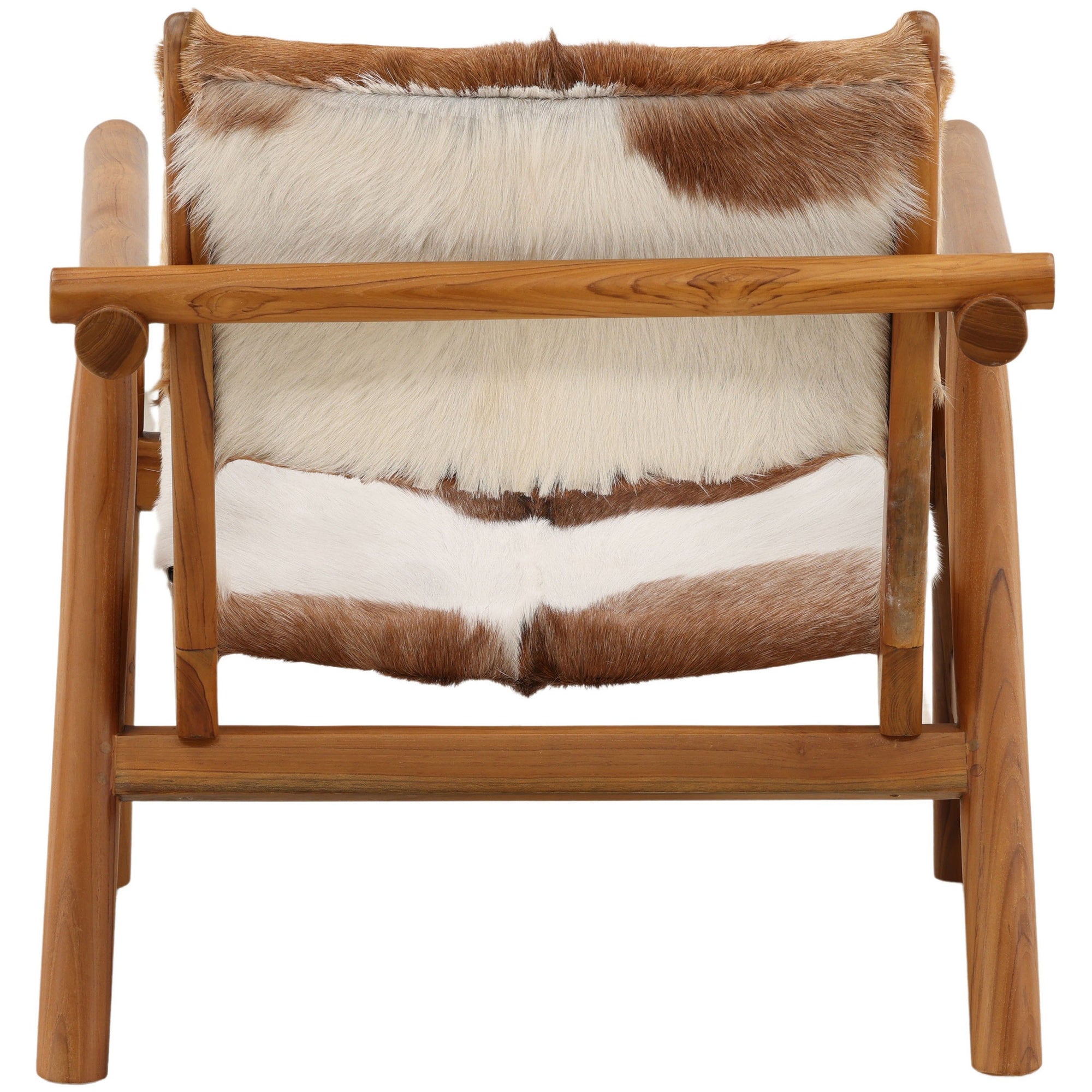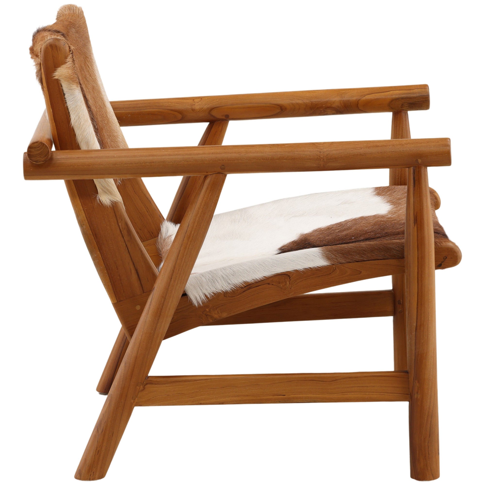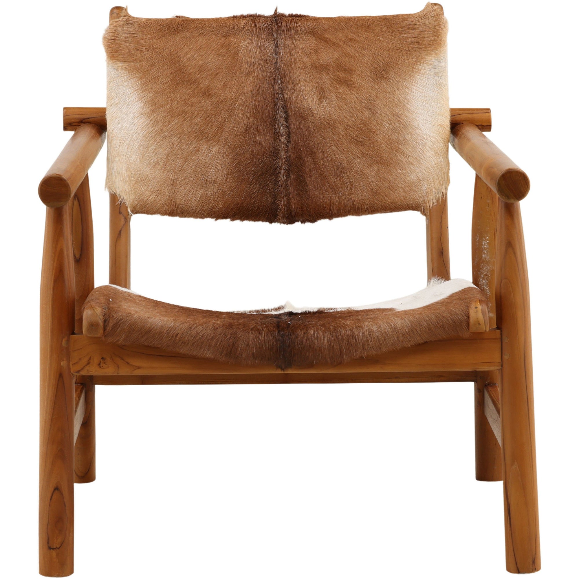 The Dunbar Chair blends natural goat hide upholstery with a solid teak wood frame for a refined yet organic look. Its compact, low-profile design makes it a versatile accent piece that brings warmth and texture to any space.