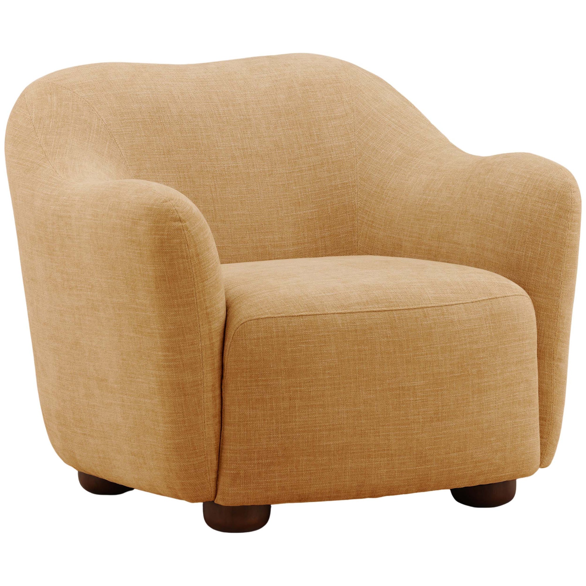 The Francesca Chair offers a perfect mix of texture and warmth. Wrapped in two-tone basketweave fabric with a dark brown rubber wood base, this chair features plush cushioning and a cozy silhouette. Its versatile design brings a sophisticated yet relaxed feel to any living space.