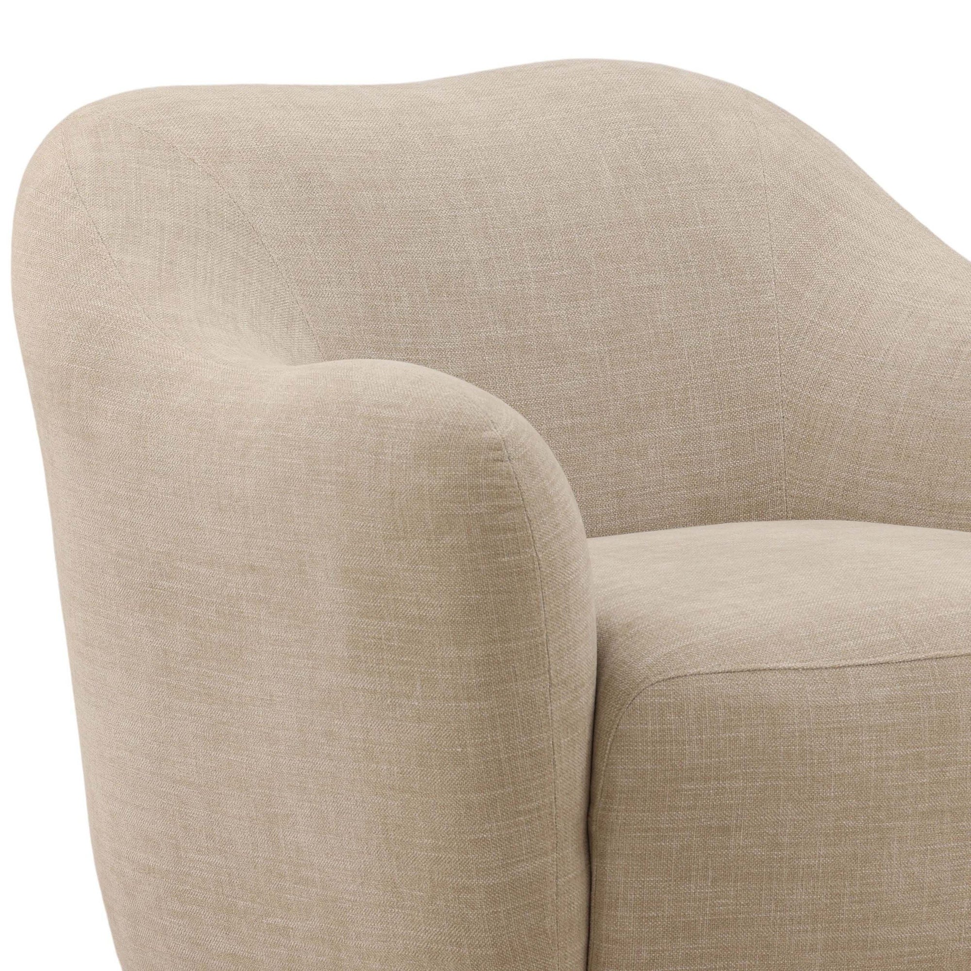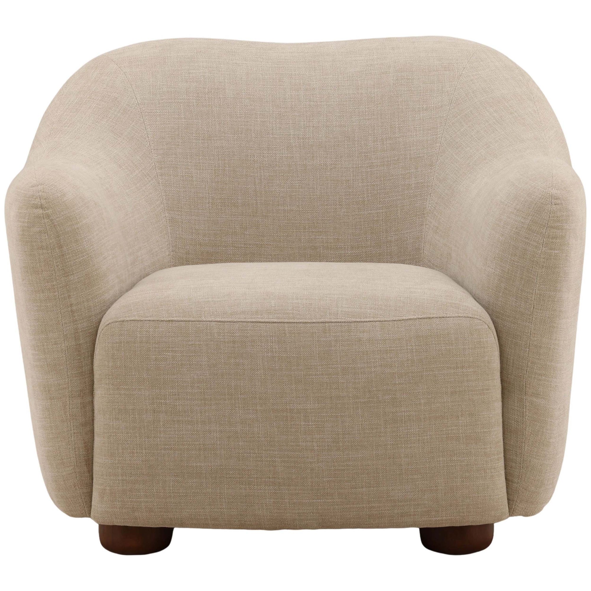 The Francesca Chair offers a perfect mix of texture and warmth. Wrapped in two-tone basketweave fabric with a dark brown rubber wood base, this chair features plush cushioning and a cozy silhouette. Its versatile design brings a sophisticated yet relaxed feel to any living space.