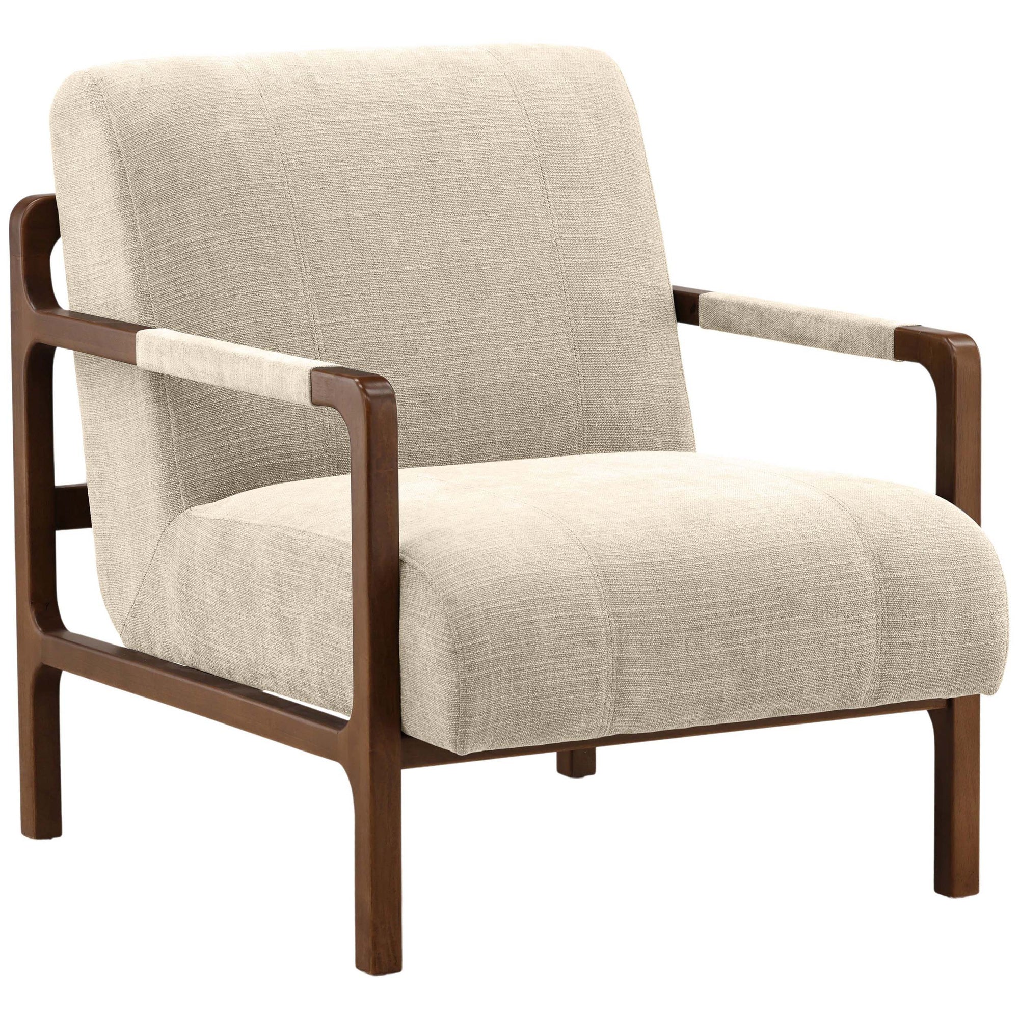 The Jordi Chair is a sleek, contemporary accent piece defined by its striking open wood frame and textural upholstery. It features a fully cushioned seat and back upholstered in a durable basketweave fabric. The frame extends to form the legs, while the arms are highlighted by a woven natural rope detail that provides an elegant, tactile contrast to the smooth wood. The Jordi Chair offers comfortable seating with a chic, mixed-material design.