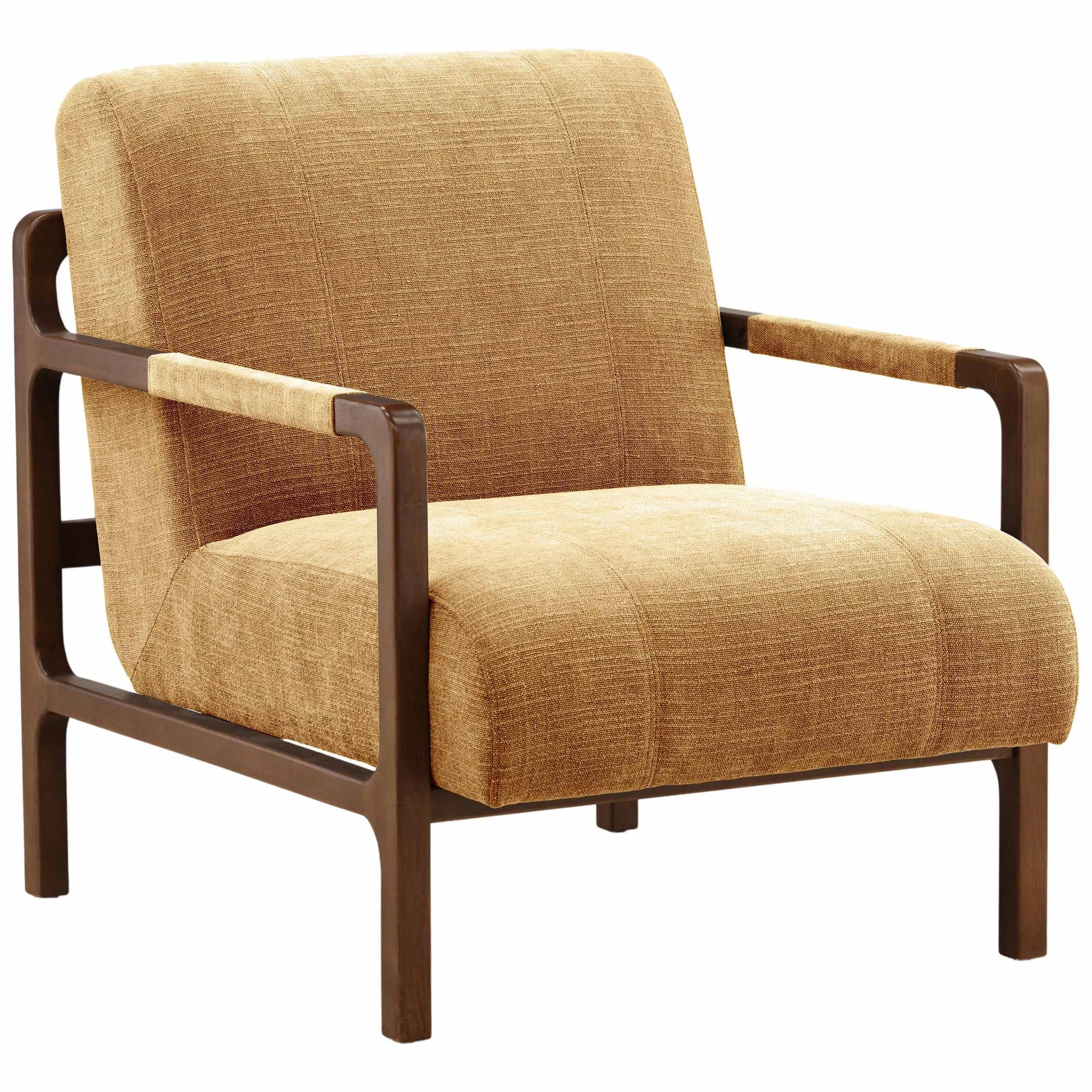 The Jordi Chair is a sleek, contemporary accent piece defined by its striking open wood frame and textural upholstery. It features a fully cushioned seat and back upholstered in a durable basketweave fabric. The frame extends to form the legs, while the arms are highlighted by a woven natural rope detail that provides an elegant, tactile contrast to the smooth wood. The Jordi Chair offers comfortable seating with a chic, mixed-material design.