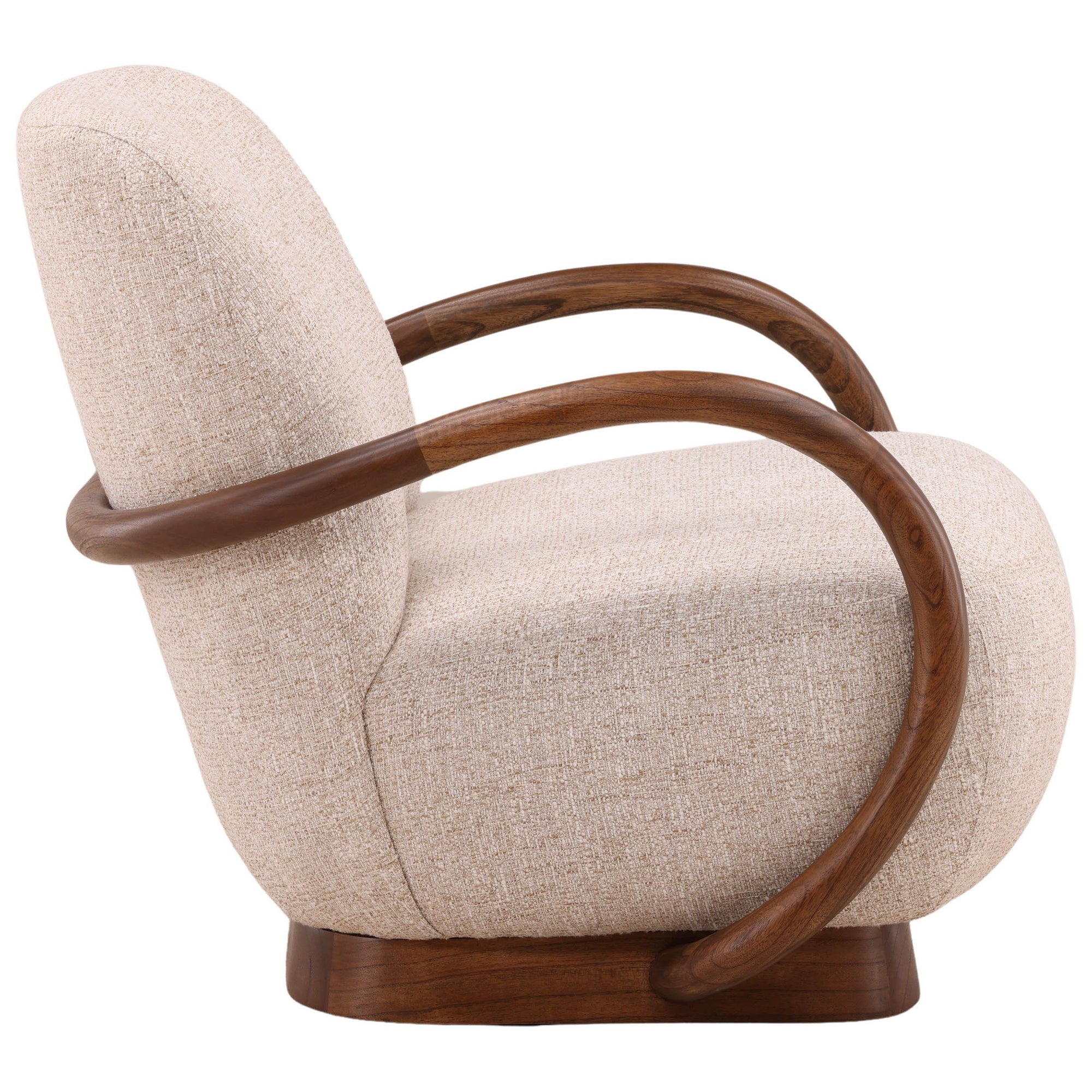 The Linfield Chair combines mid-century charm with modern comfort. Upholstered in soft tweed fabric and supported by a solid Mindi wood frame, this chair offers a refined yet relaxed look. Its deep seat and gently sloped arms provide inviting comfort, perfect for living rooms or reading corners.