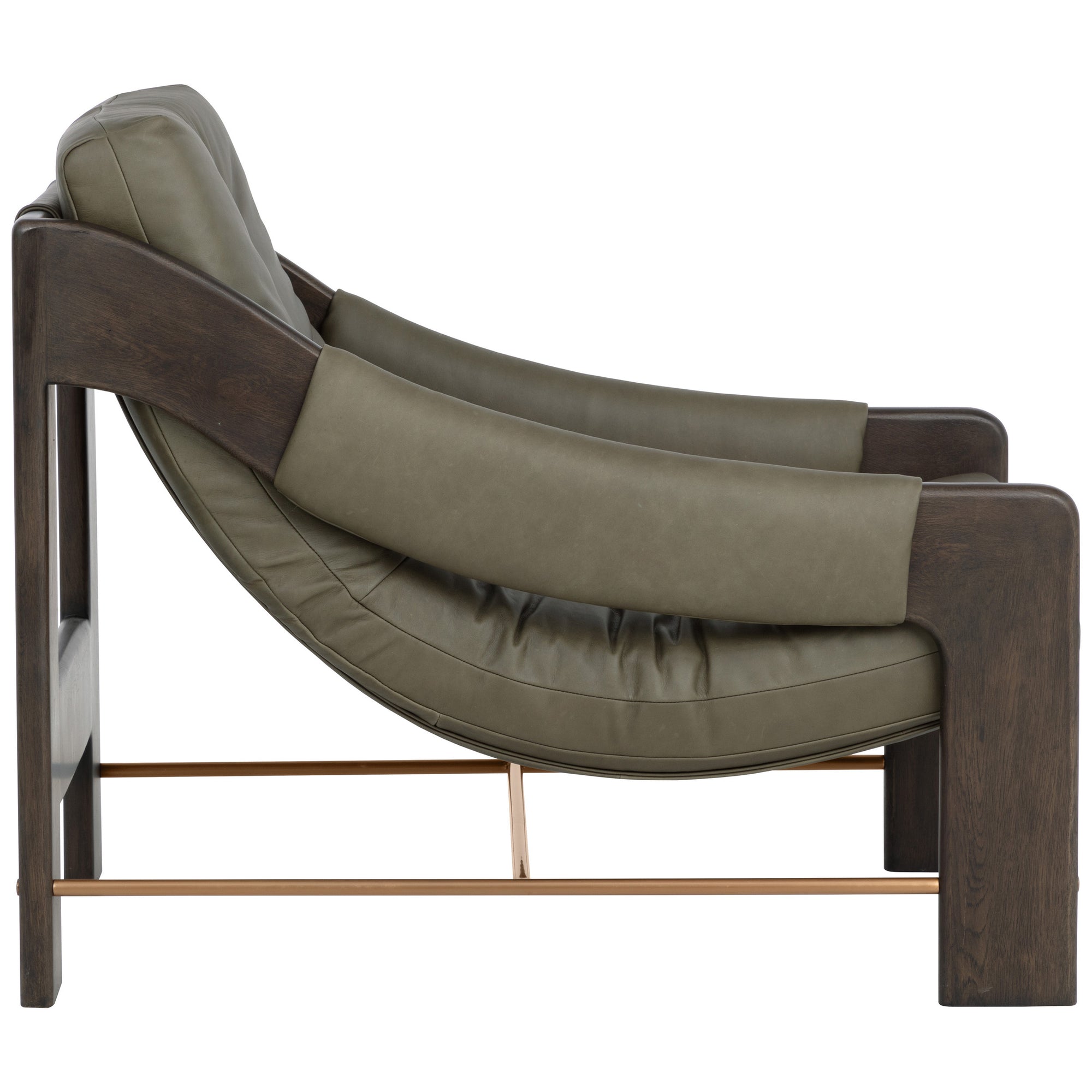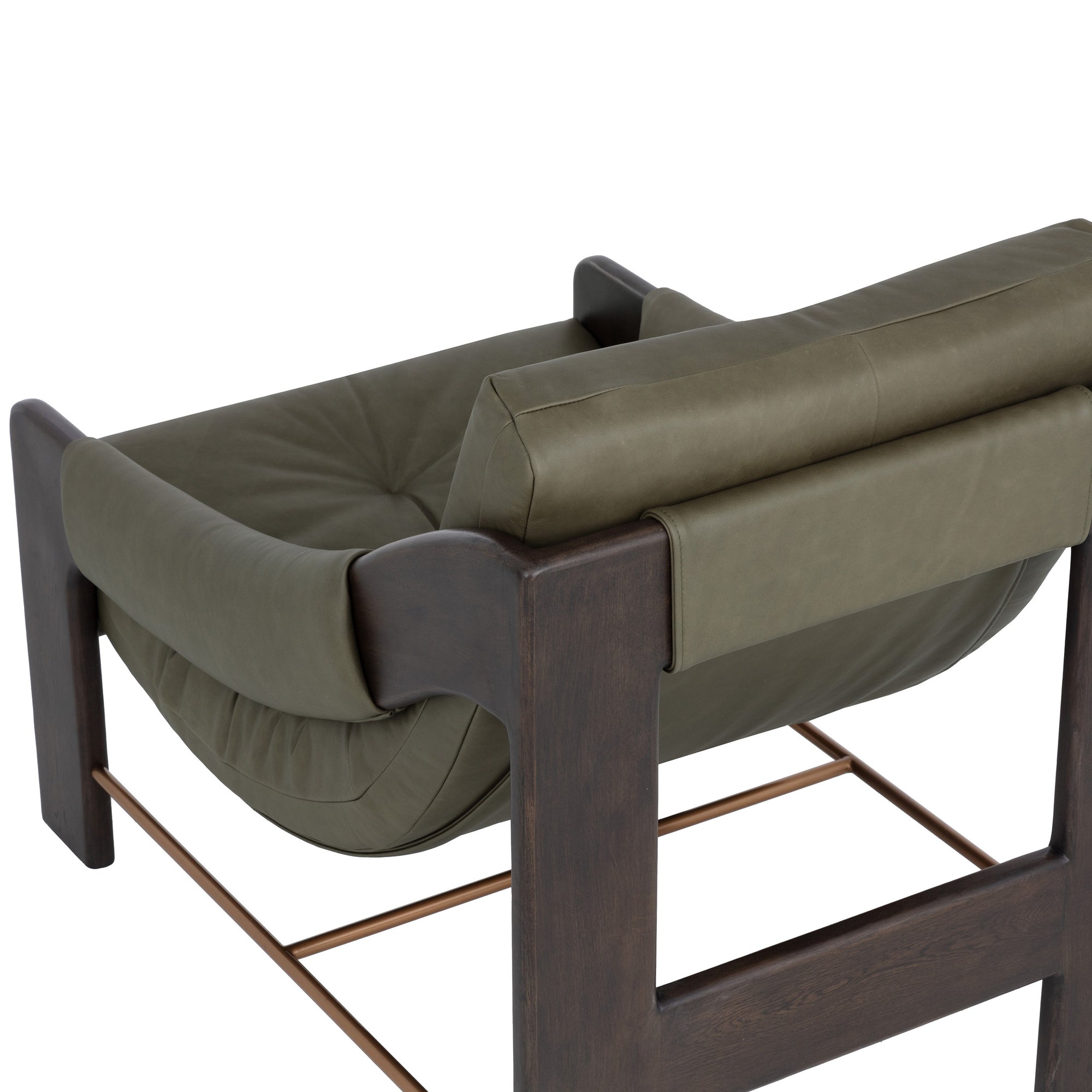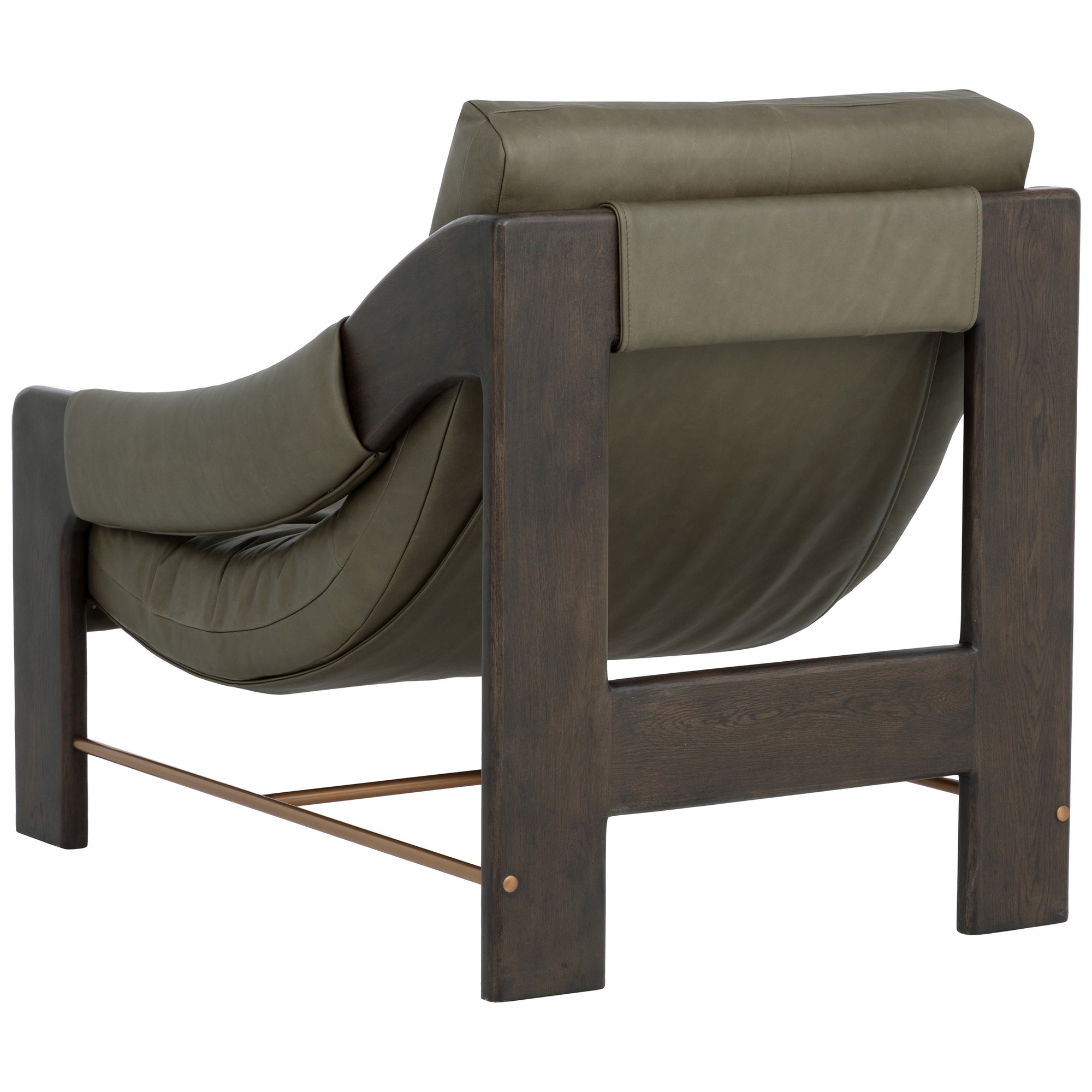 The Rafferty Leather Chair is thoughtfully designed for relaxed lounging, featuring a reclined sling-style seat with gentle tufting that contours to the body. Upholstered in top-grain leather, the seat and back offer a soft, supportive feel, while a solid oak wood frame brings warmth and structure. Subtle metal stretchers add visual balance, making the Rafferty Leather Chair a refined accent for reading corners, living spaces, or bedrooms.
