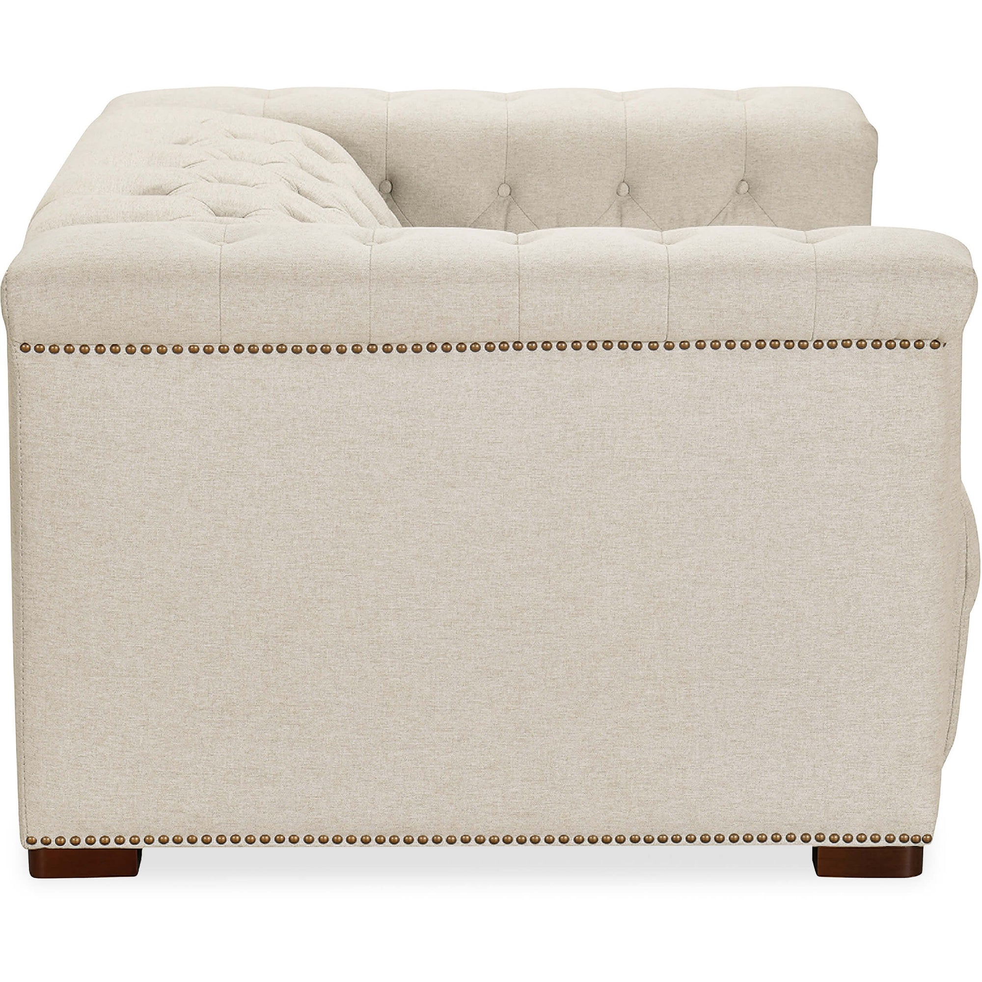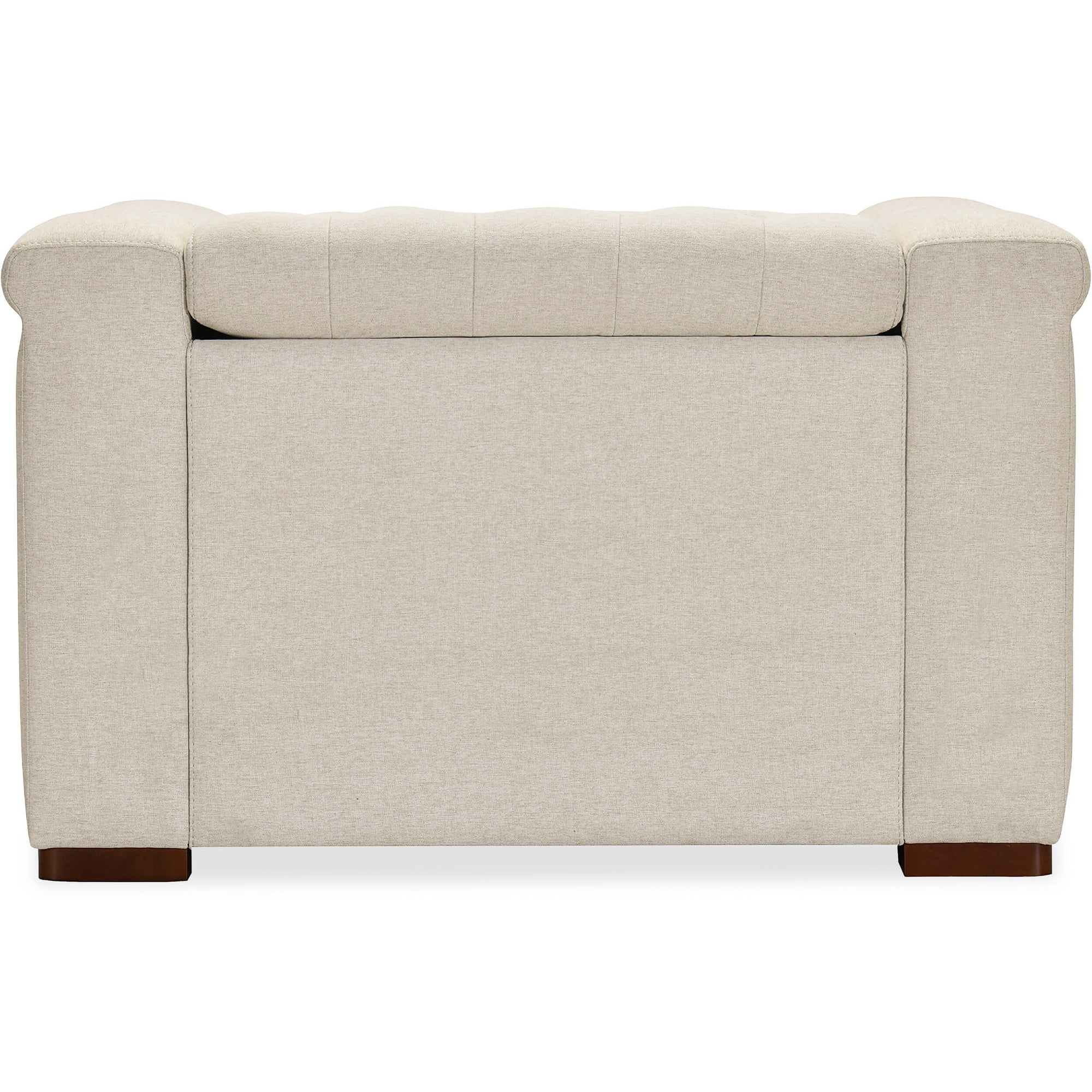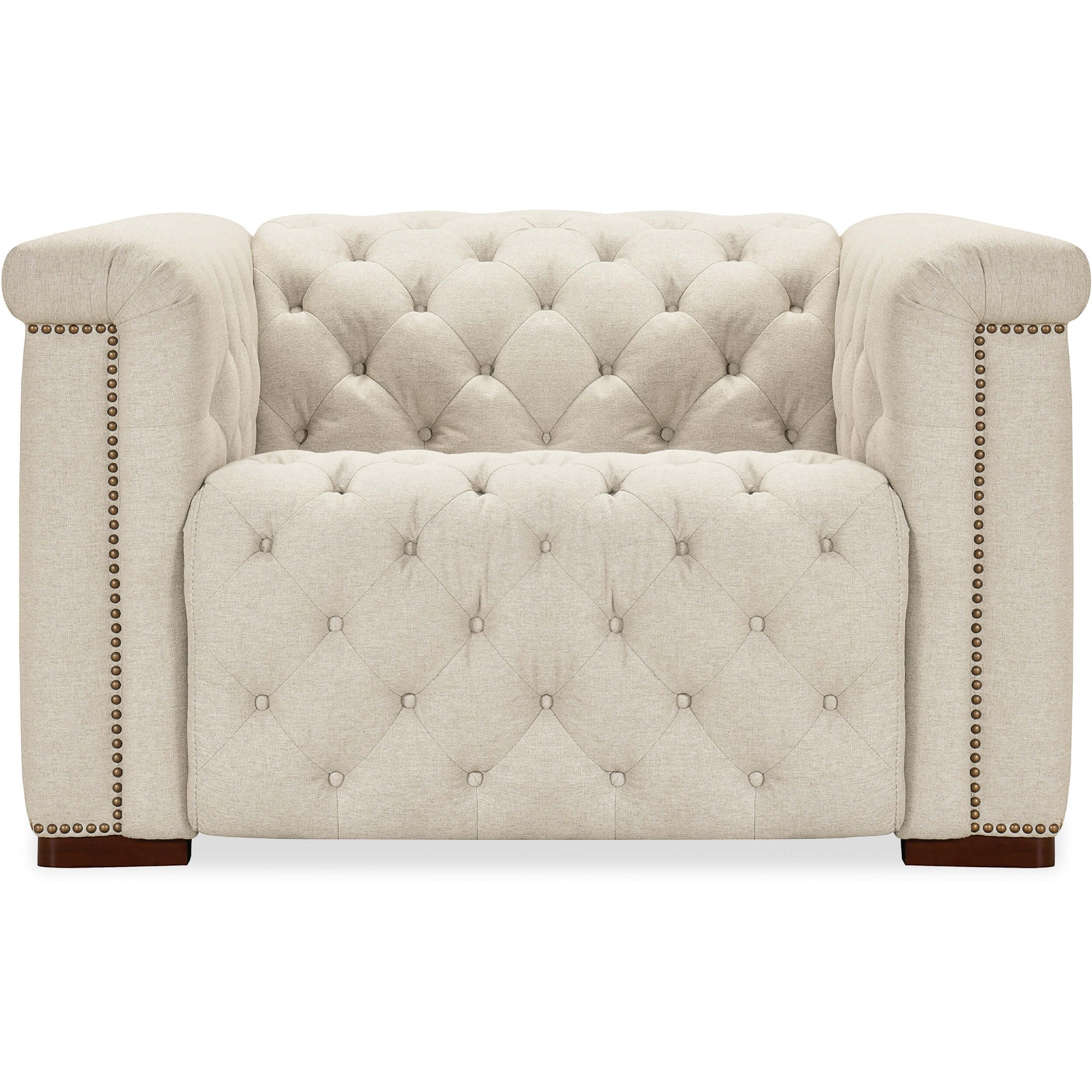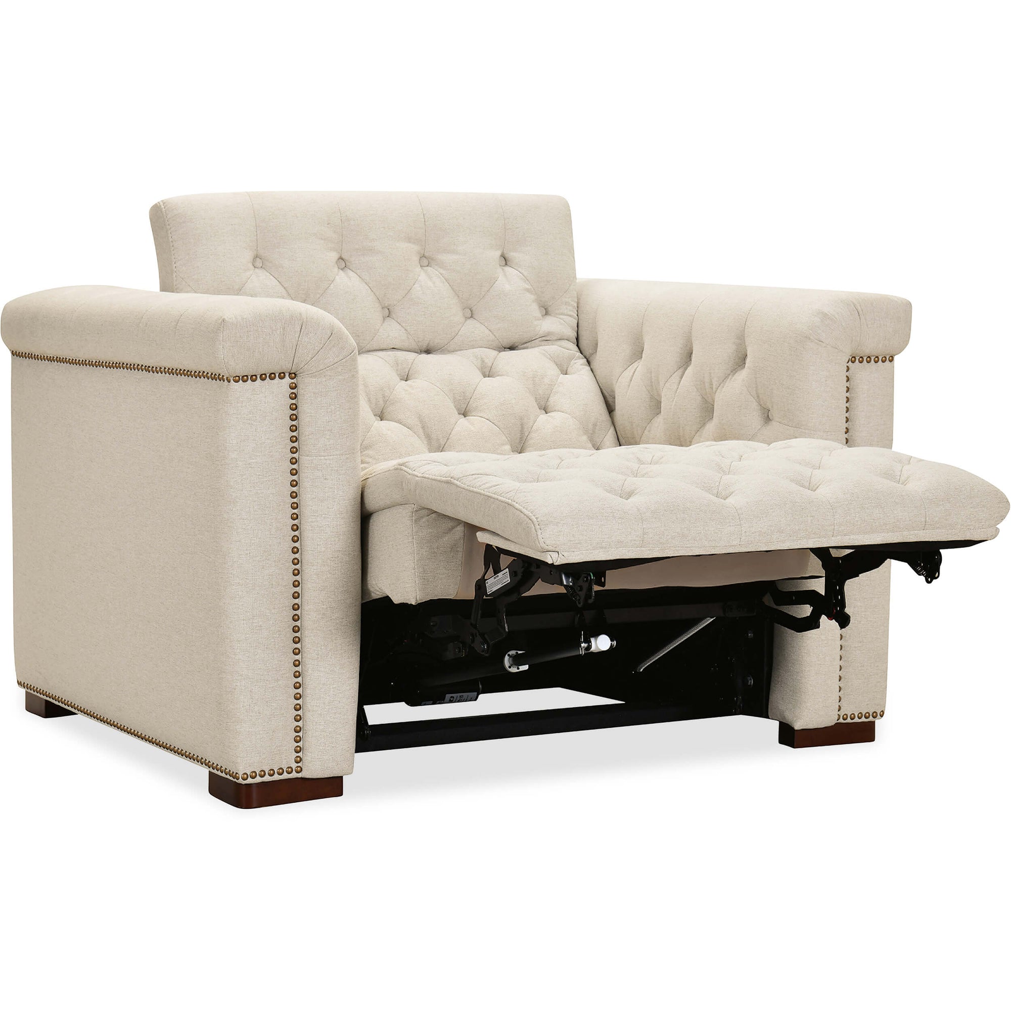 The Savion Power Motion Chair blends comfort and elegance with a power headrest and reclining mechanism. Upholstered in durable Aries Beach performance fabric, it features classic chesterfield tufting and copper-toned nail trim. The dark wood finish enhances its sophisticated look, while high-density foam cushions provide exceptional comfort. The discreet reclining function ensures modern convenience without sacrificing style, making this chair a perfect addition to any living space.
