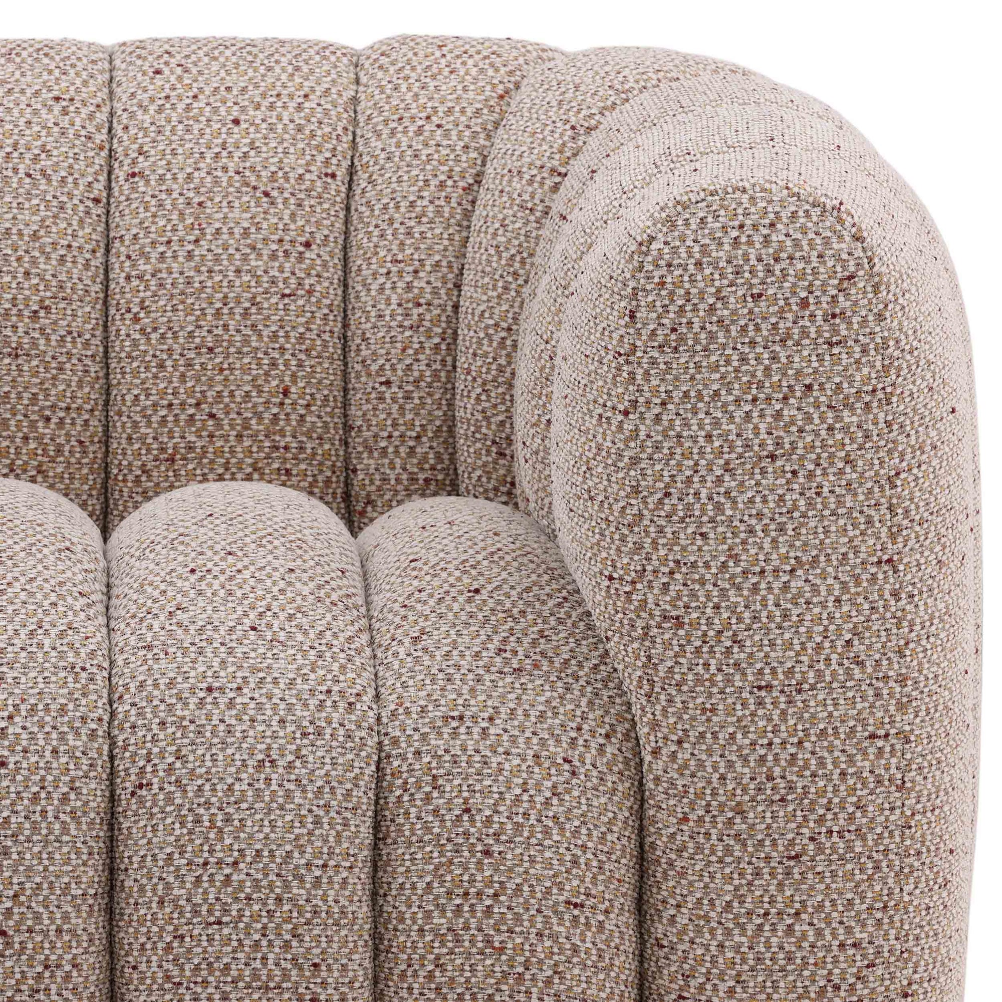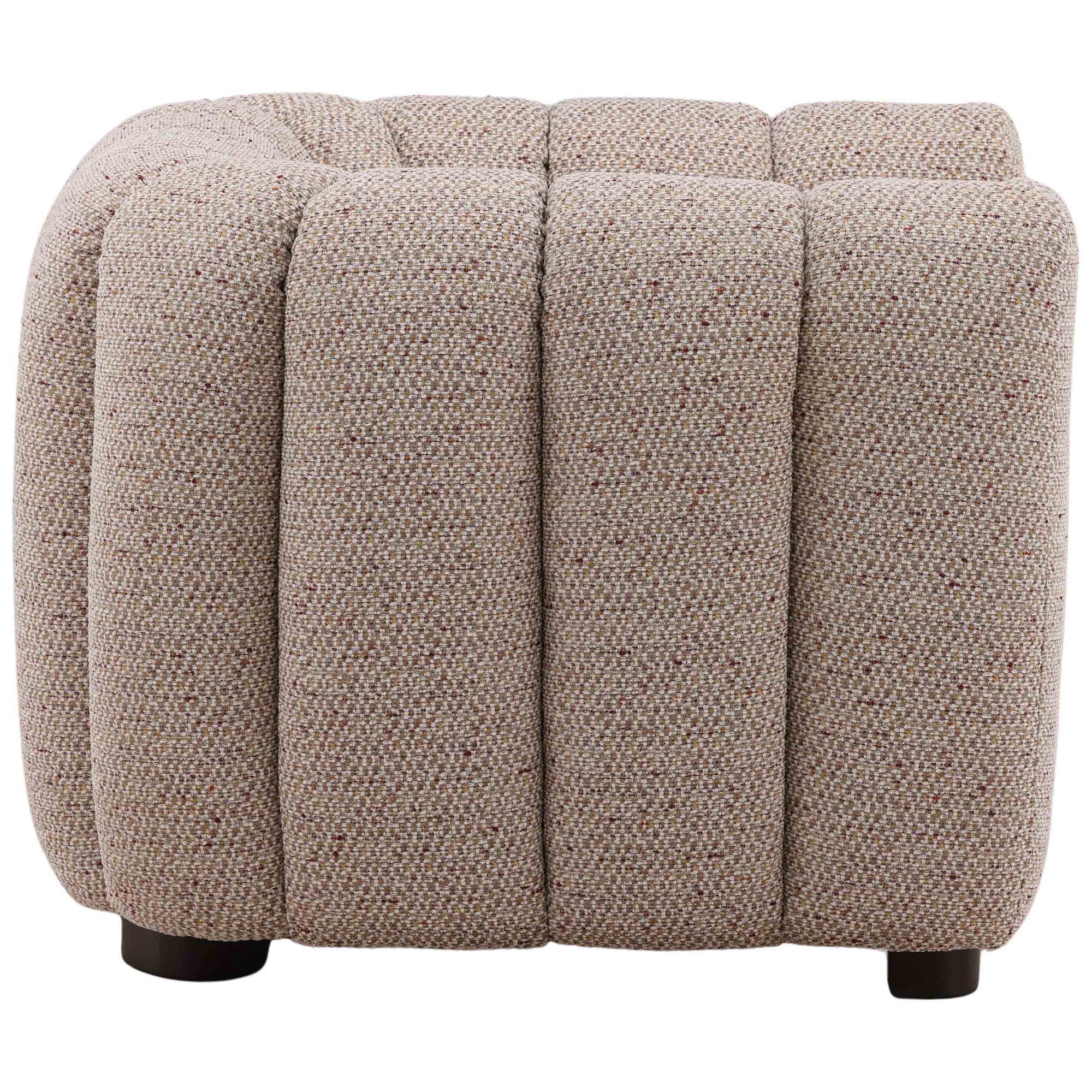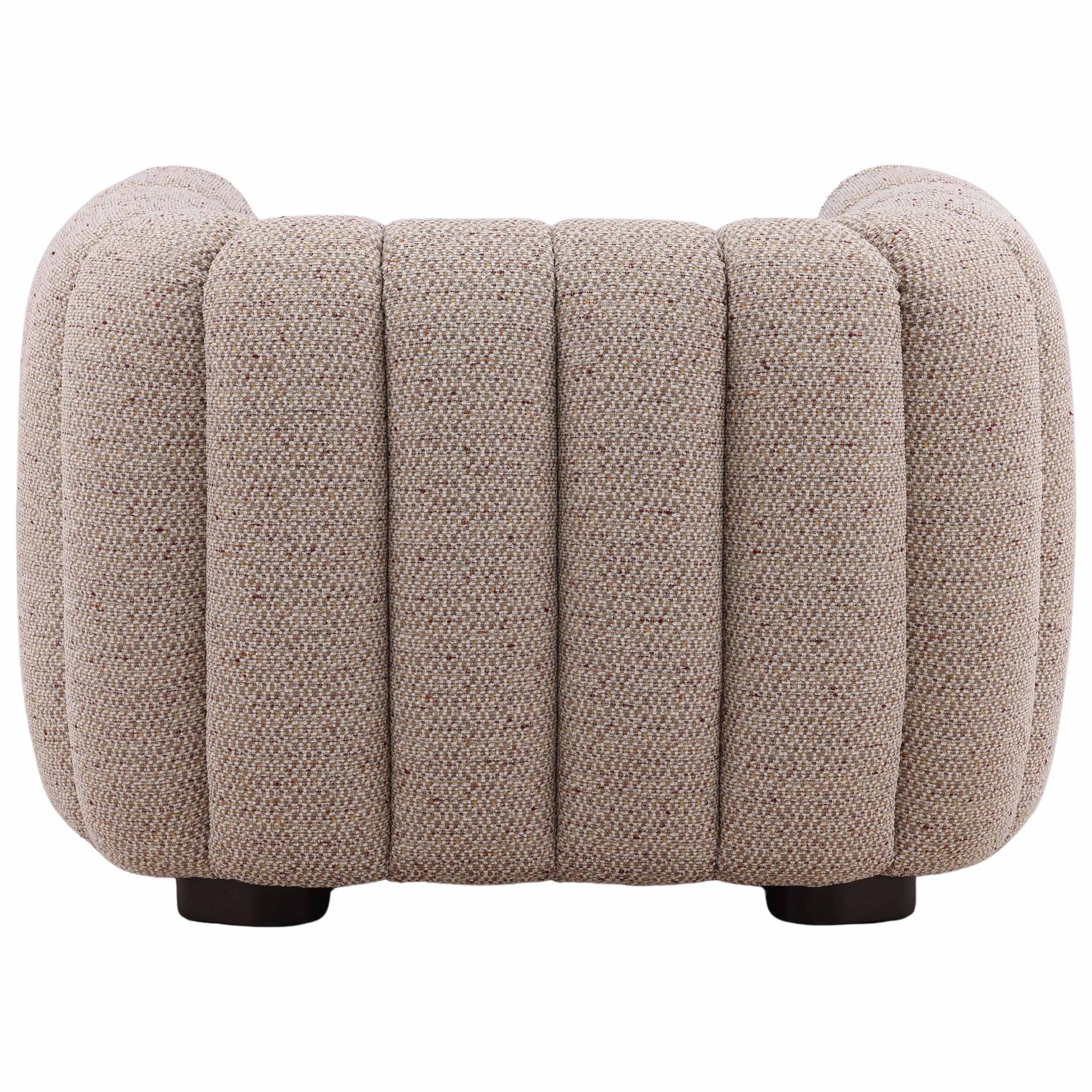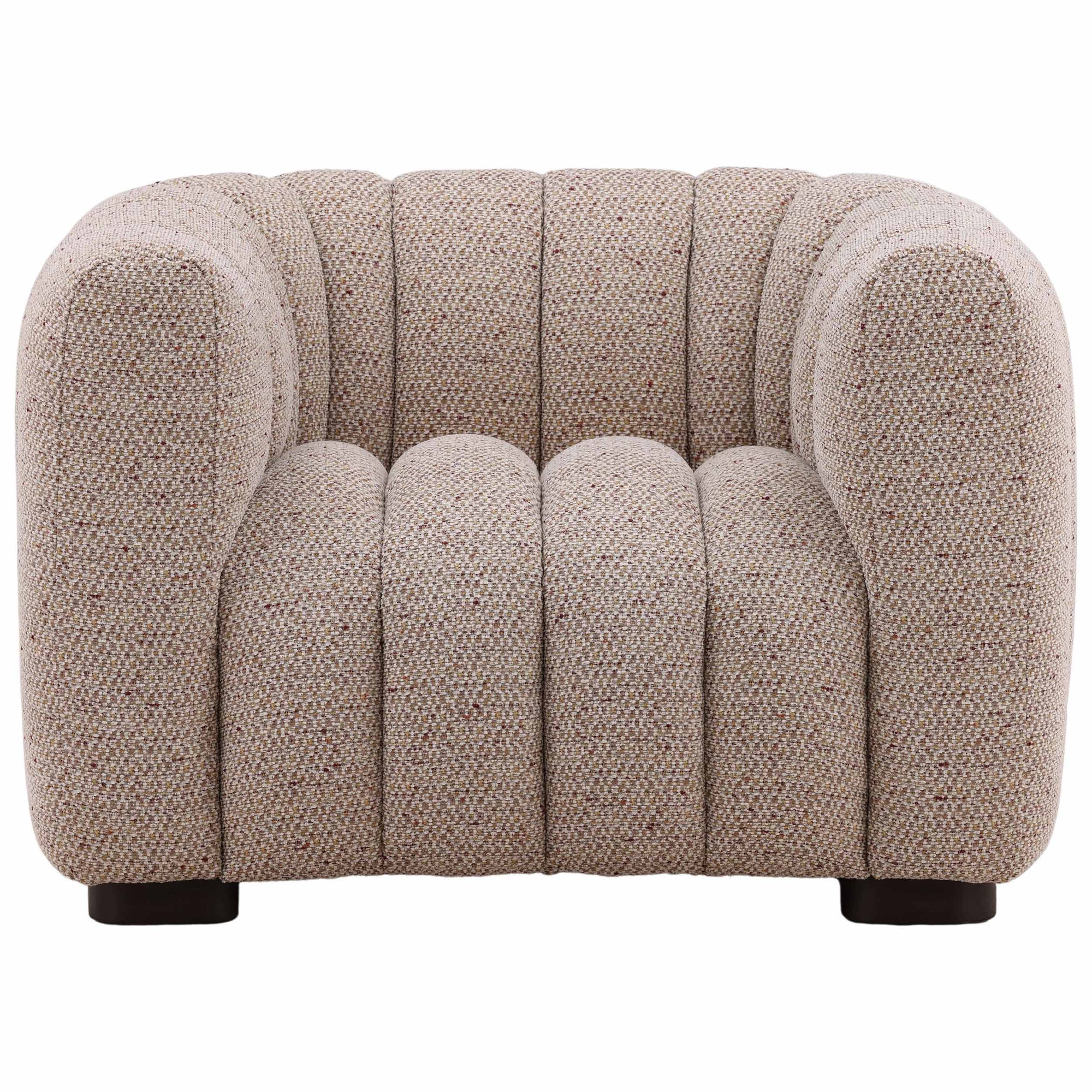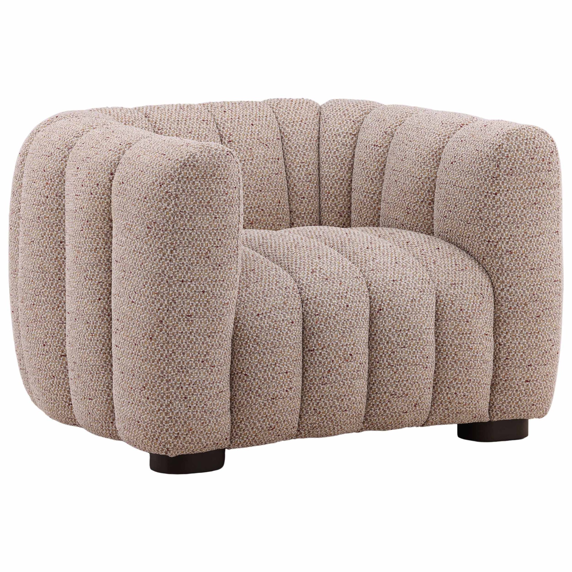 The Zakaria Chair is a statement accent piece with a comfortable, deep-seated design and a modern, rounded silhouette. Upholstered in a plush, plain woven chenille fabric, the chair is defined by distinct vertical channeling that runs across the arms and back. Its low profile and bold, rounded shape make the Zakaria Chair an inviting and sculptural addition to any living space.