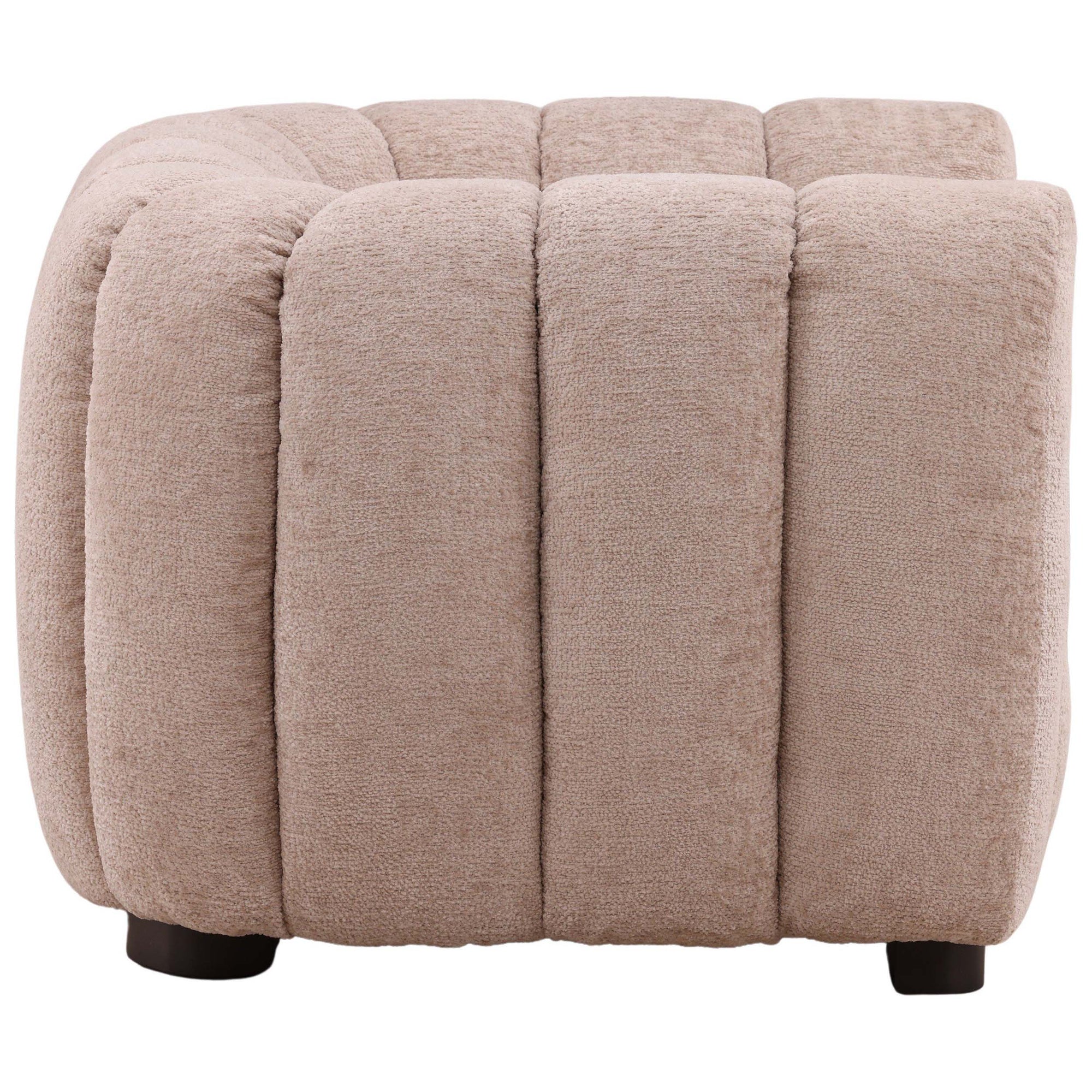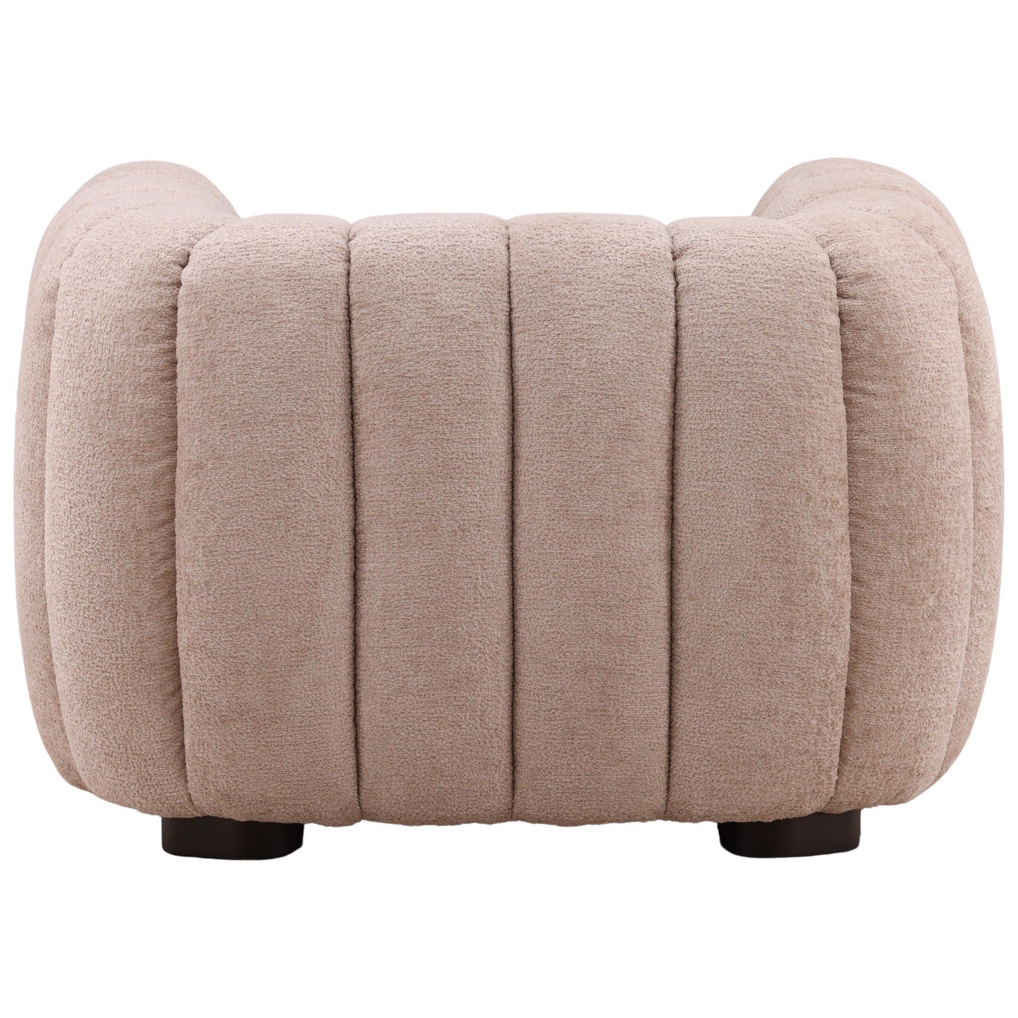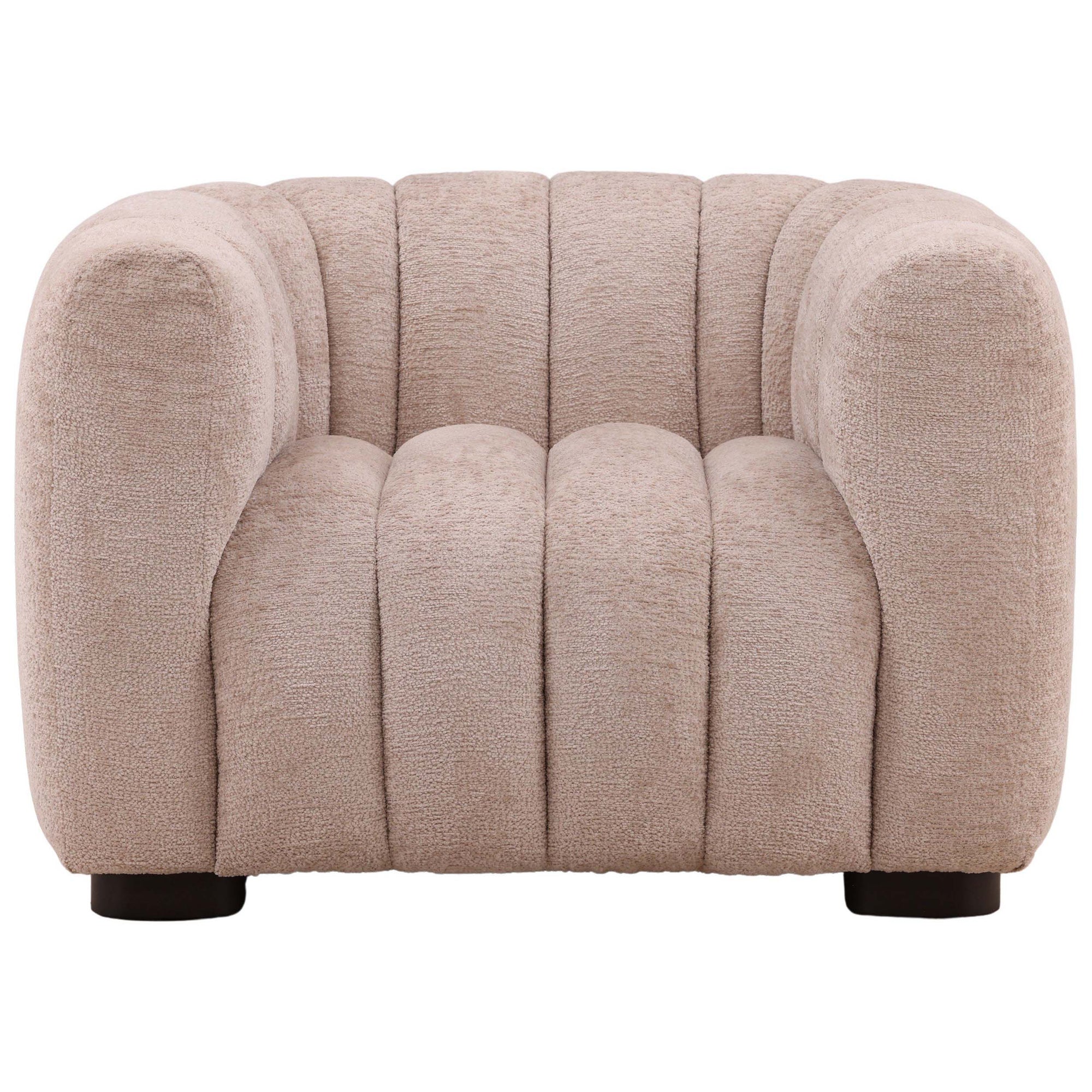 The Zakaria Chair is a statement accent piece with a comfortable, deep-seated design and a modern, rounded silhouette. Upholstered in a plush, plain woven chenille fabric, the chair is defined by distinct vertical channeling that runs across the arms and back. Its low profile and bold, rounded shape make the Zakaria Chair an inviting and sculptural addition to any living space.