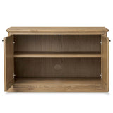 A design collaboration by Amber Lewis and Four Hands. The Dumont Small Cabinet offers simple elegance with its worn oak finish and two doors featuring understated hardware. Inside, wide shelving provides ample storage, making it a functional and stylish addition to any room. Its clean design effortlessly complements various interiors while offering practical organization.