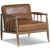 A design collaboration by Amber Lewis and Four Hands. The Warren Leather Chair blends classic design with a contemporary touch. Framed in vintage oak, it features tapered legs, spindle detailing along the arms, and charming bauble accents. Upholstered in buttery smooth leather rich in character, this accent chair offers both style and comfort, making it a refined addition to any space.