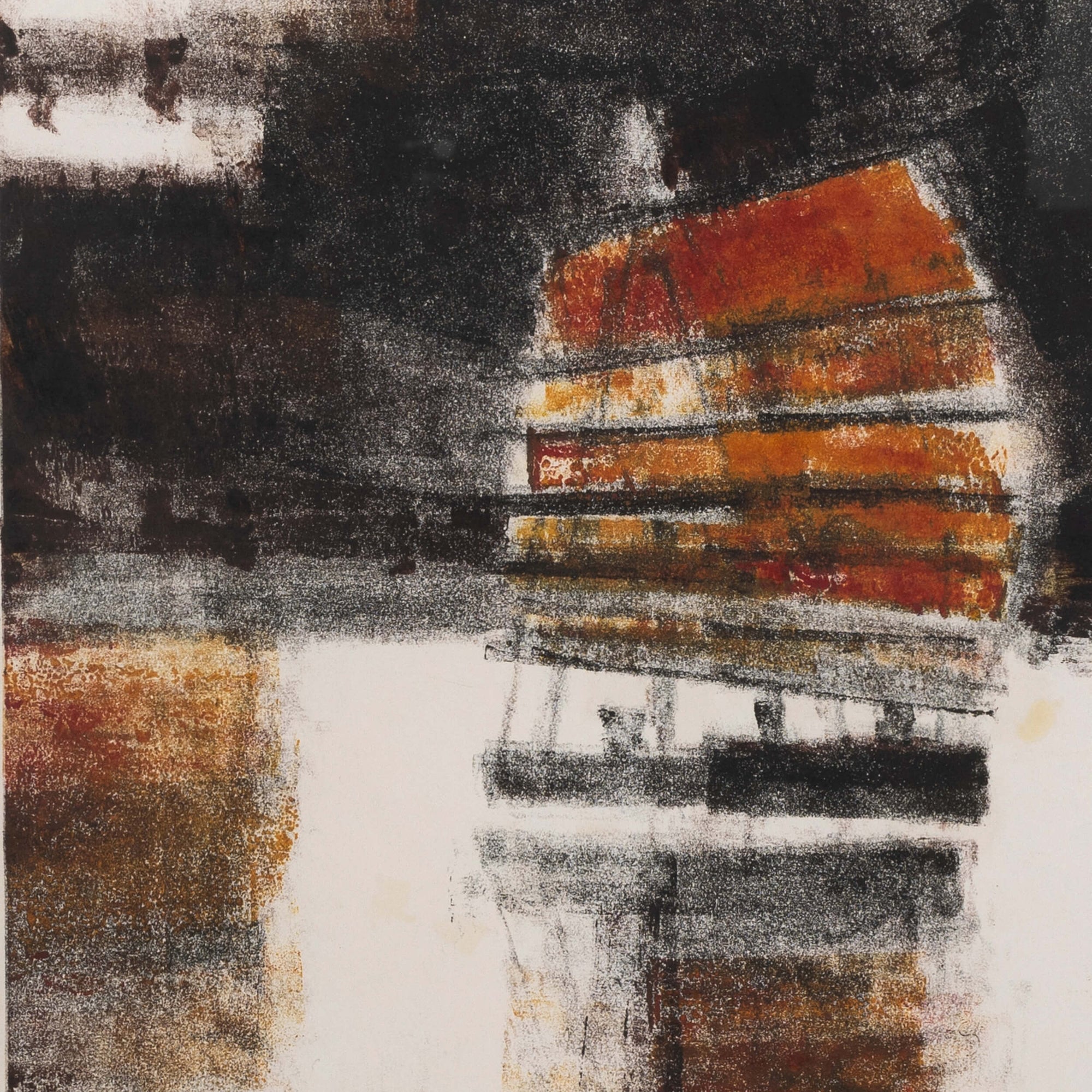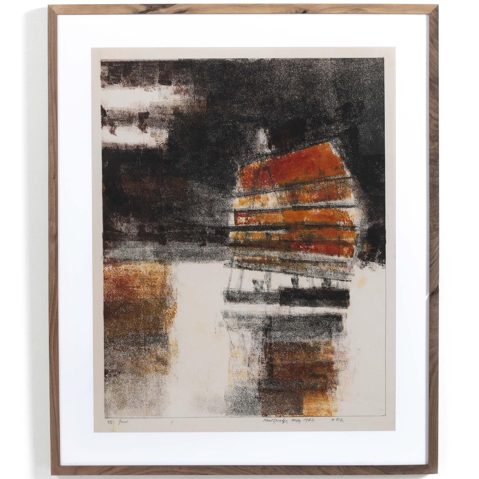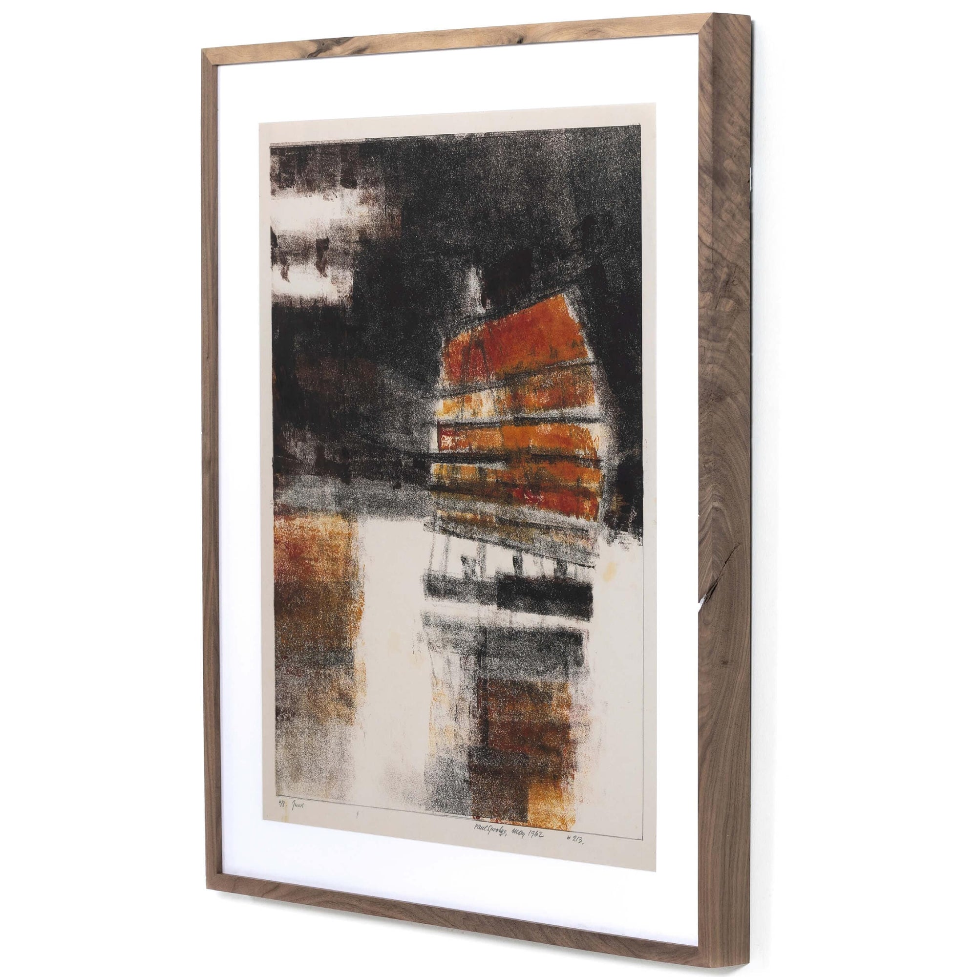 A Latvian native with a Doctorate in Architecture, the late Pepi Sprohge worked in a range of mediums, from paper lithographs to marker drawings. A vintage piece of his from 1962 is given new life, and signed, dated and titled by the artist. Framed within rustic walnut for a gallery-quality look. Handmade in Austin, Texas.