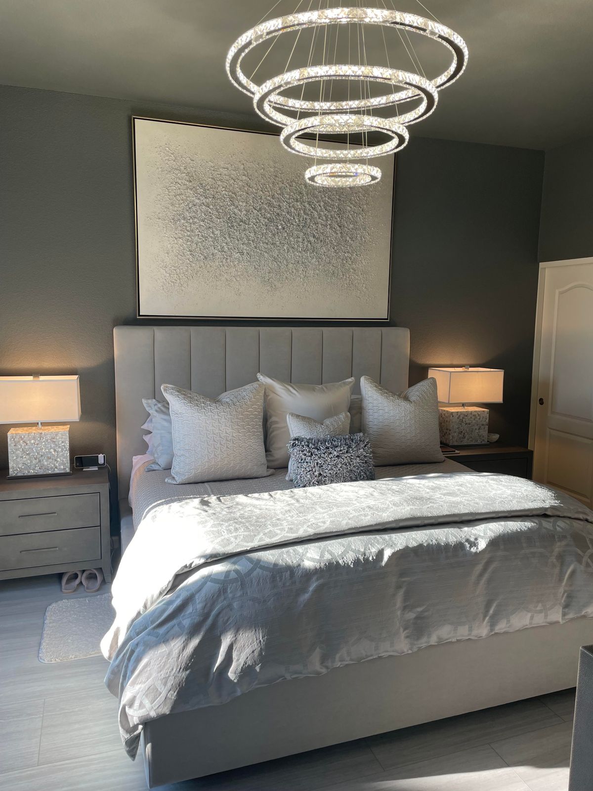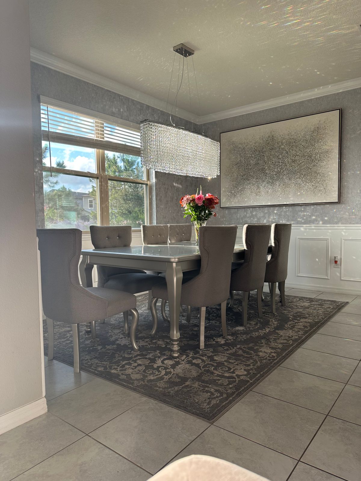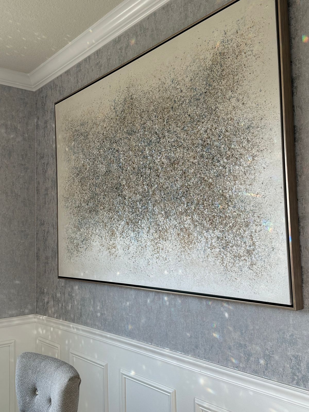 This gorgeous painting is just the right touch to complete the look in our room. It's eye catching and unique without being too much. The detail catches the light from different angles every time you look. Scale of it is perfect to fill a larger space.