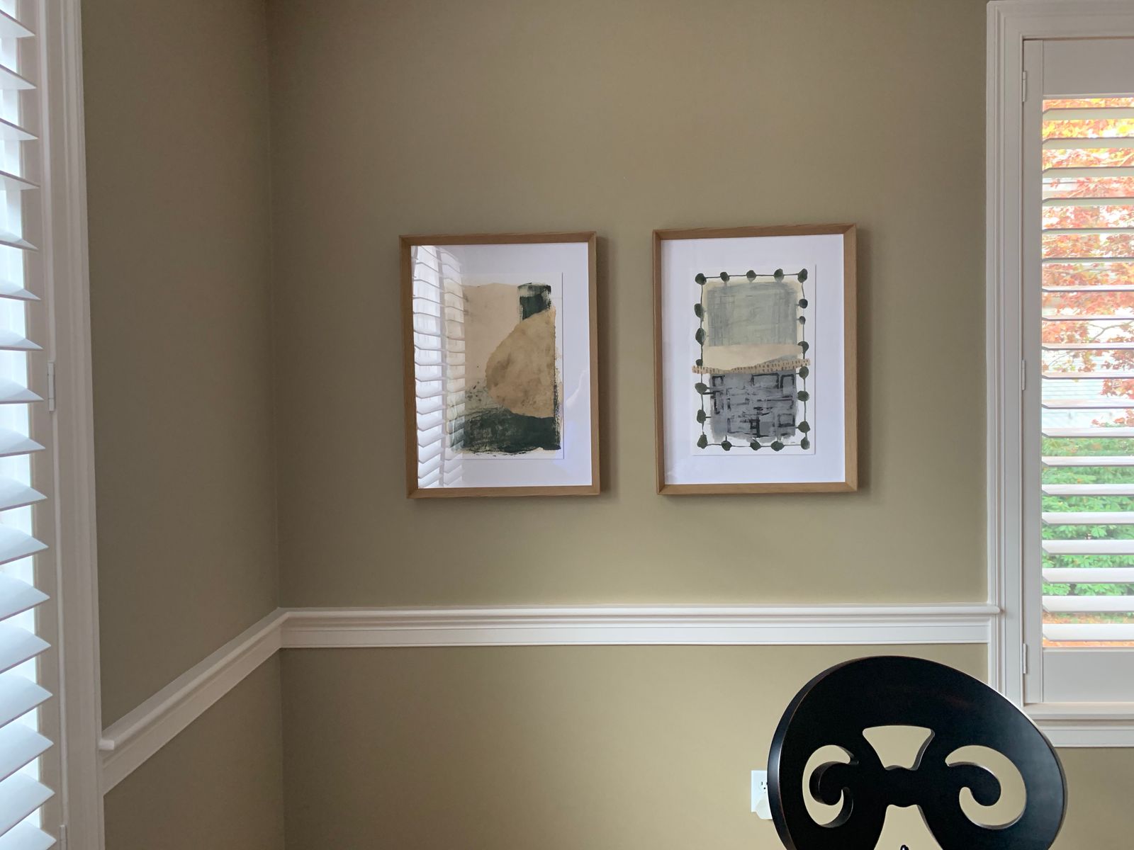 I am amending my review to reflect that I made a mistake on the size of these prints.... I wish I had customized them to a larger size as they are looking a bit small on this wall. The prints are 20 W x 27 H each and the wall they are hung on is 75" wide x 64.75 high." There is 6.75'' between the 2 prints.