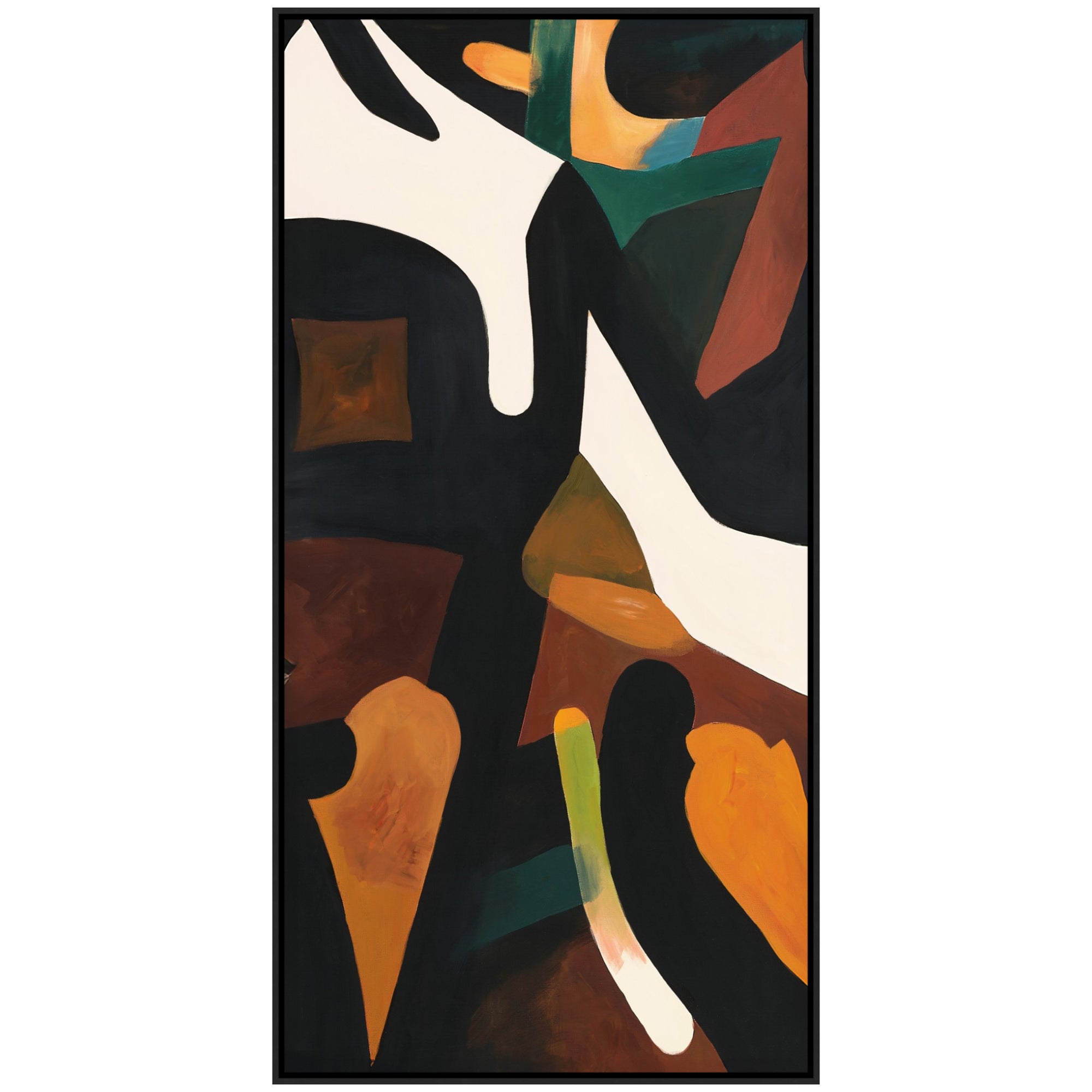 The Melange II Framed by Citizen Artist is a striking abstract piece defined by its dynamic composition and rich, earthy color palette. Curving lines and interlocking shapes in deep browns, terracotta, ochre, and black create a sense of movement and energy. The dramatic white form cutting across the center provides a strong focal point. Finished on a natural canvas art substrate with hand embellishment for added texture, this piece is beautifully contained within a sleek poly black float frame, making it a powerful, modern statement for any wall.