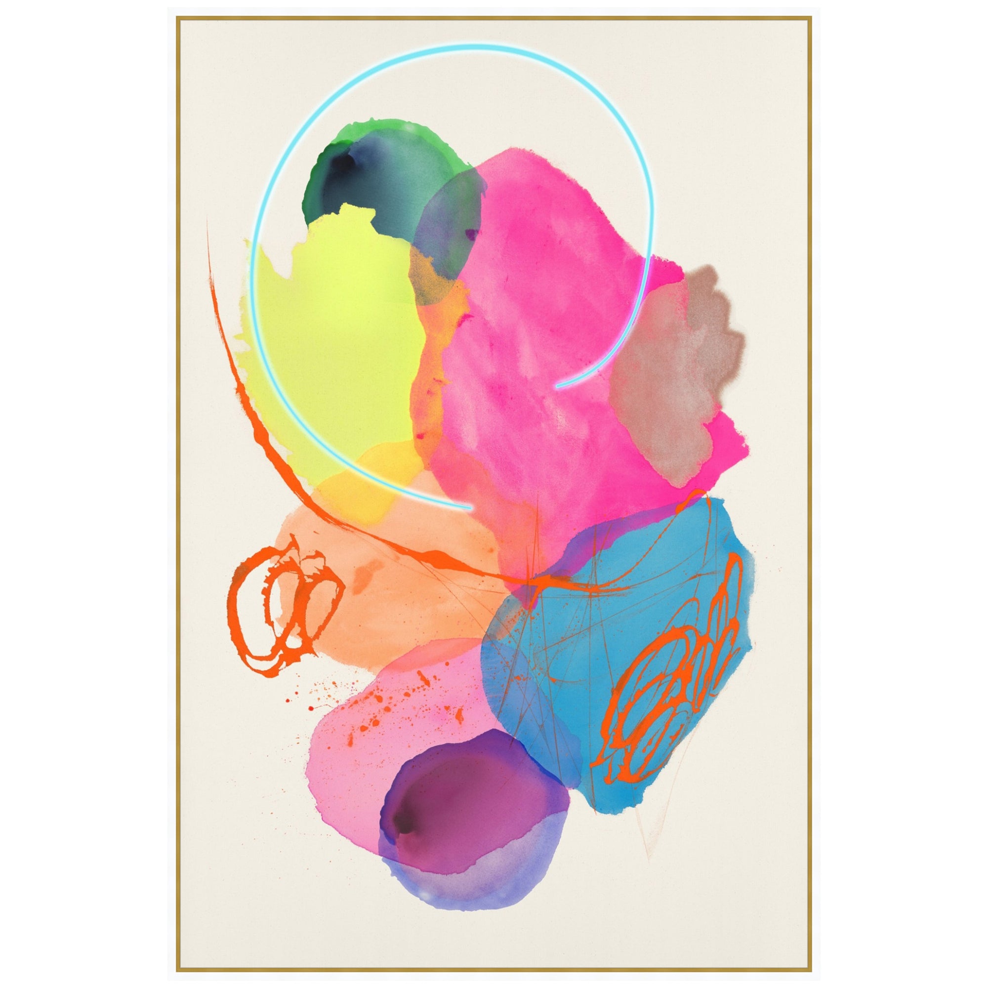 The Stella Framed artwork by Van Garret is a vibrant, contemporary abstract piece defined by its explosive use of neon colors and dynamic forms. Layers of bright pinks, electric blues, neon yellow, and orange converge, accented by bold linework and a swirling, luminous element that creates energy and depth. This light embellished art features subtle surface texture, enhancing its modern impact. Housed in a poly white floater frame with a gold rabbet, this piece is a joyful, high-impact statement perfect for adding a burst of personality to any modern setting.