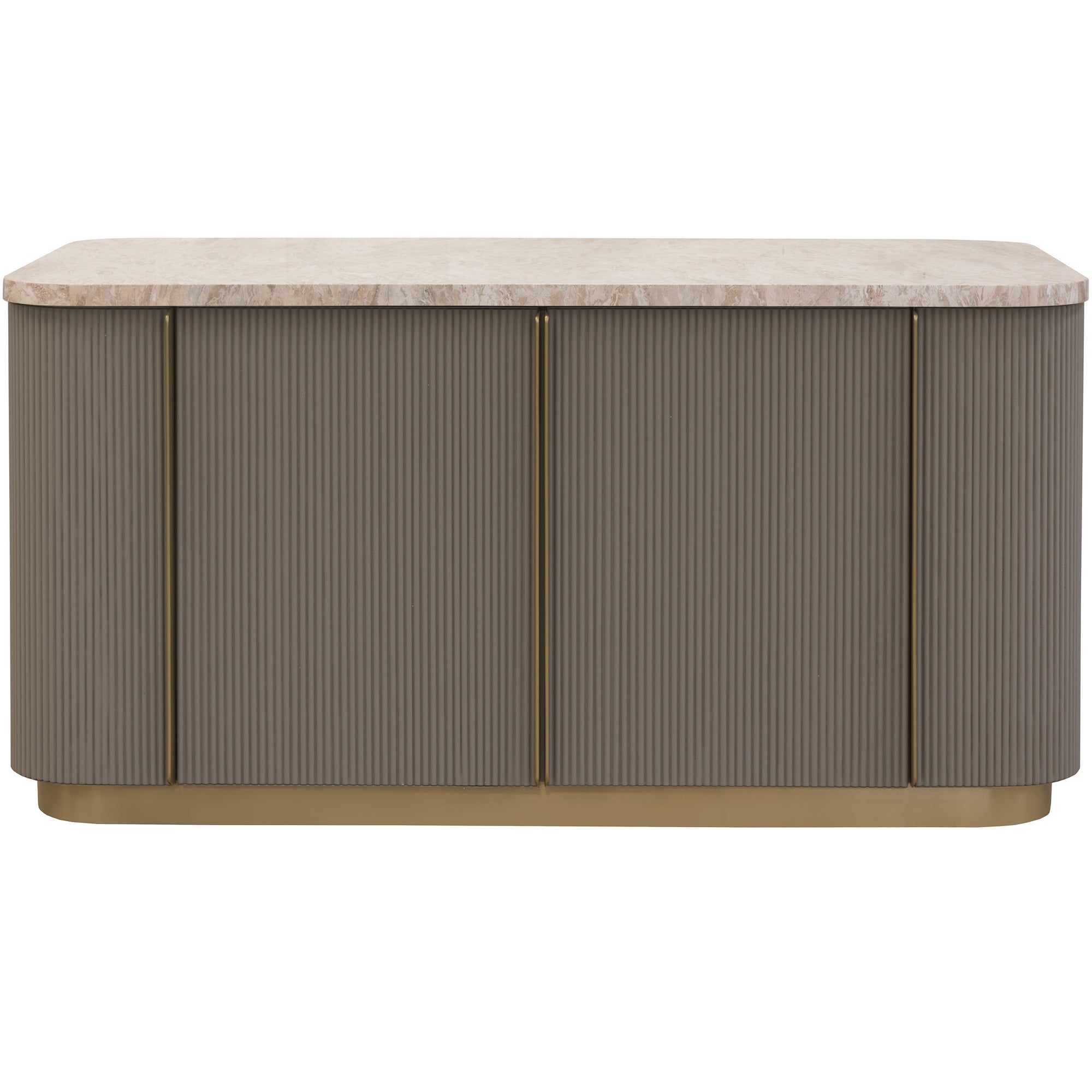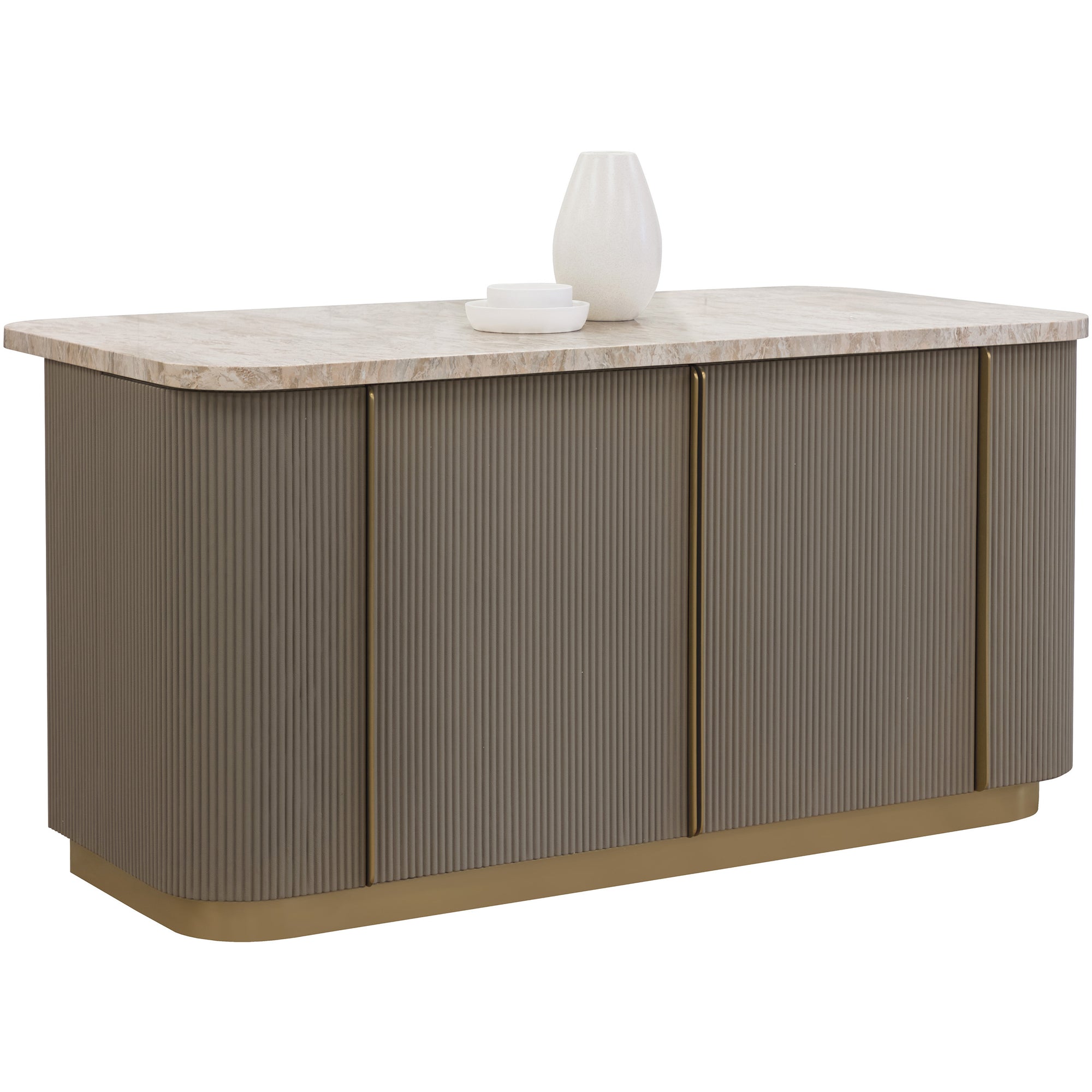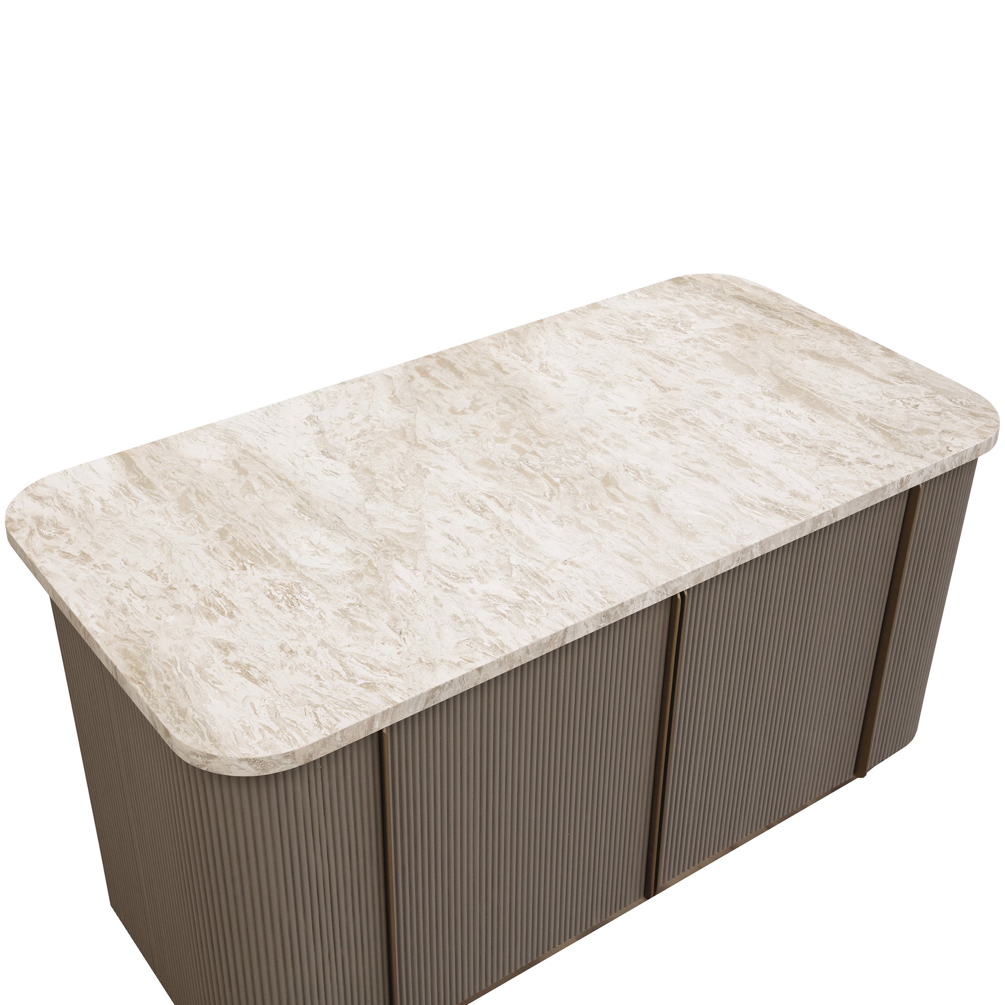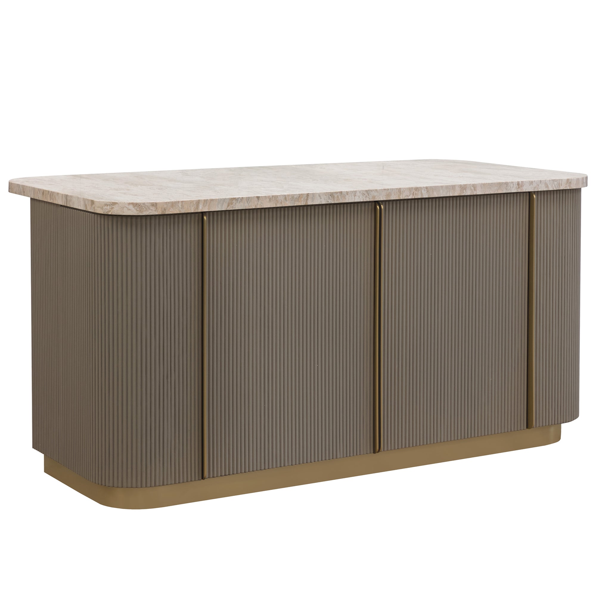 The Cataldi Kitchen Island features a sleek marble top paired with fluted taupe faux leather panels for a modern, textured look. Adjustable interior shelves and soft-close cabinet doors provide practical storage, while brushed gold accents elevate the design. Versatile and stylish, Cataldi can serve as a kitchen prep station, workspace, or standalone statement piece.