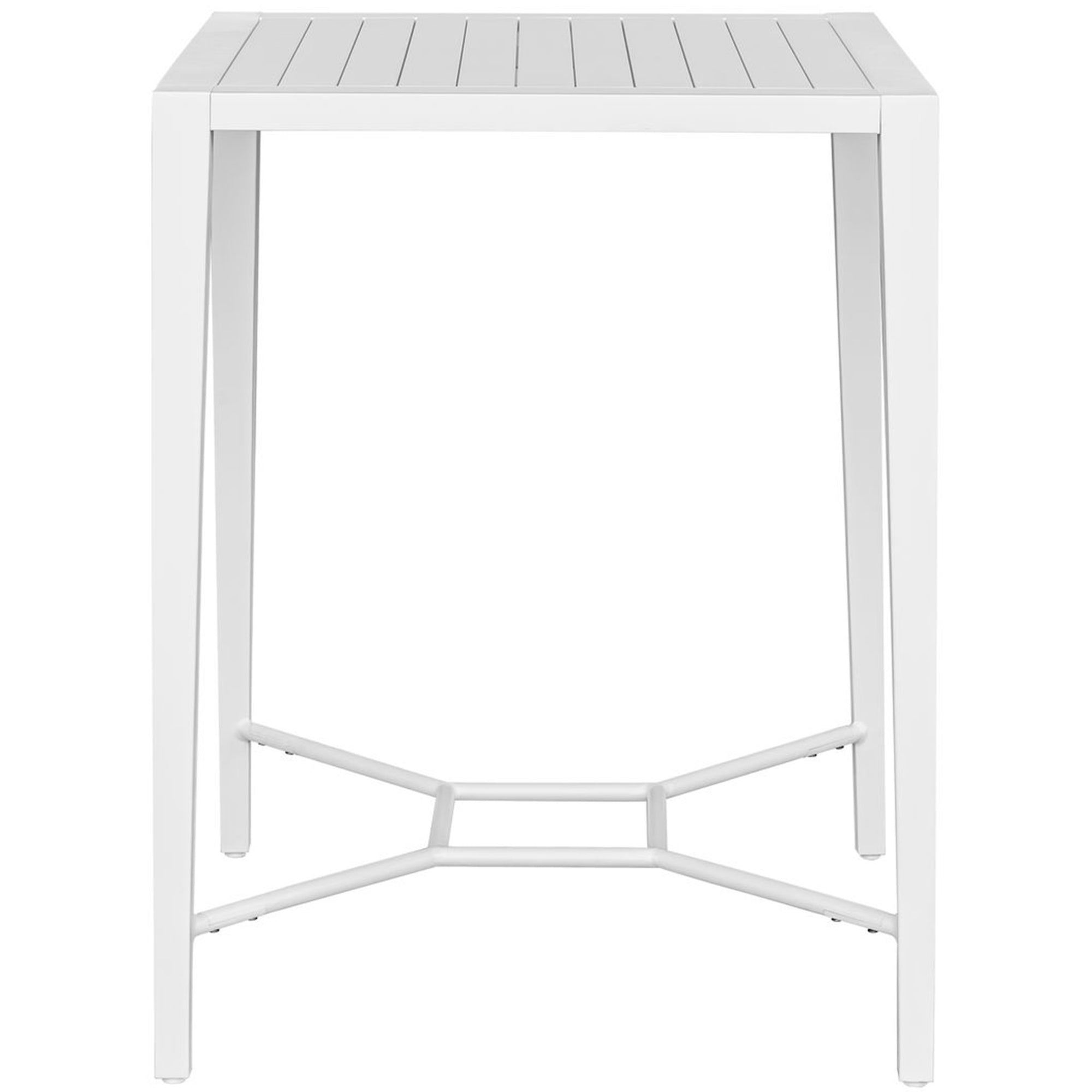 The Montellano Bar Table features a tall streamlined silhouette that brings a clean architectural presence to any indoor or outdoor entertaining space. It showcases a flat square slatted top surface, providing a secure and elevated area for gathering or serving beverages. This upper section is supported by a minimalist open framework base consisting of four straight vertical legs that slightly taper towards the floor. The lower structure is reinforced by an integrated geometric cross stretcher, ensuring exceptional stability while maintaining a light visual footprint. This well proportioned design effortlessly merges functional simplicity with a space saving open profile to ground a modern arrangement.