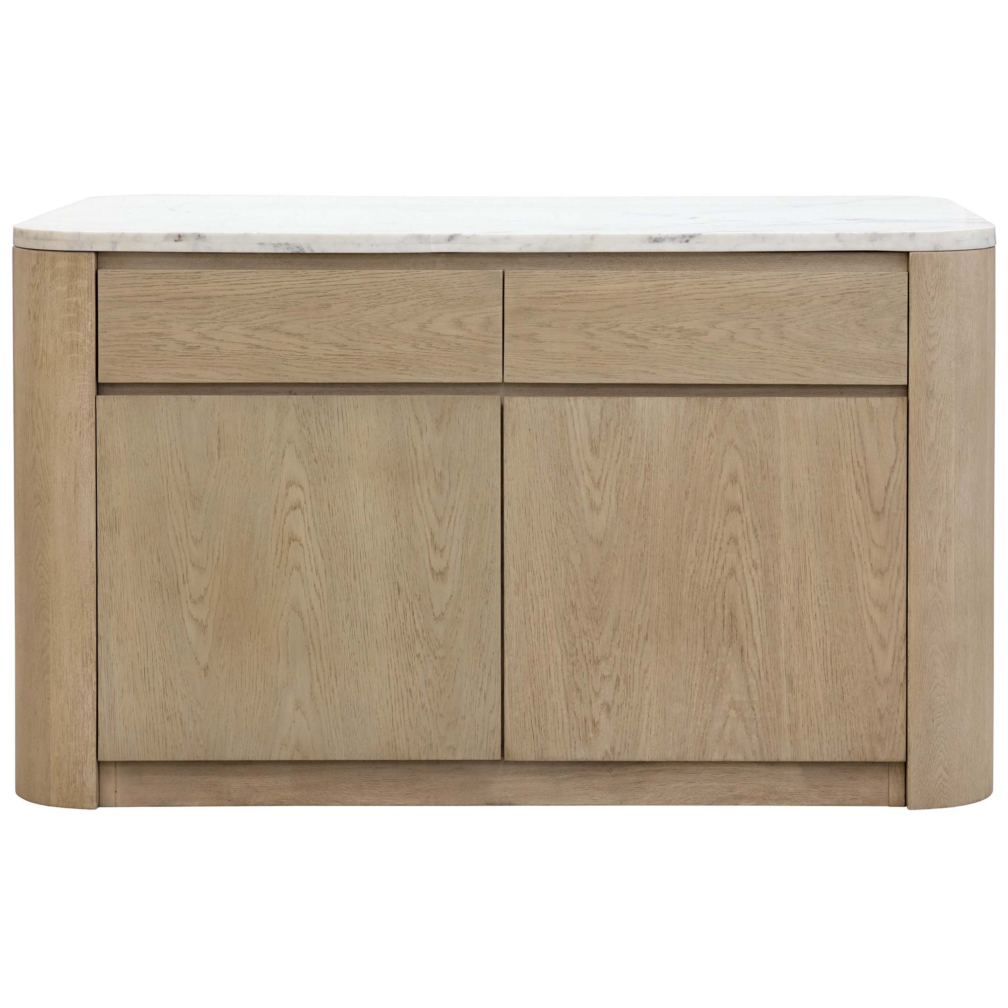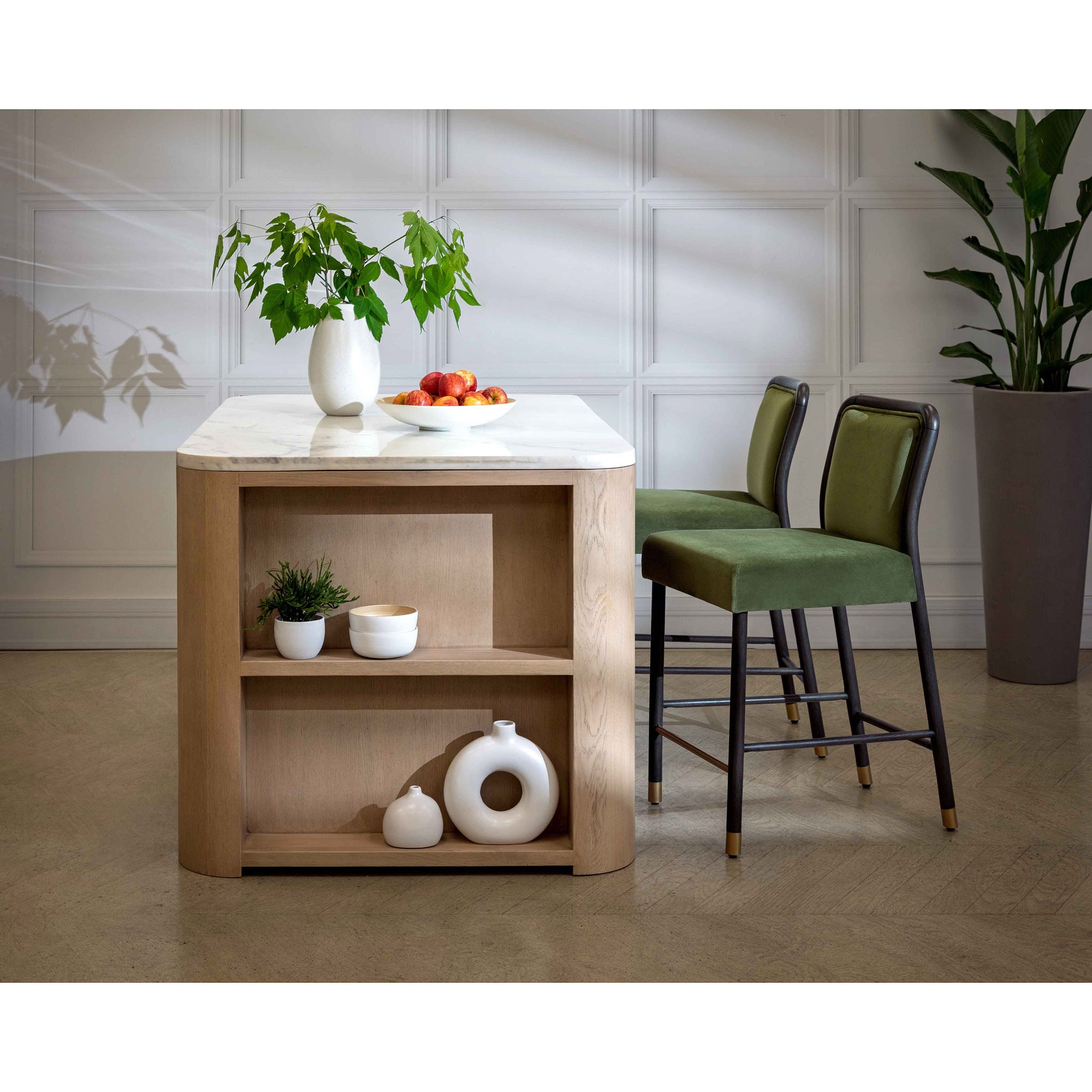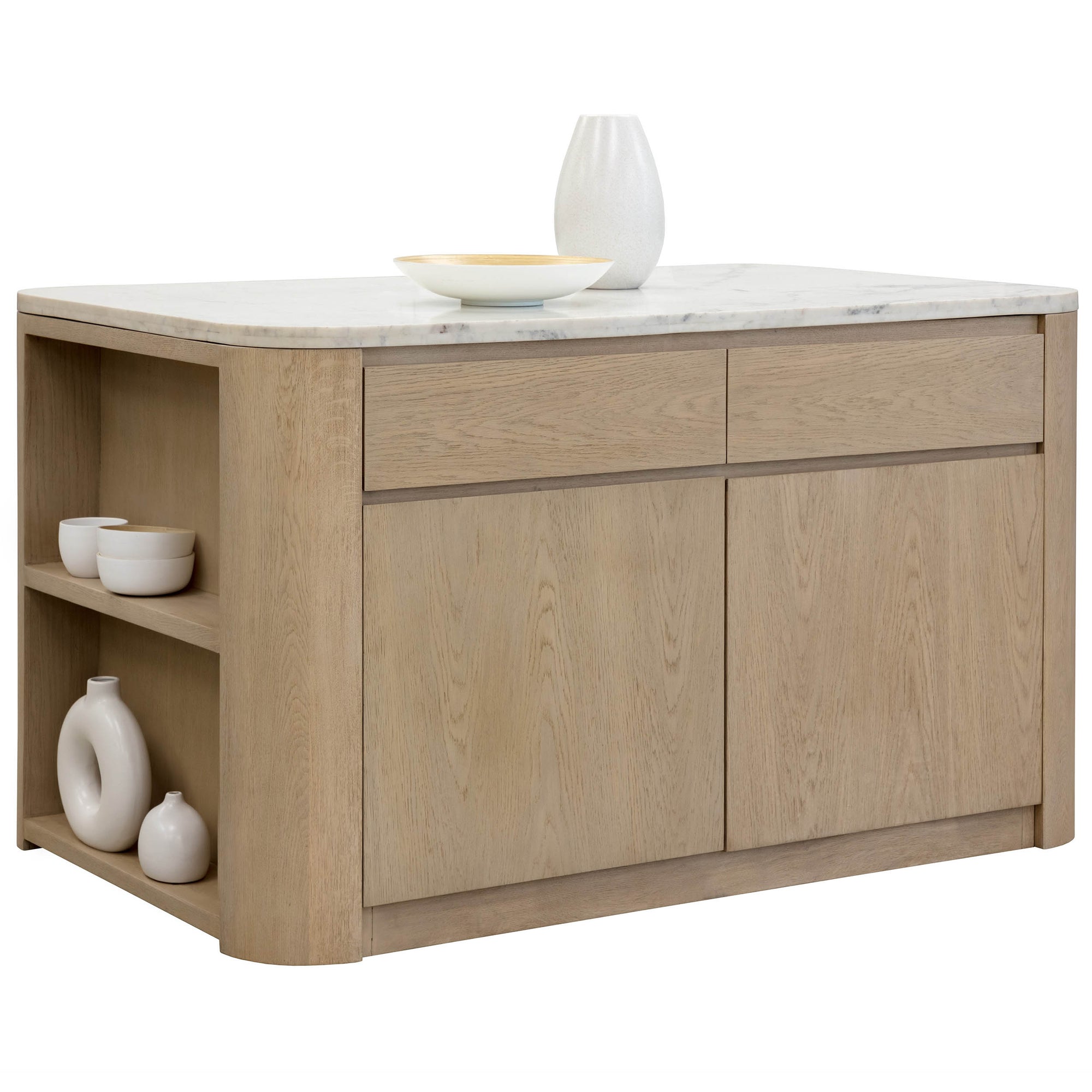 The Romilly Kitchen Island combines a rounded rectangular silhouette with a Banswara marble top and warm oak base, offering both style and functionality. Thoughtful open shelving and soft-close drawers provide practical storage, making it ideal for kitchens or versatile workspaces. Handcrafted by skilled artisans, each piece showcases unique natural variations in marble and wood for a one-of-a-kind statement.