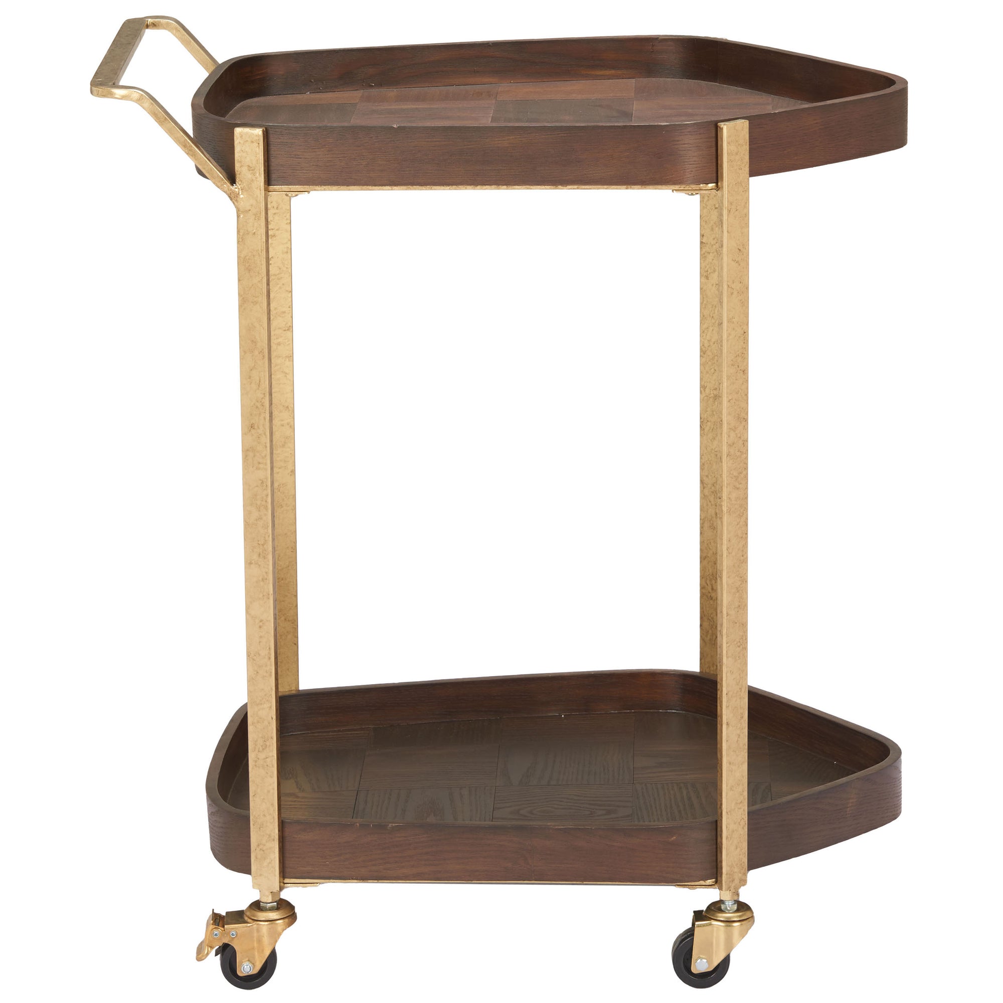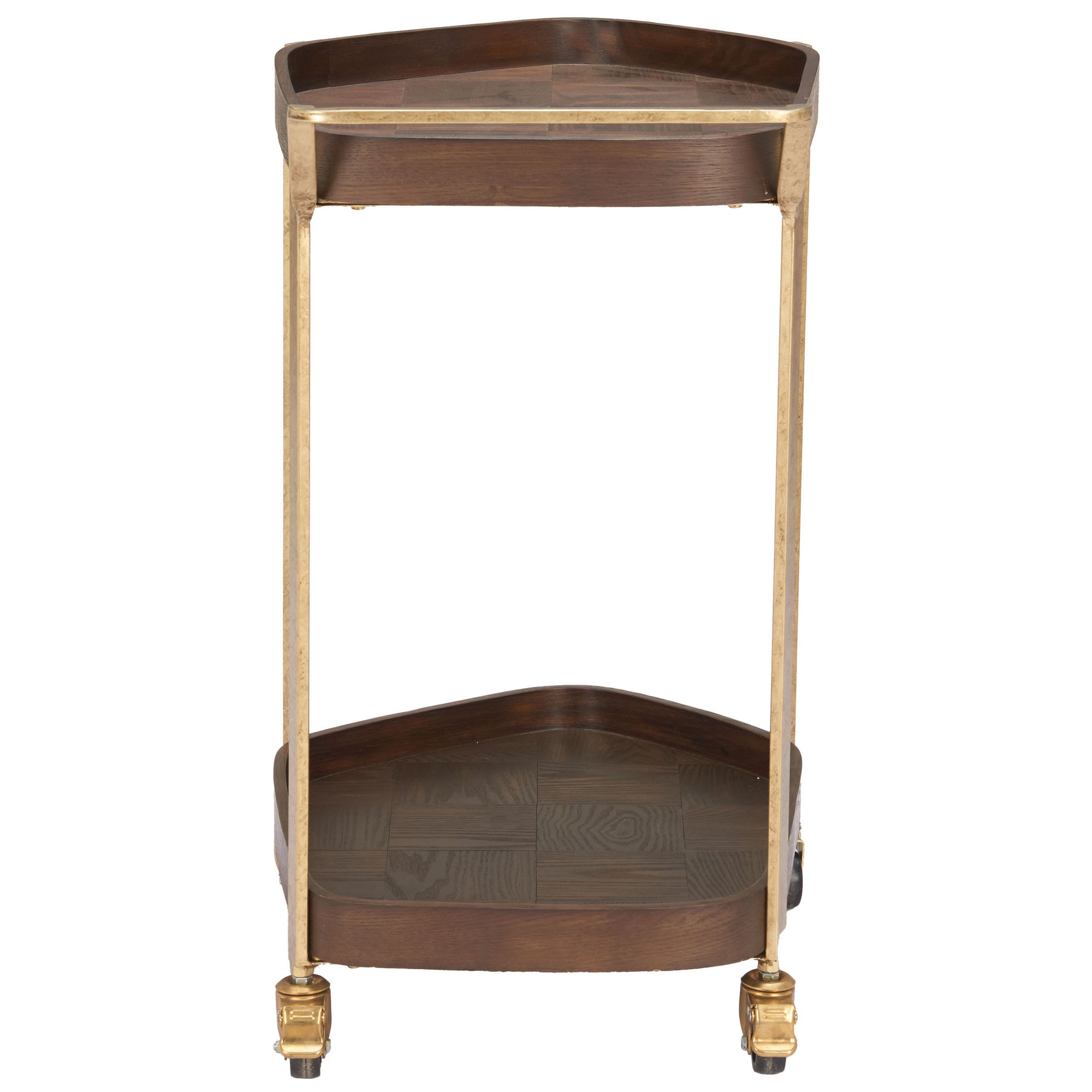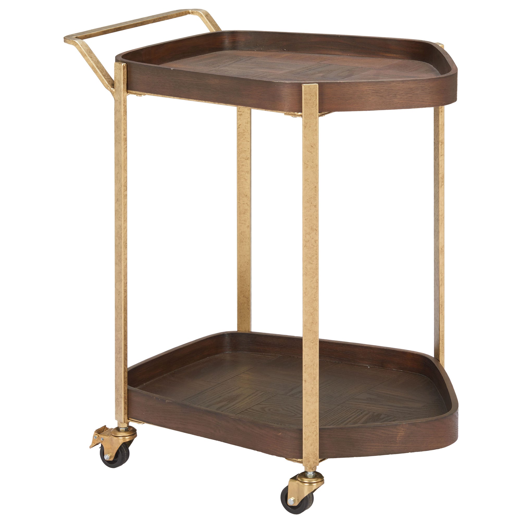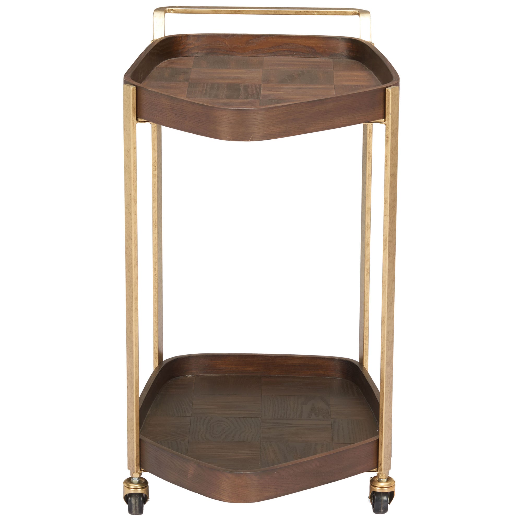 The Stela Bar Cart is designed for both style and functionality, making it a perfect addition to any modern home. This versatile serving cart features two spacious tiers crafted from MDF with a rich walnut veneer, offering ample room for bottles, glassware, and accessories. The sleek steel frame is finished in a glamorous gold, providing a chic contrast to the warm wood tones. Equipped with casters for easy mobility, the Stela Bar Cart enhances any entertaining or storage space with ease and elegance.