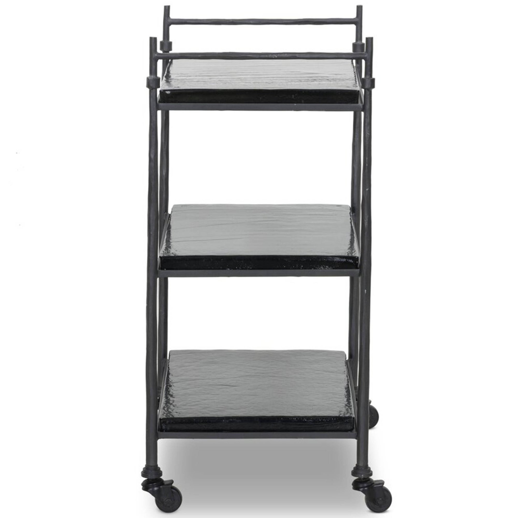 The Teagan Bar Cart adds industrial elegance to any space. Designed with a rolling hammered metal frame finished in gunmetal and paired with three tiers of smoked cast glass for a sleek, functional look. Perfect for serving or displaying bottles, glassware, and bar essentials.