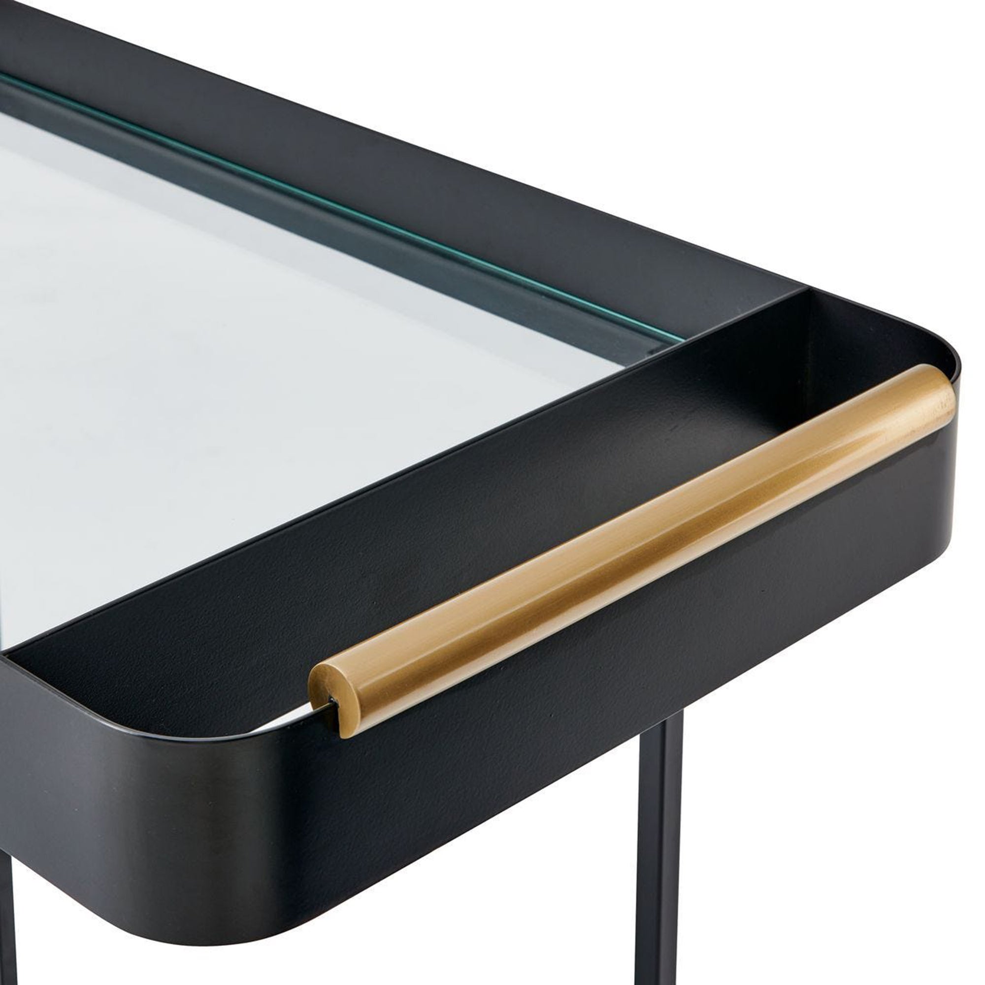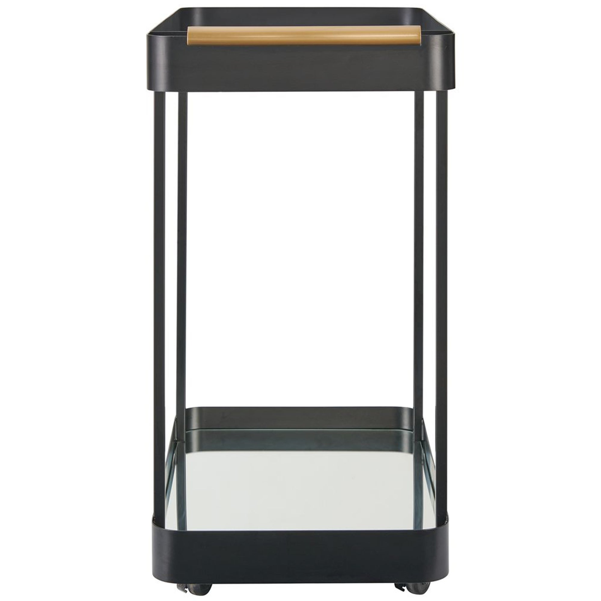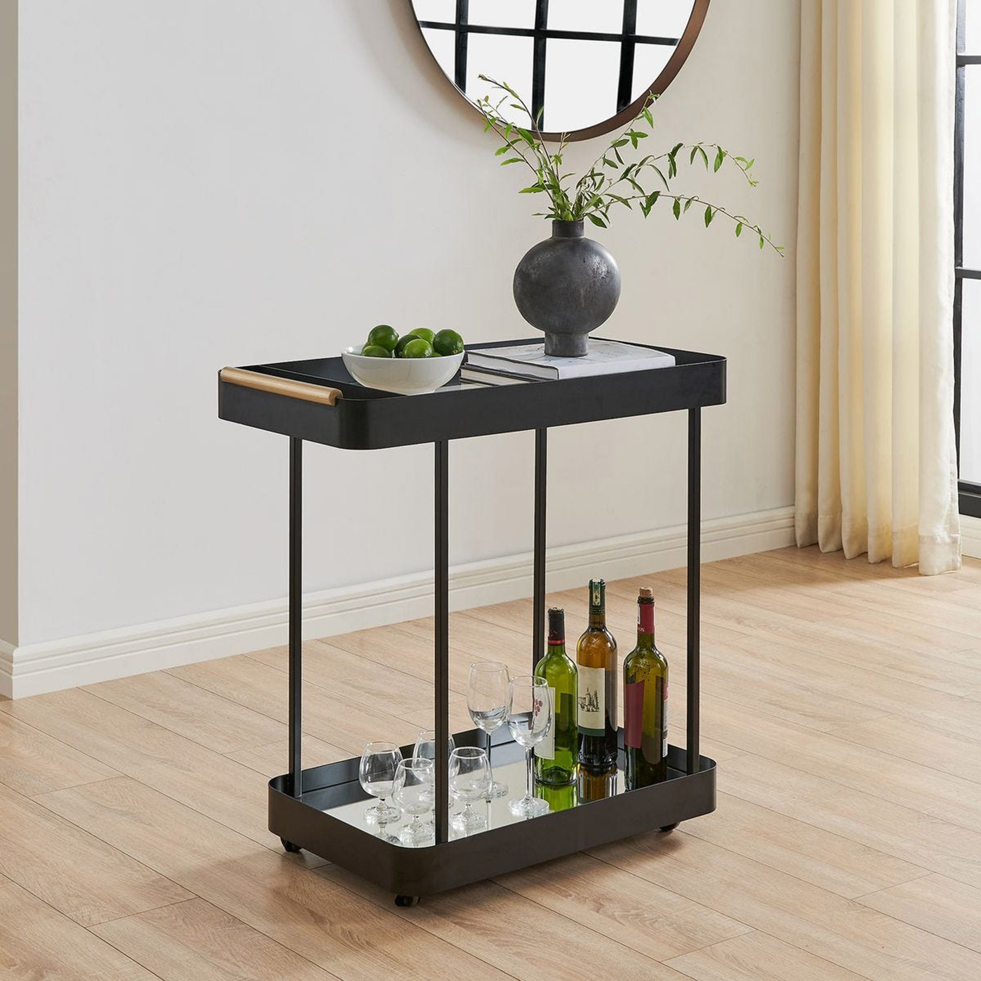The Vesper Bar Cart serves as a stylish and functional focal point for entertaining. Its sleek, open-frame design features a sophisticated metallic handle and casters for easy mobility. With a transparent top tier for preparation and a reflective bottom shelf to display bottles, this piece brings a touch of modern elegance to any room.