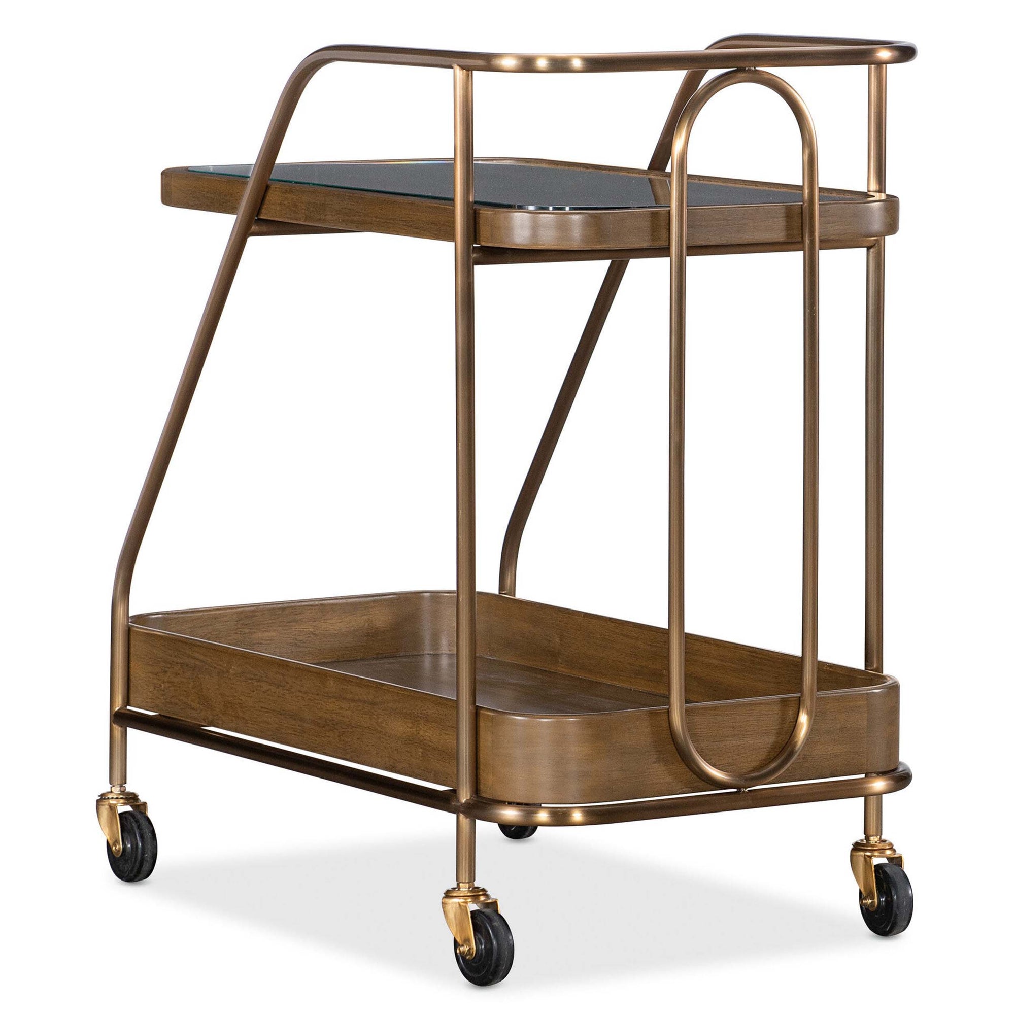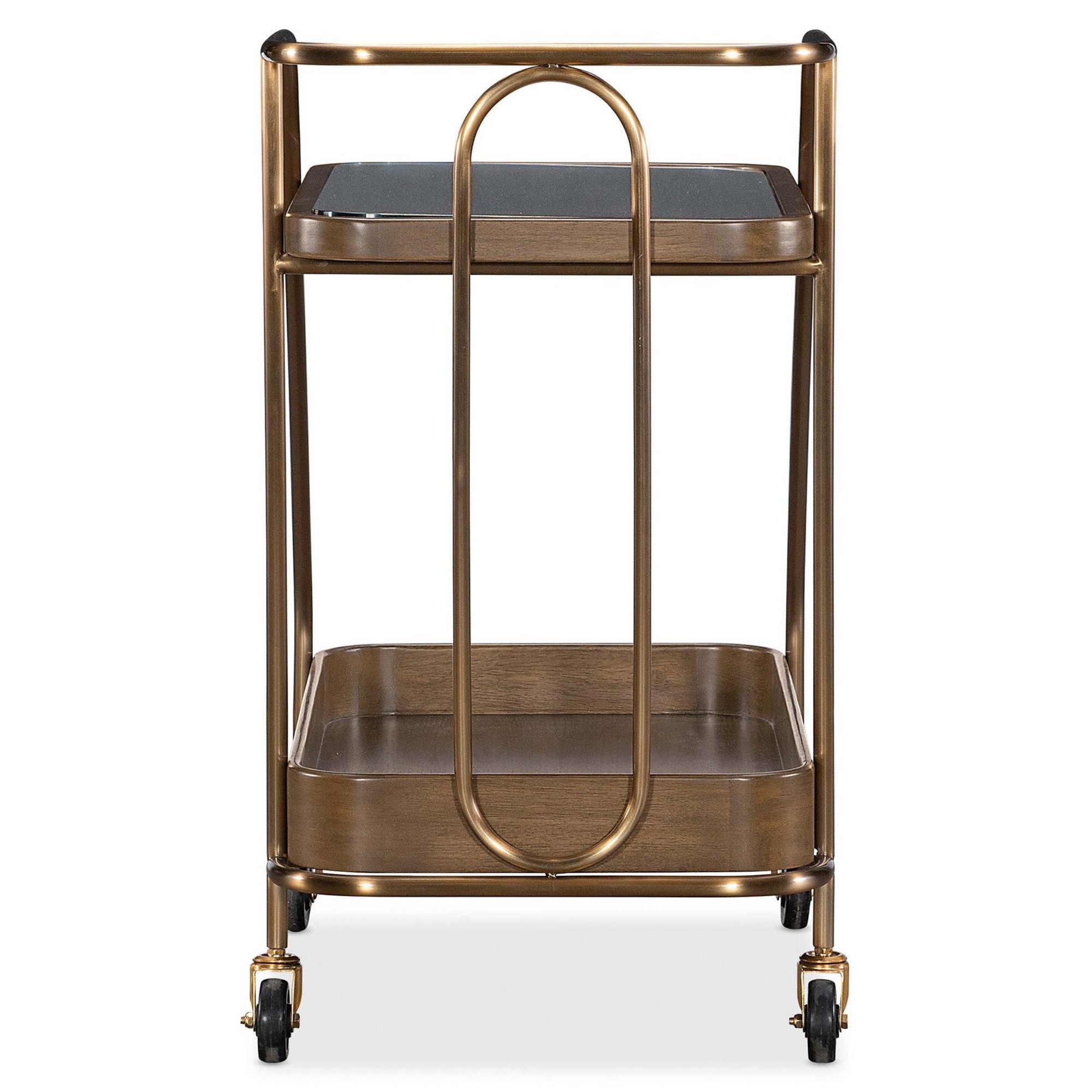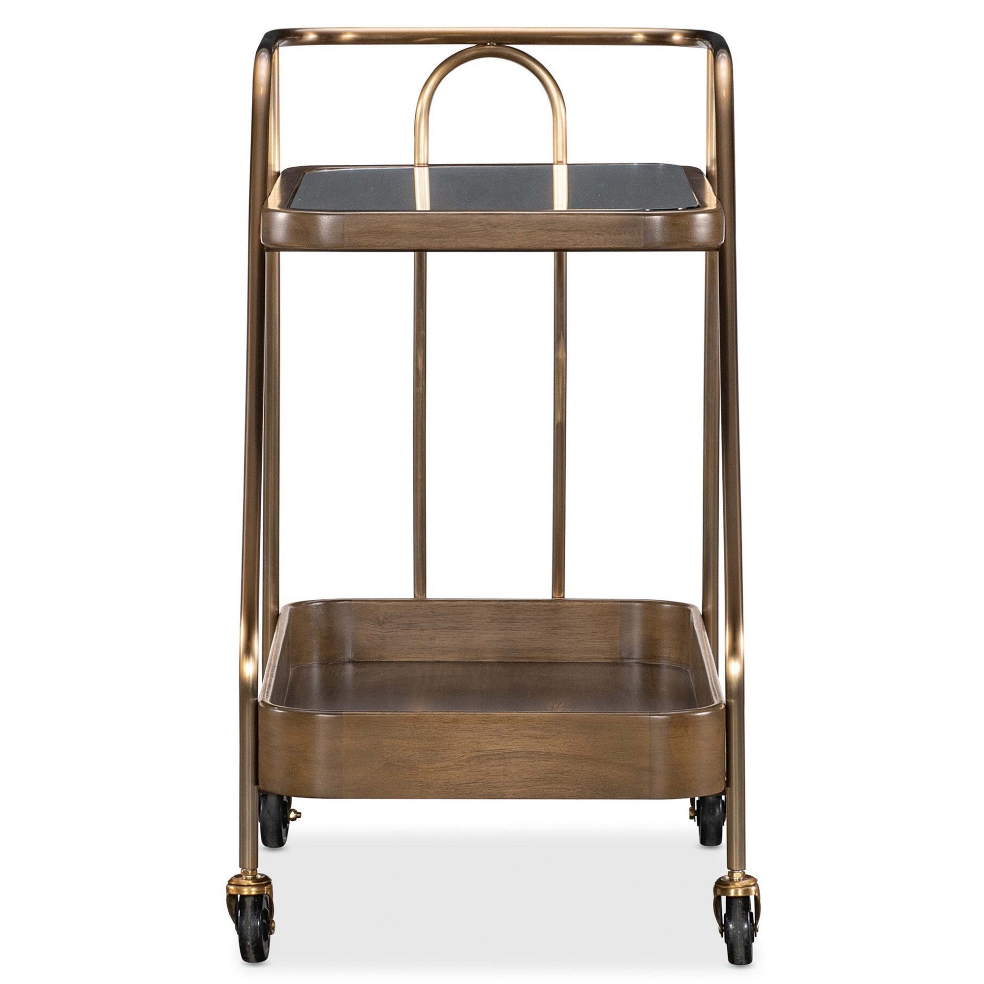 The Walnut Wine and Bar Cart blends refined transitional design with high-end materials for an effortless entertaining experience. This chic rolling cart features a top shelf with smoked glass paired with a tray-style lower shelf crafted from figured walnut veneers in a warm Light Caramel finish. Supported by a sleek metal frame in plated Sunlit Bronze, the piece includes smooth casters that allow for easy mobility between the dining room, living space, or kitchen. Its sophisticated mix of textures and clean geometry creates a modern focal point for serving wine and spirits in style.