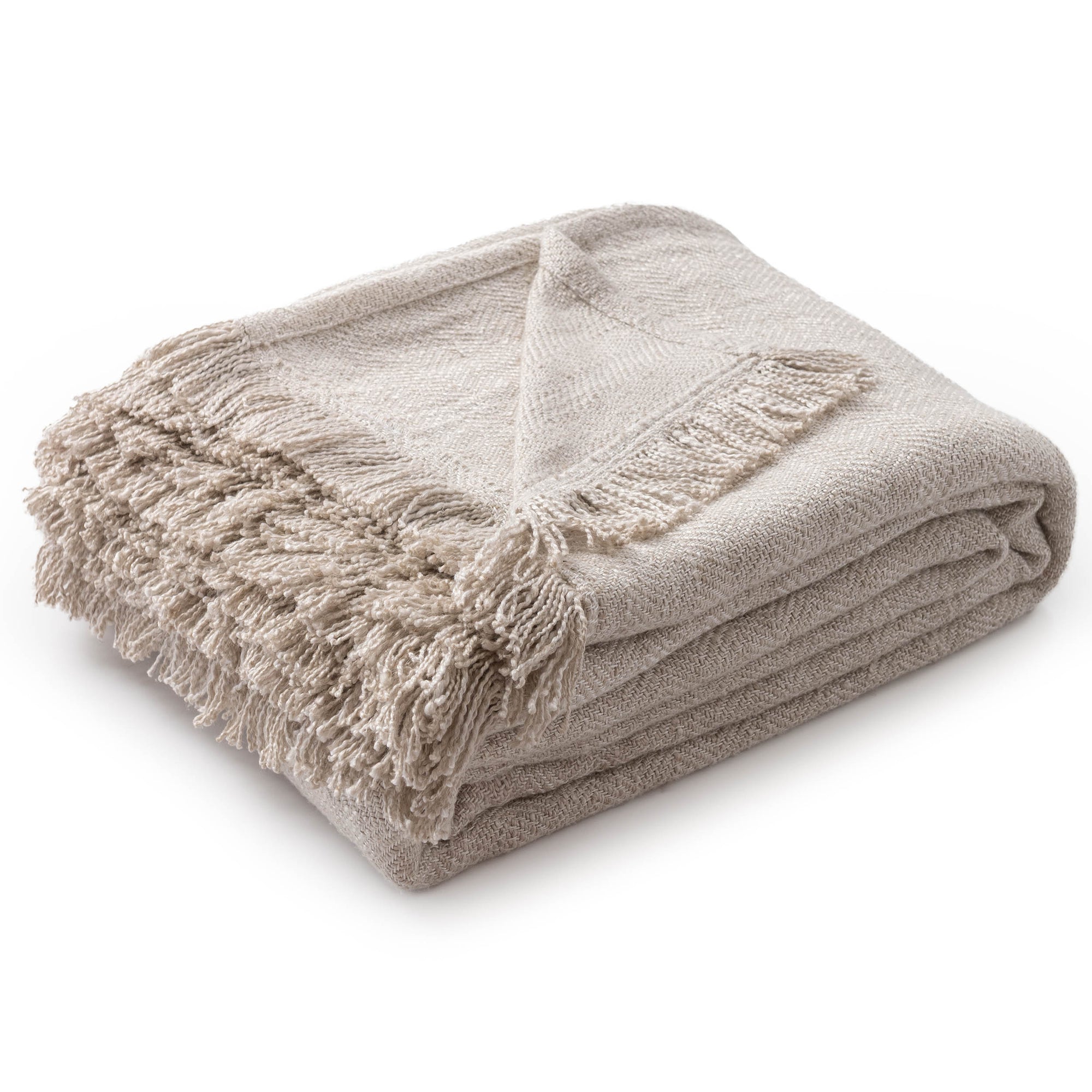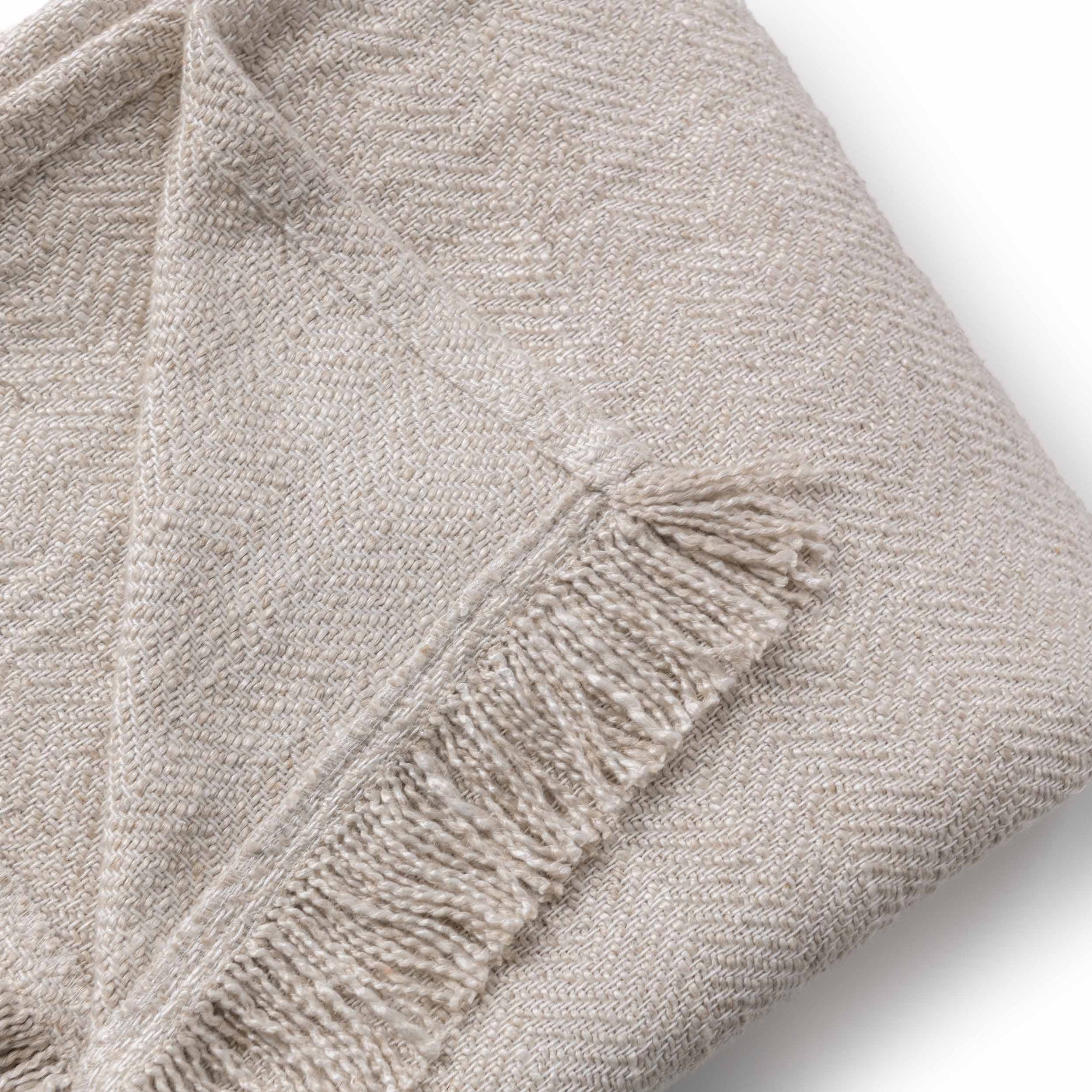 The Avani Blanket offers a refined blend of minimalist style and artisanal texture. Woven from a blend of viscose and linen, this blanket features a subtle herringbone weave that provides a breathable feel and soft hand. The design is anchored by hand-knotted fringe detailing along the edges, adding a relaxed, tactile element to bedding or seating areas. Its neutral palette and organic texture make it a versatile layering piece for modern or transitional interiors.
