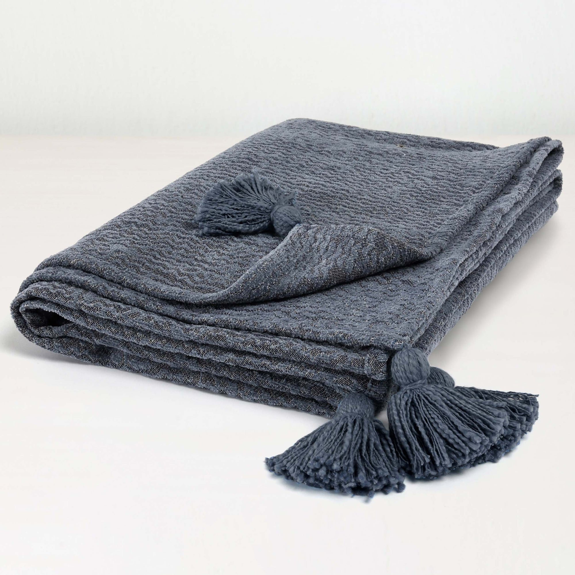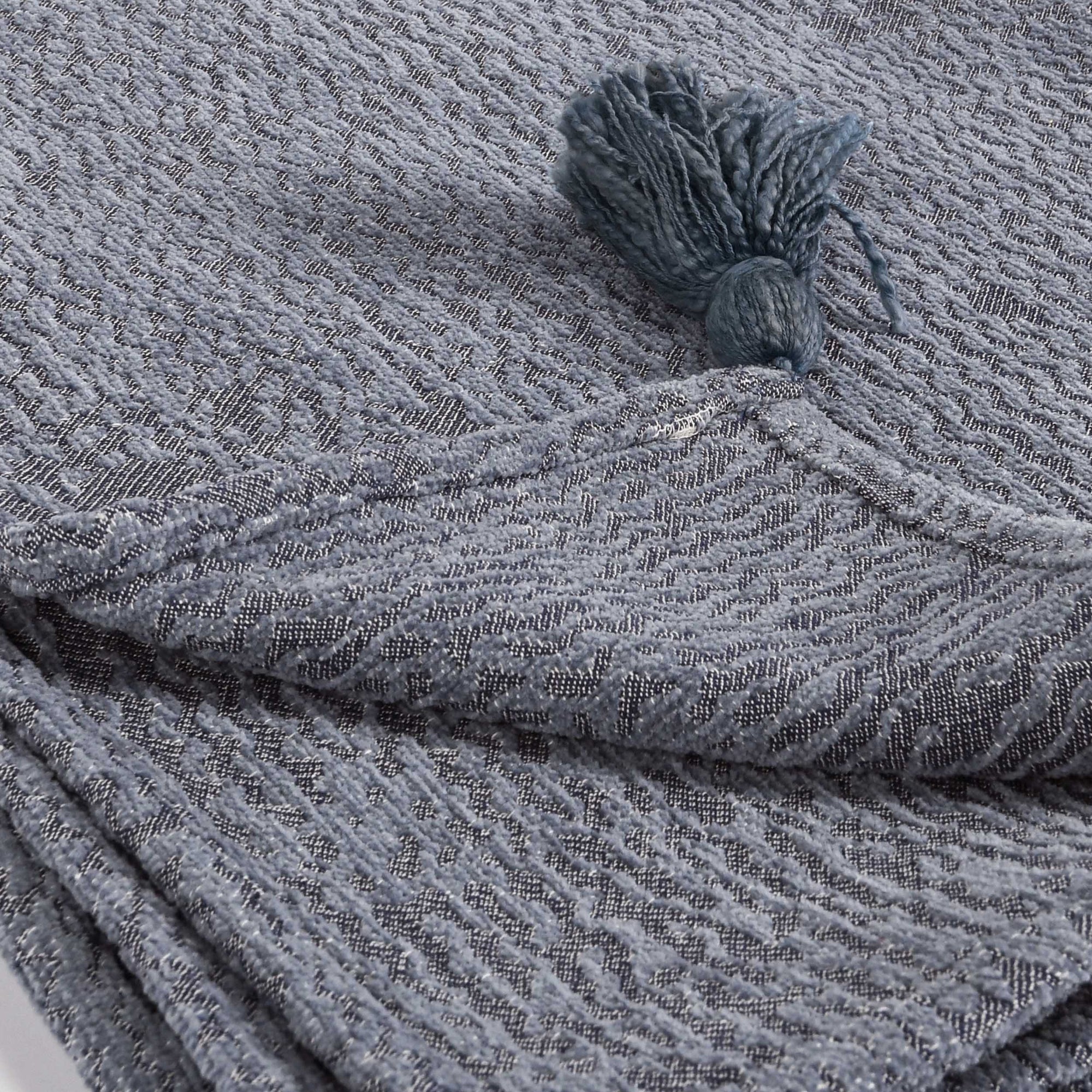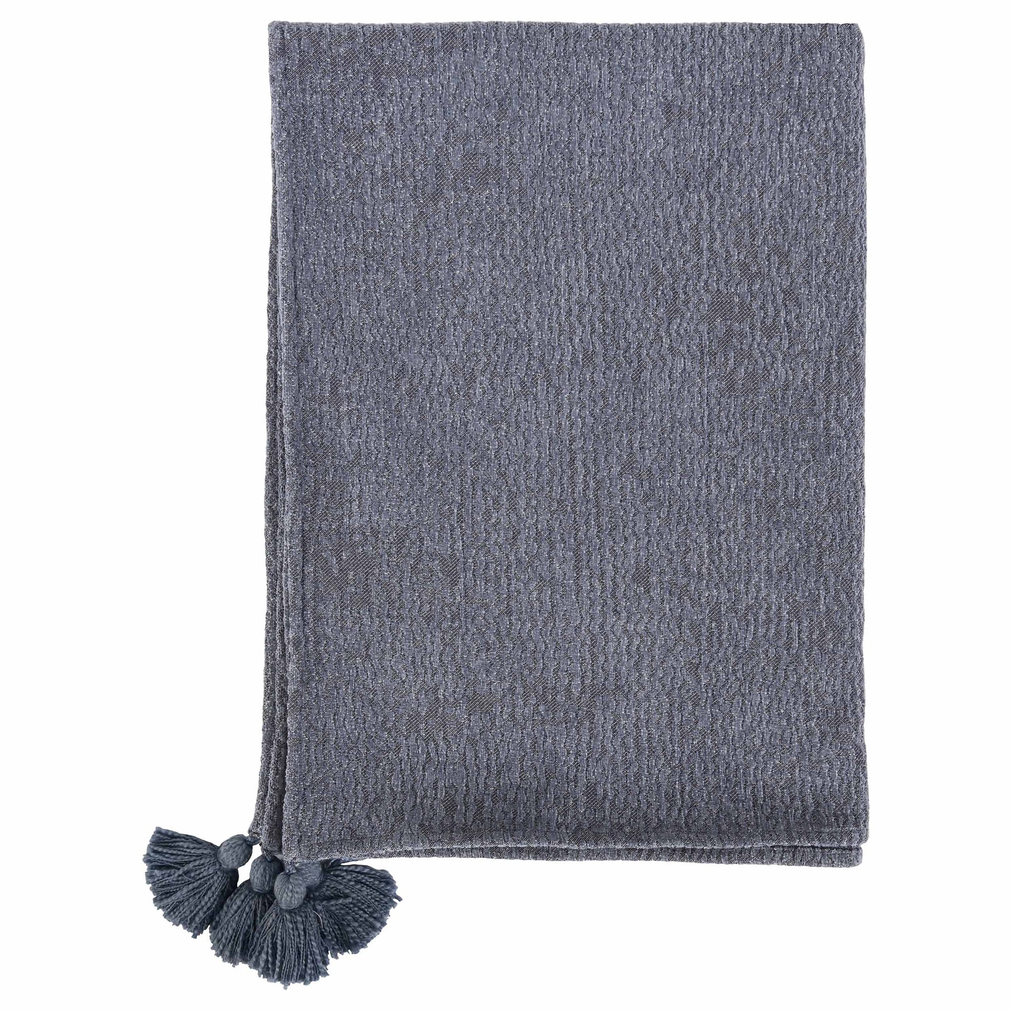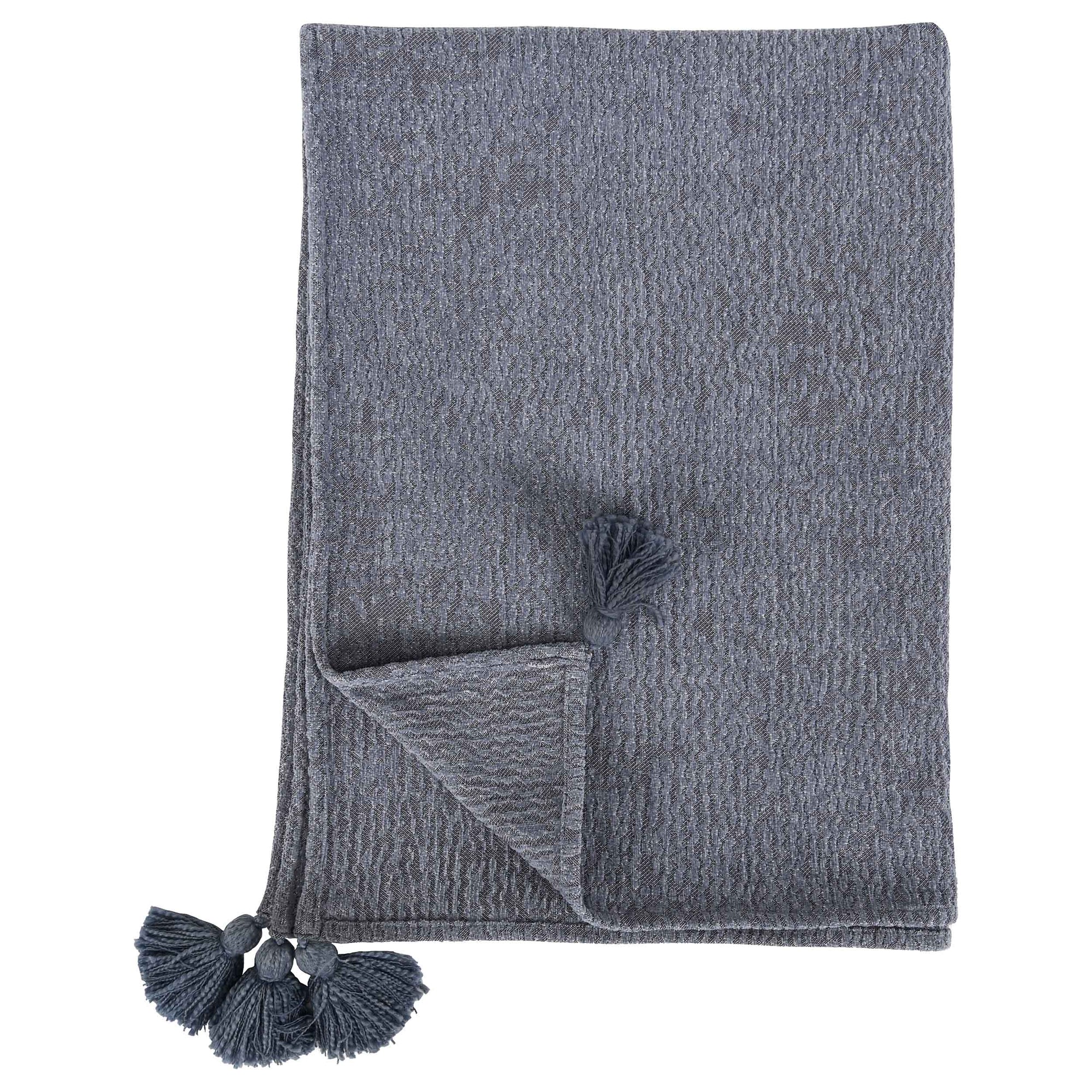 The Carmela Throw adds movement and color to any setting with its large tassels and a rich blue-gray hue. The woven 100% cotton gives this throw a soft hand-feel and touchable texture. Ideal for any style, this throw makes any room more inviting.