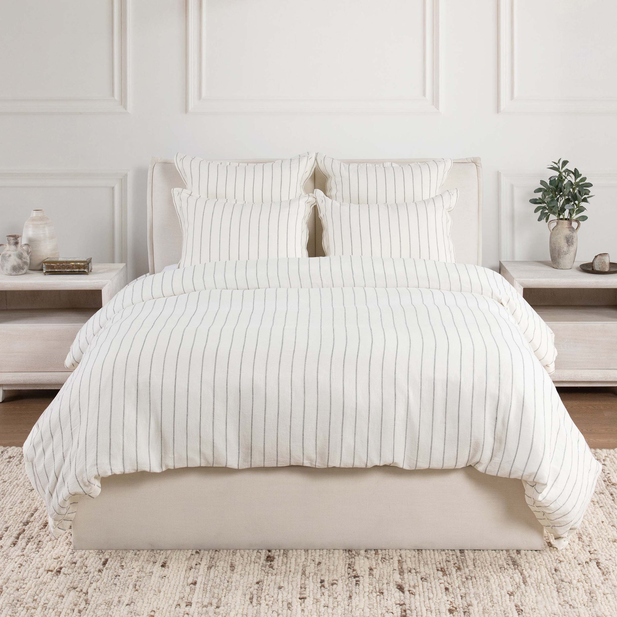 The Monaco Duvet is crafted from soft Belgian Flax linen with a subtle stonewash finish. Its woven pinstripe design adds texture and elegance, while corner ties ensure a secure insert. This duvet layers beautifully with other bedding for a polished, comfortable bedroom look.