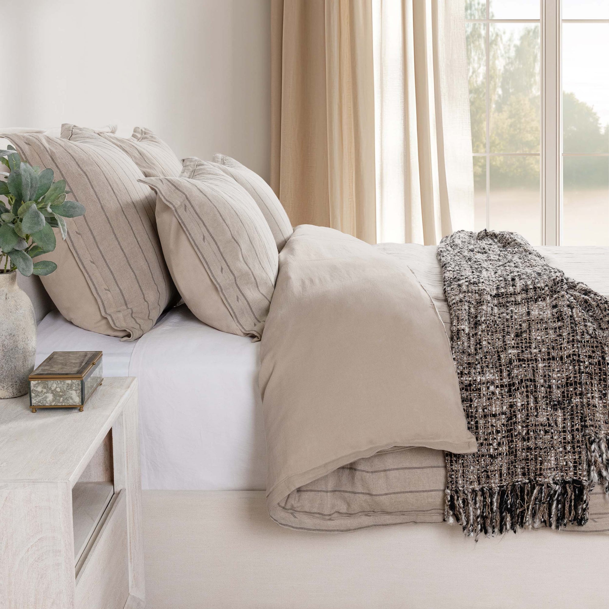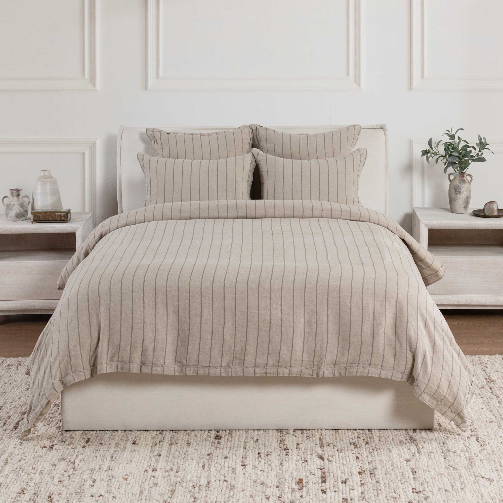The Monaco Duvet is crafted from soft Belgian Flax linen with a subtle stonewash finish. Its woven pinstripe design adds texture and elegance, while corner ties ensure a secure insert. This duvet layers beautifully with other bedding for a polished, comfortable bedroom look.