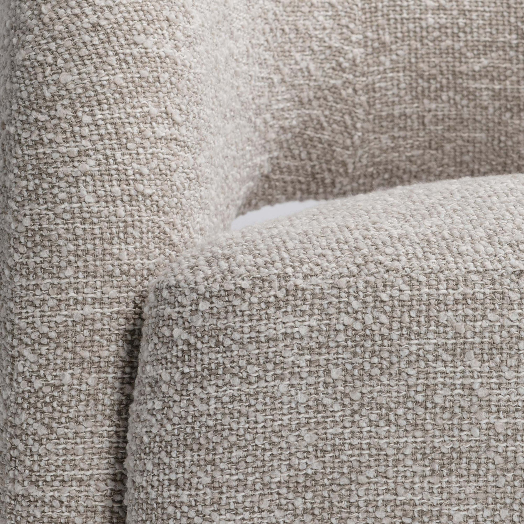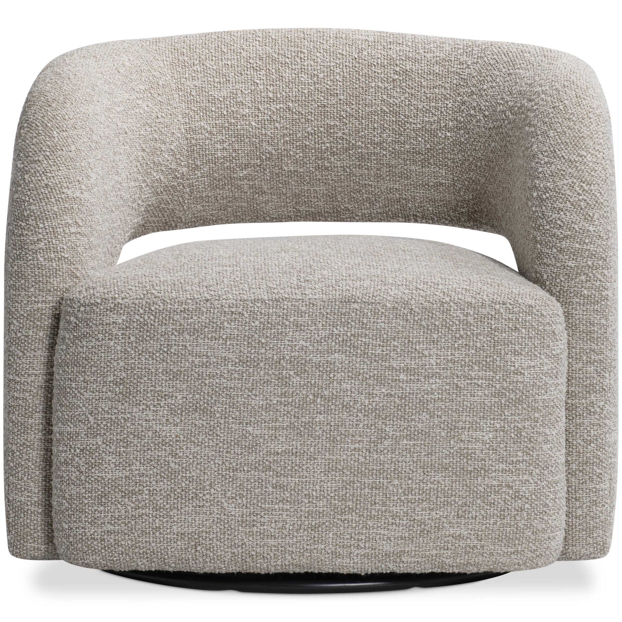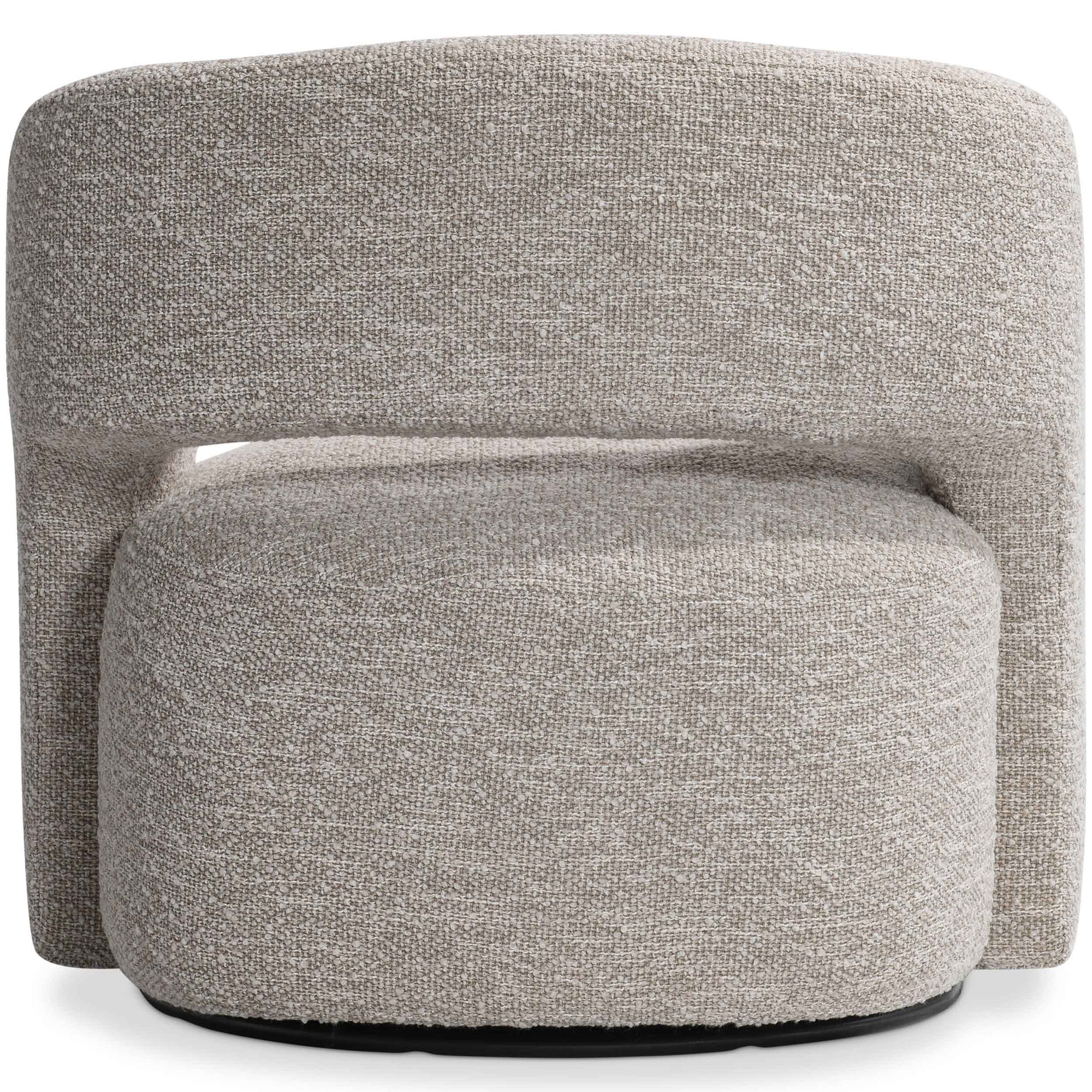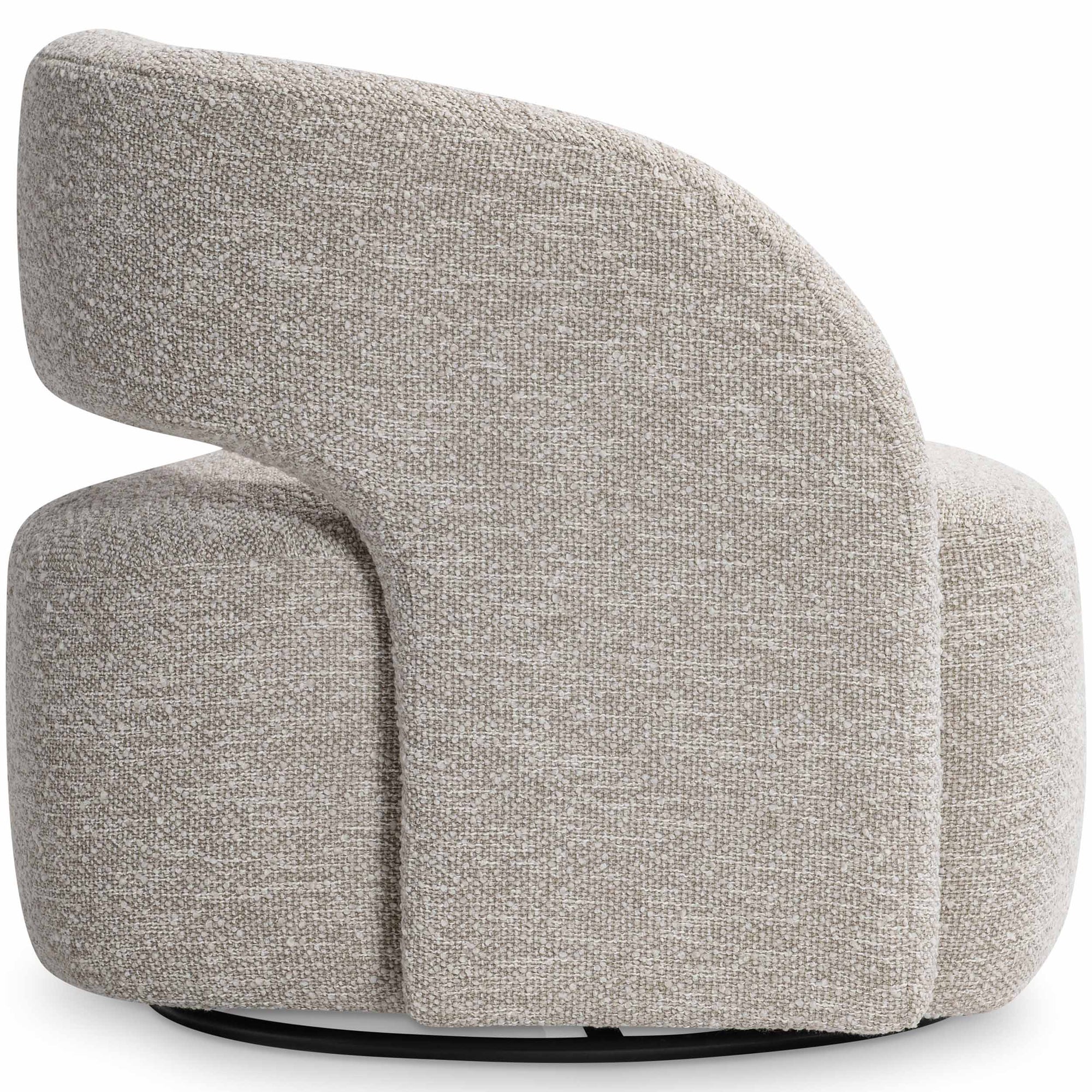The Chloe Swivel Chair features a unique retro style, highlighted by a shelter arm and a peek-a-boo back. The arms and back are formed from one continuous, elegant arc that sweeps from side to side, surrounding a deep and comfortable seat. A hidden swivel base offers smooth movement, allowing the chair to rotate its viewpoint with ease.