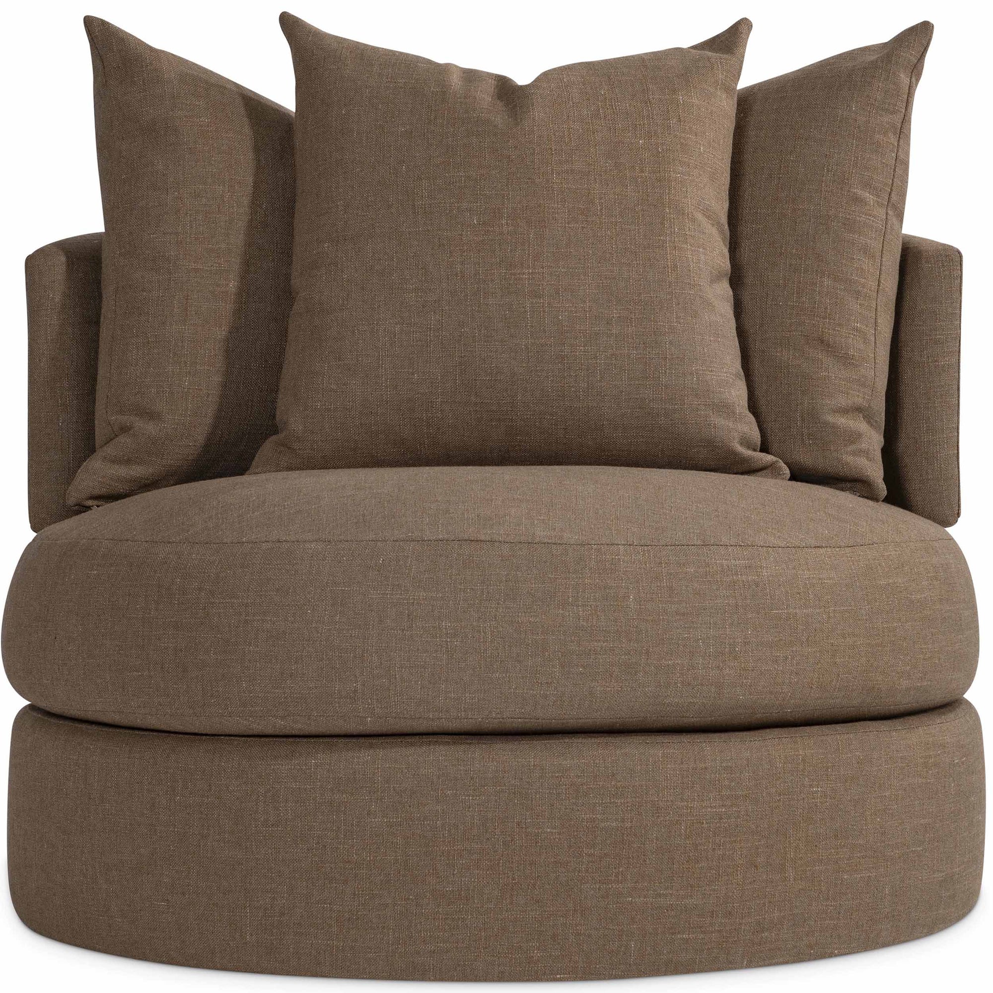 The Colby Swivel Chair features a unique T-back design that creates a cozy, sheltering shape. A deep, round cushion fits perfectly into the frame, while several sumptuous throw pillows offer incredible, sink-in comfort. A hidden swivel base provides a smooth, seamless turn, making this the perfect chair for relaxing.