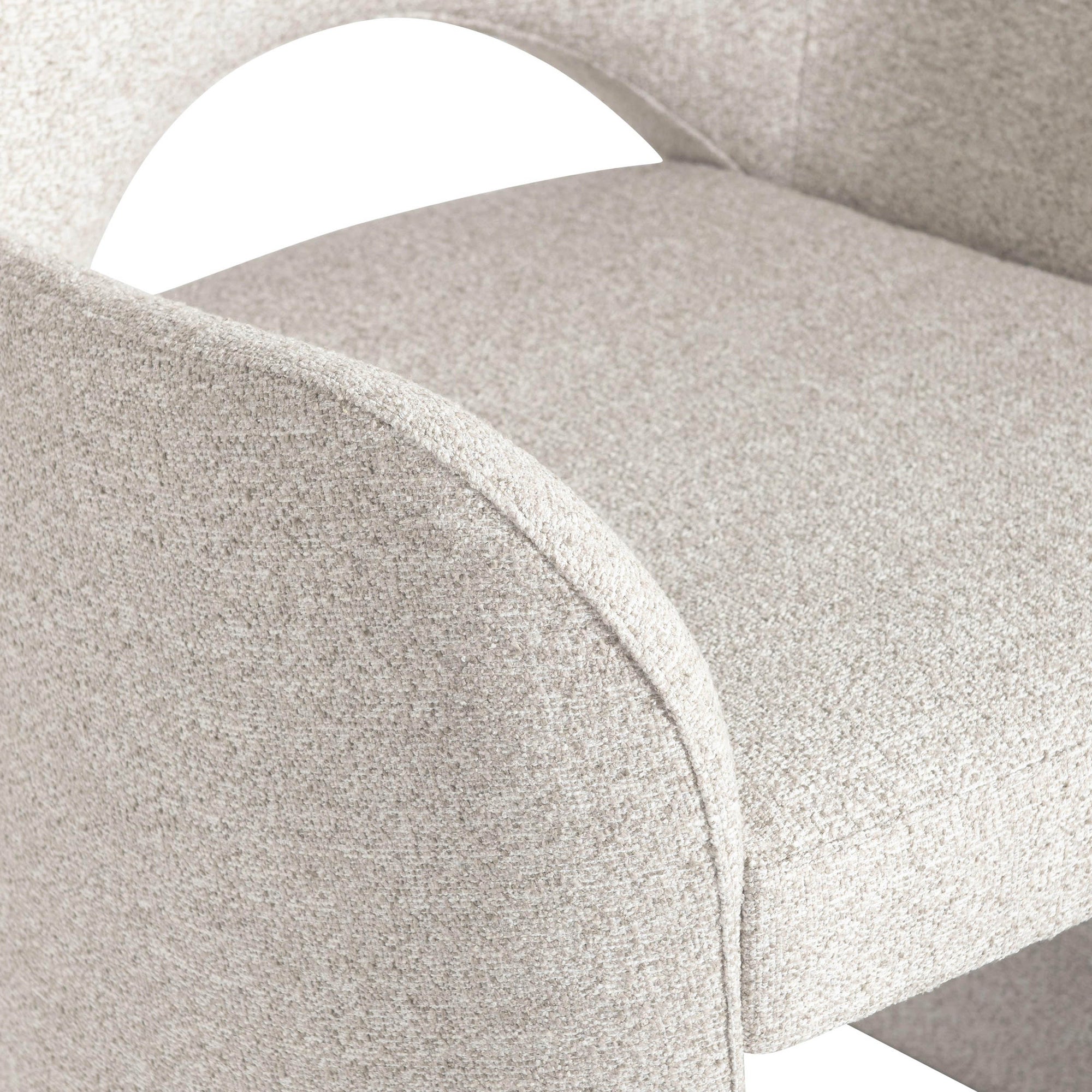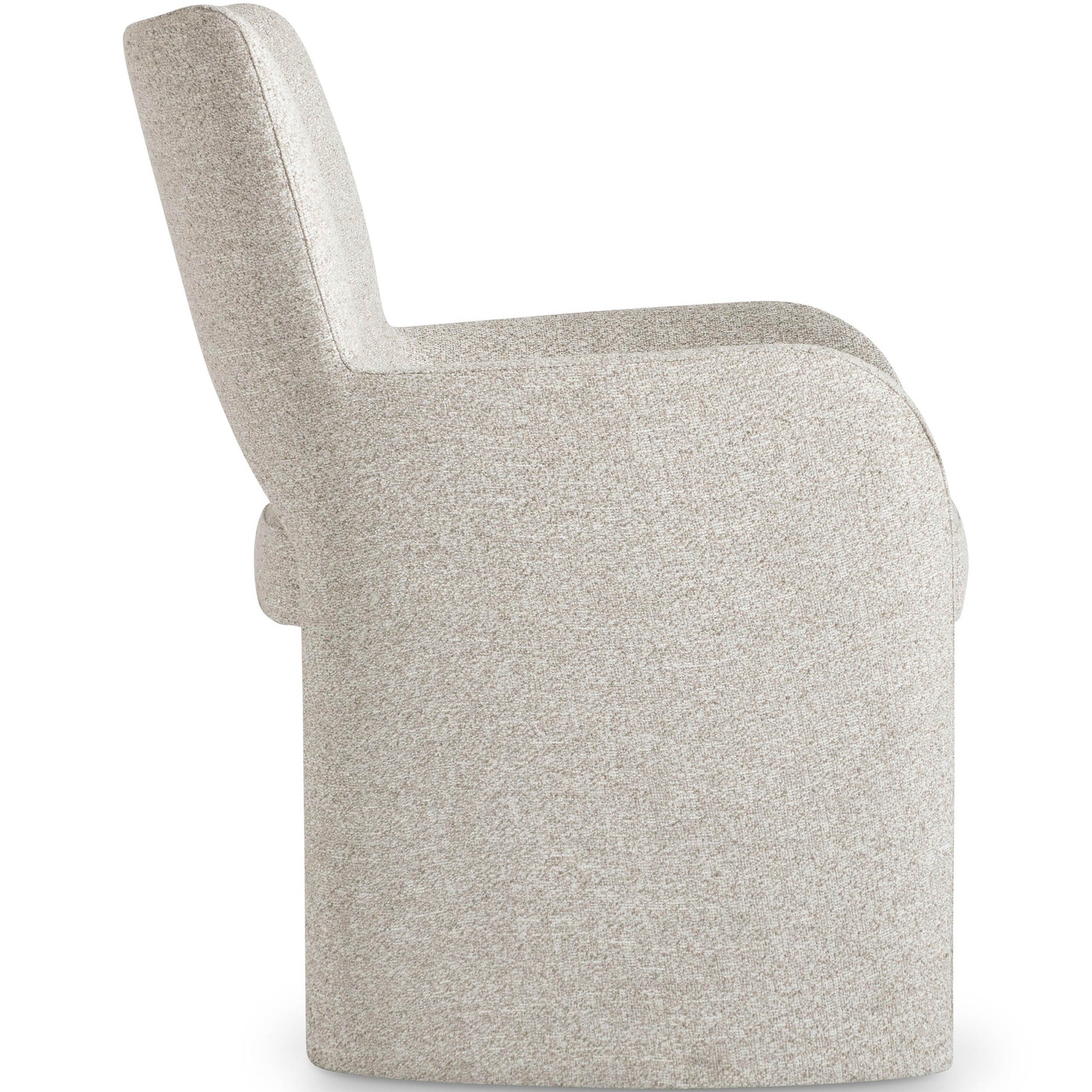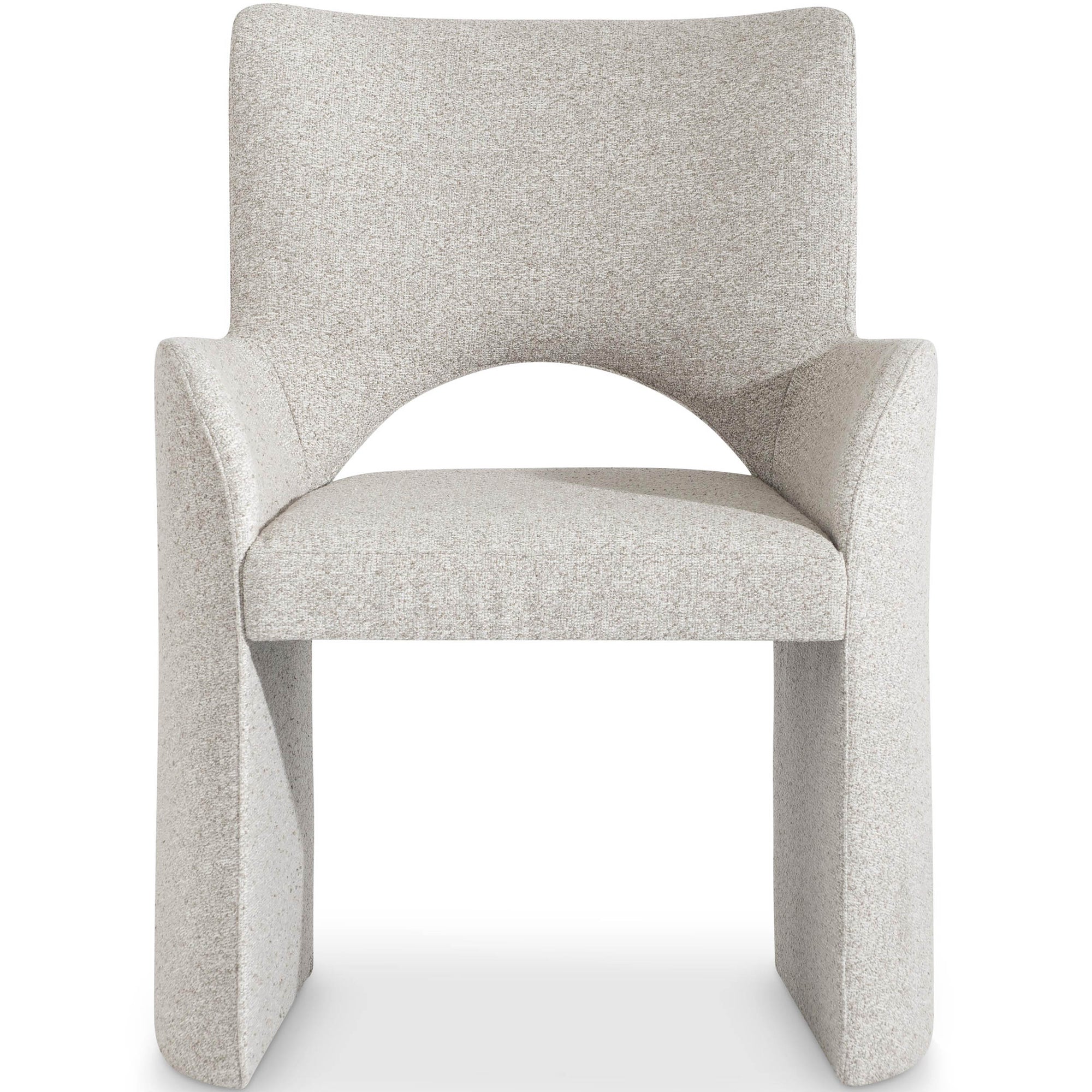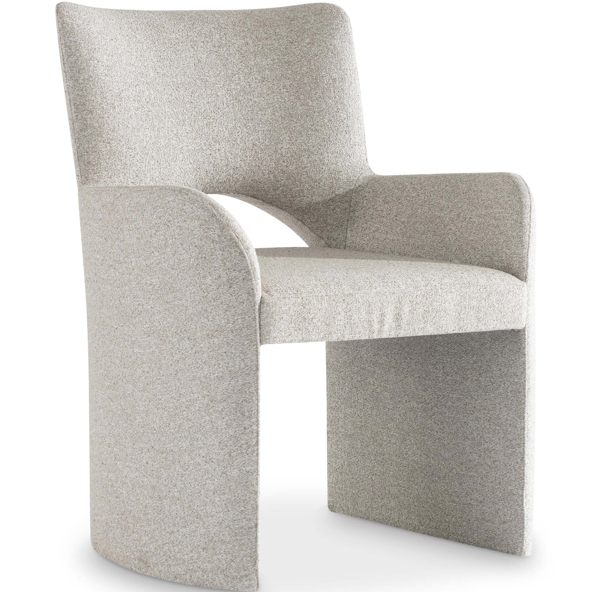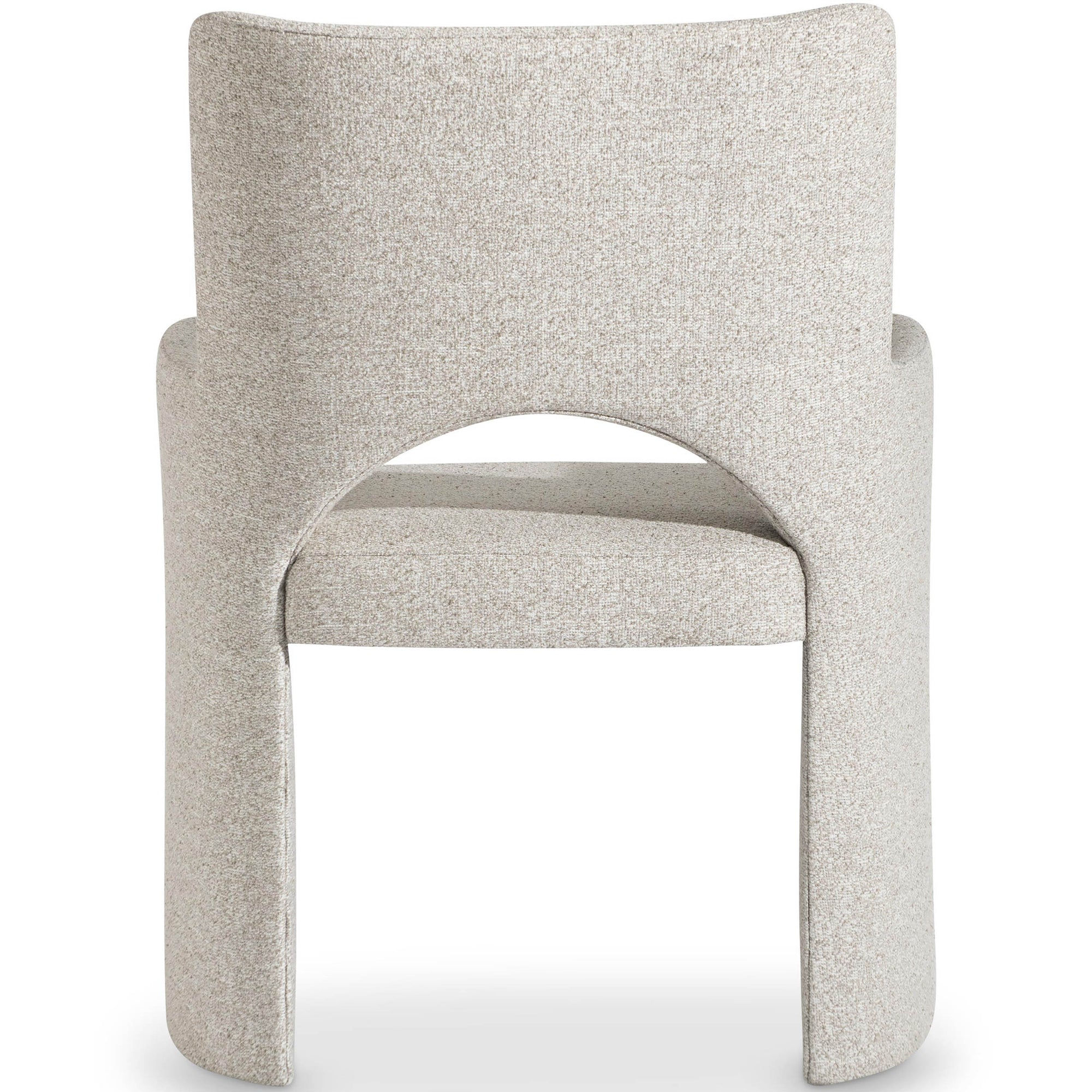 The Loggia Cutout Arm Chair is defined by its beautifully flowing curves, featuring a unique shelter back that sweeps around to form the sides. The arms flare gently away from the seat and are accented with a welt detail for a tailored touch. A signature open curve in the lower back adds a sense of lightness and sophisticated style to this elegant dining chair.
