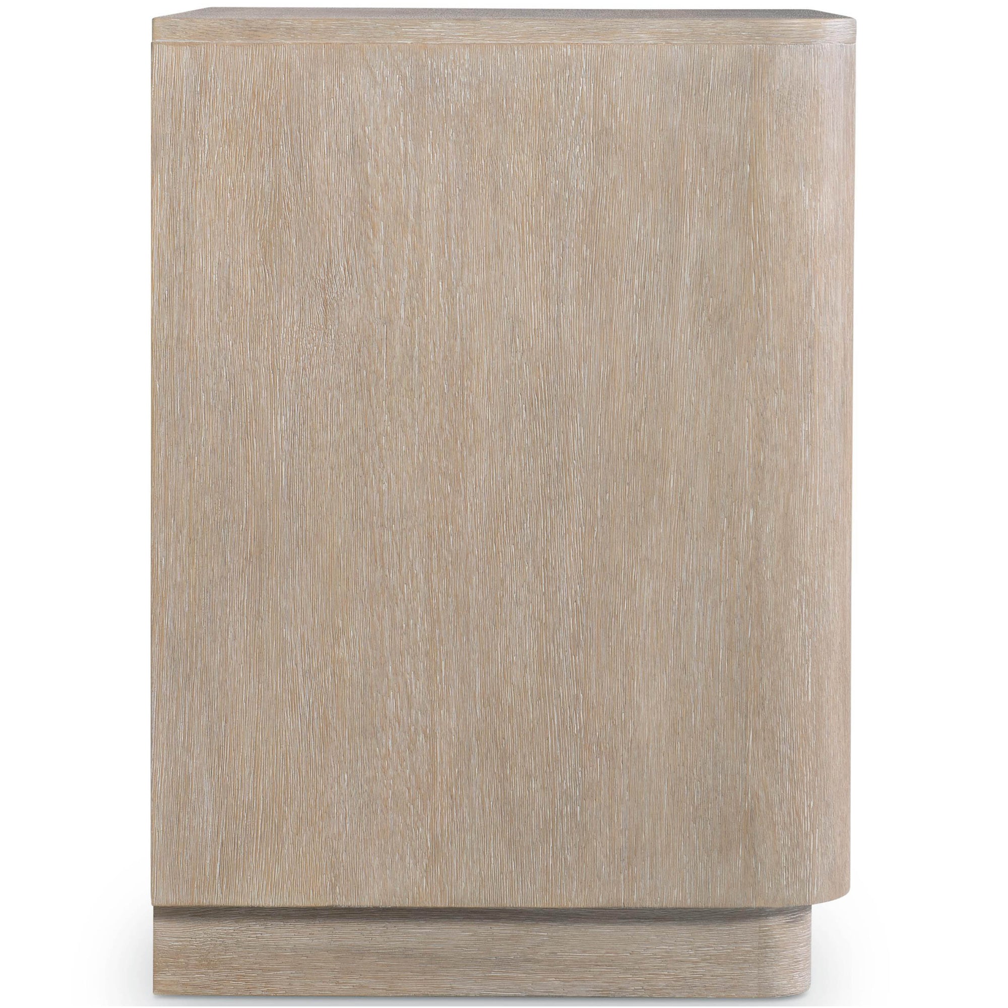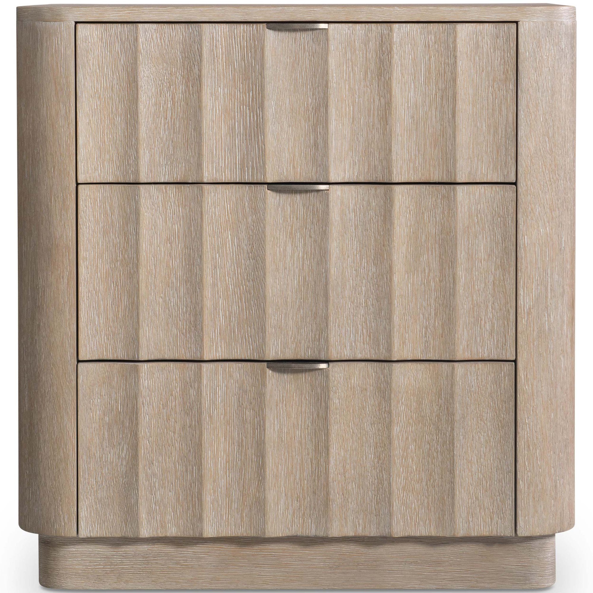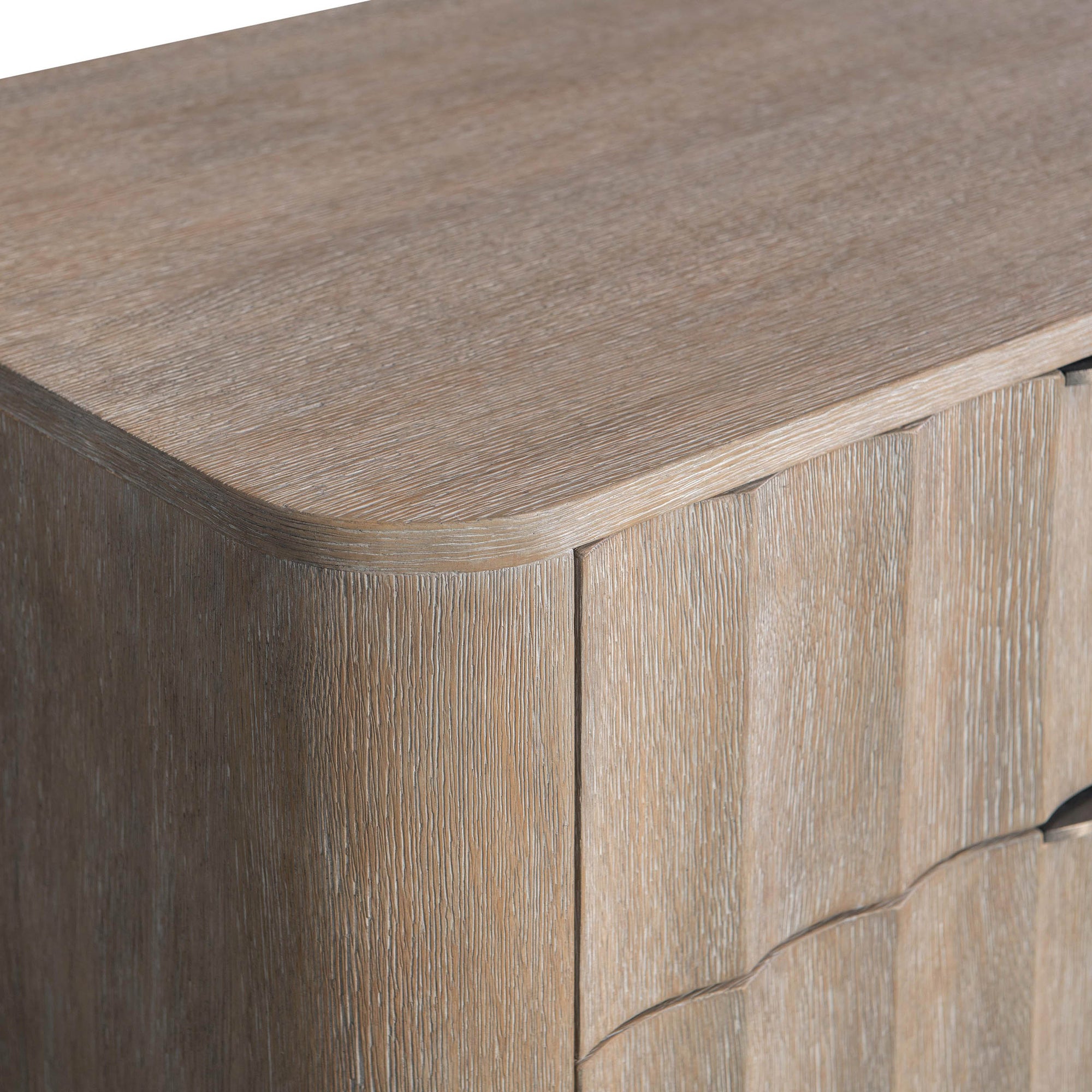 The Loggia Nightstand creates stunning dimension and contrast with beautifully scalloped fronts on its three drawers. Finished in a light Aria hue, the wire-brushed oak case features a top with softened, rounded corners and rests on a solid plinth base. Each drawer is accented with a sleek stainless steel tab pull, and a convenient two-port A+C USB charging unit is included for modern functionality.