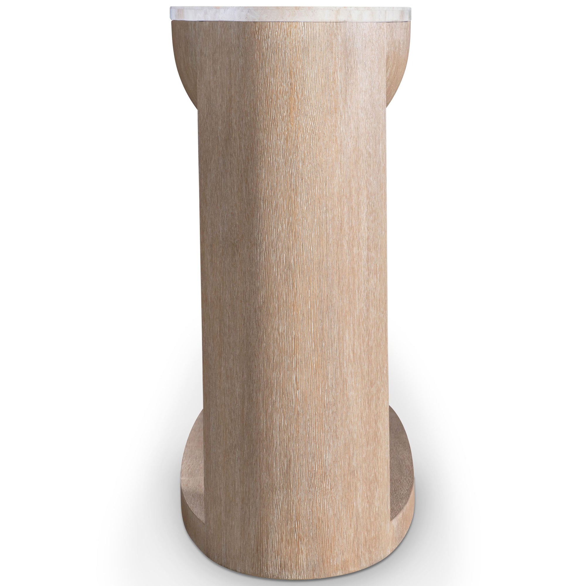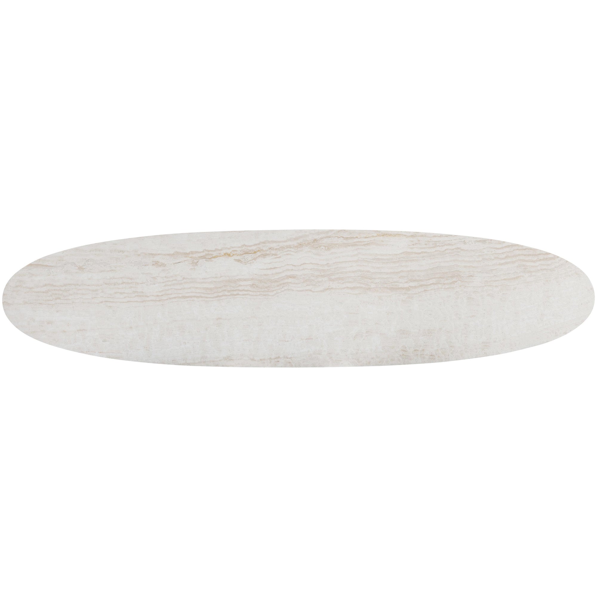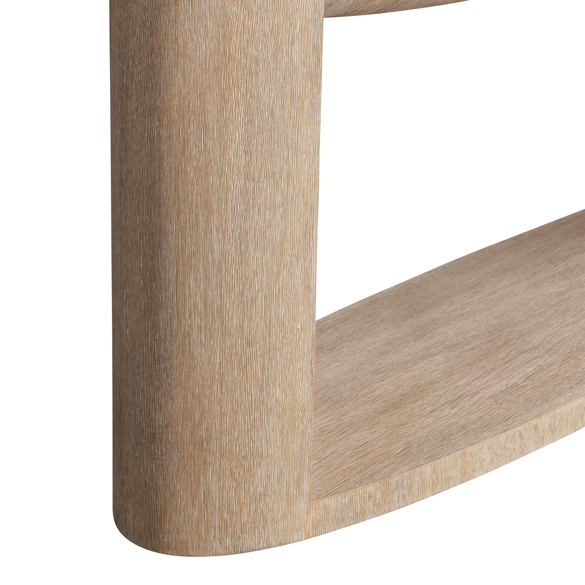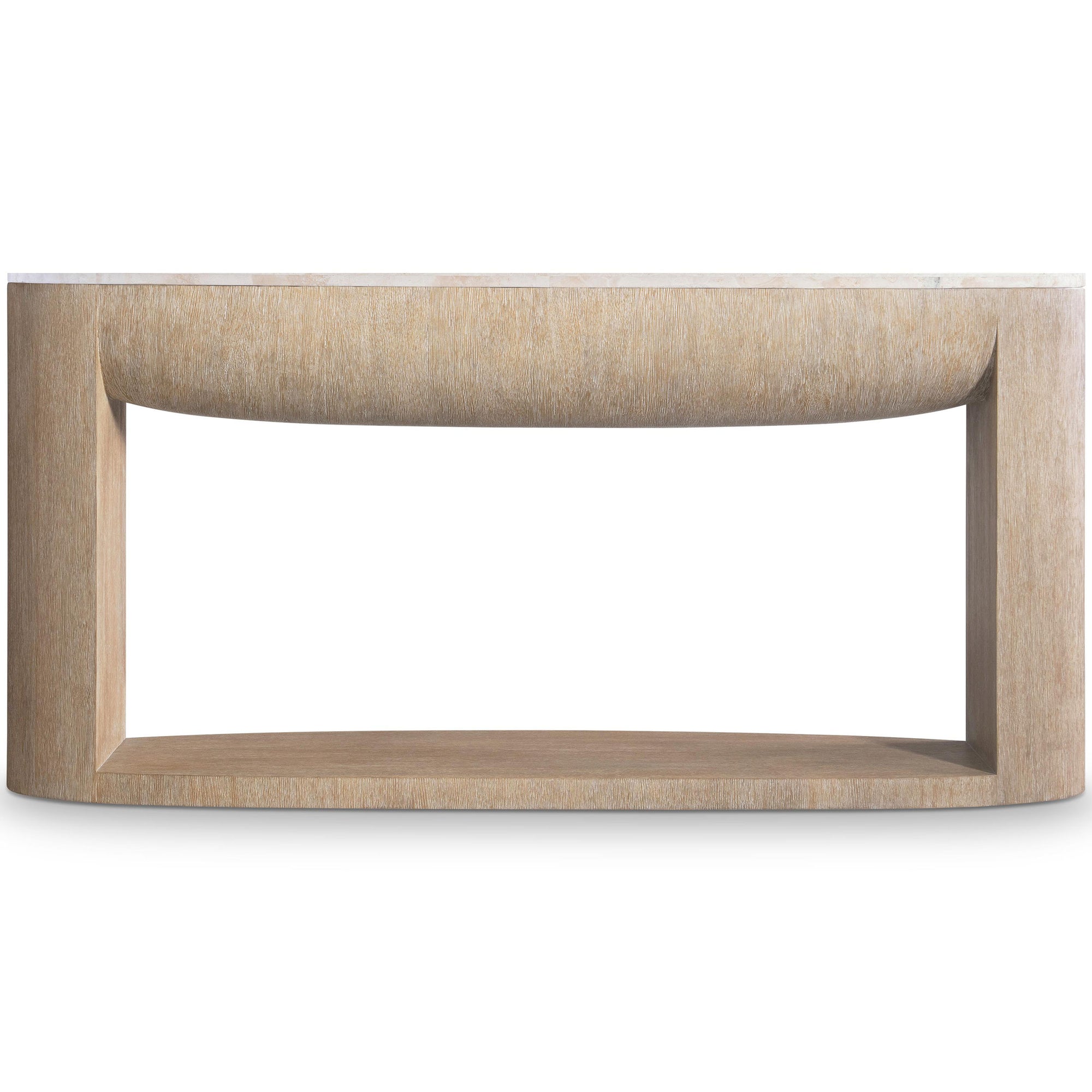 The Loggia Oval Top Console Table showcases a stunning interplay of convex and concave shapes for a modern sculptural look. Crafted from cast resin with a realistic wood grain texture, it features a smooth travertine stone top that adds depth and contrast. Elegant and contemporary, this console table makes a refined statement in any living or entry space.