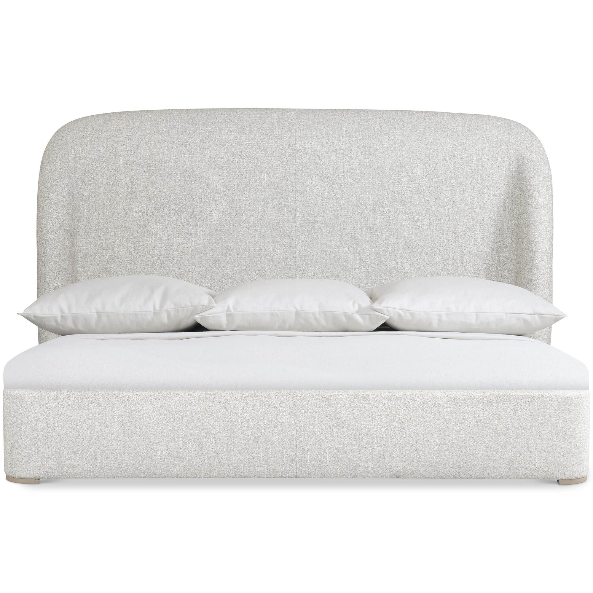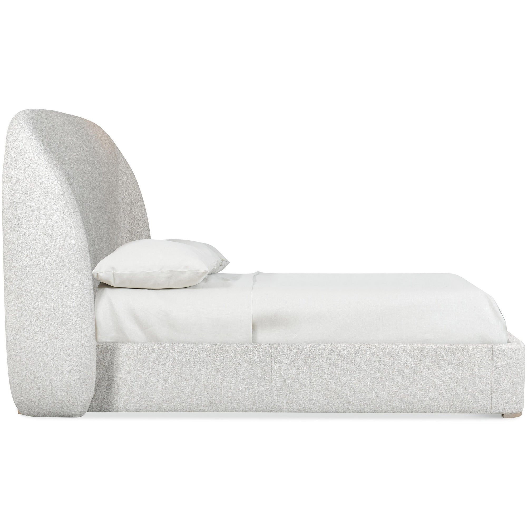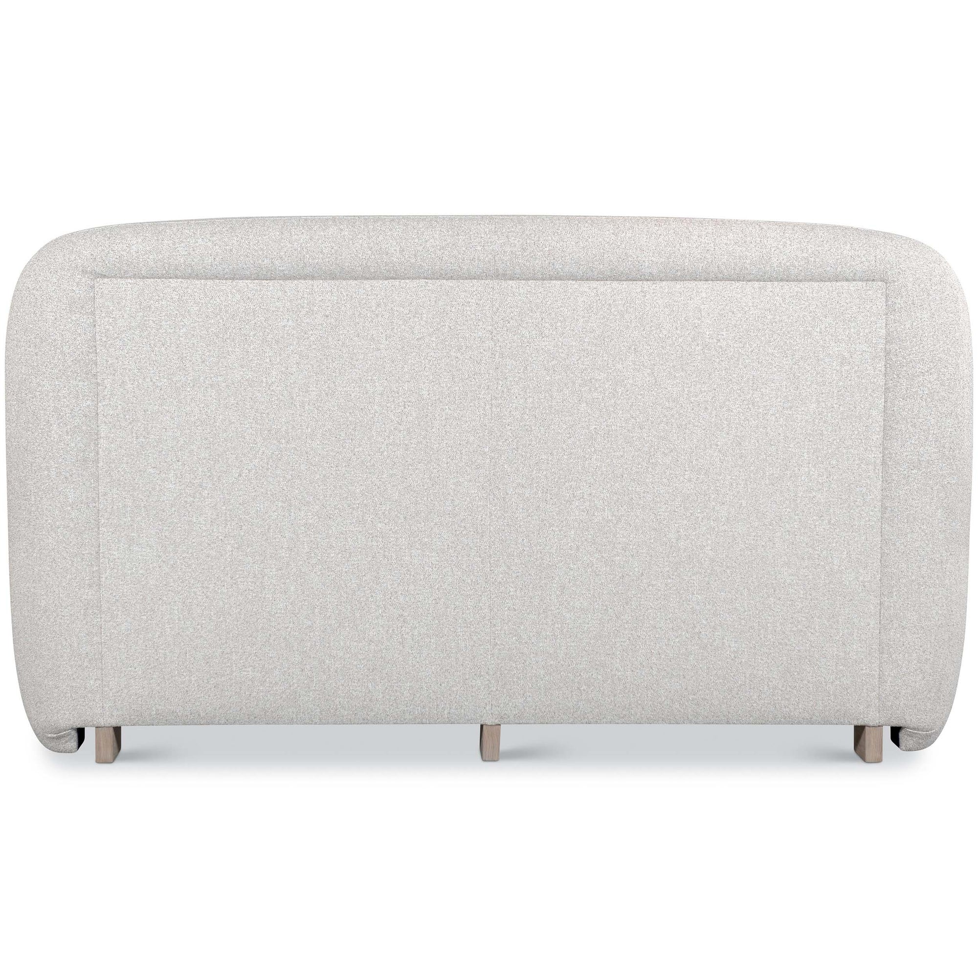 The Loggia Shelter Bed reimagines modern comfort with its beautifully curved and upholstered panels. The sheltering headboard gently arcs toward the floor, featuring soft wings that embrace the side panels for a cozy, enveloping feel. This stunning design is supported by exposed, wire-brushed oak feet in a light Aria finish, creating a perfect blend of soft shapes and organic texture.