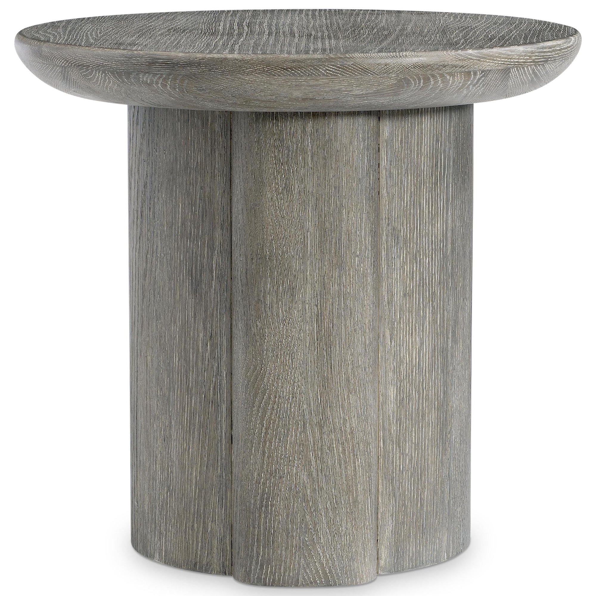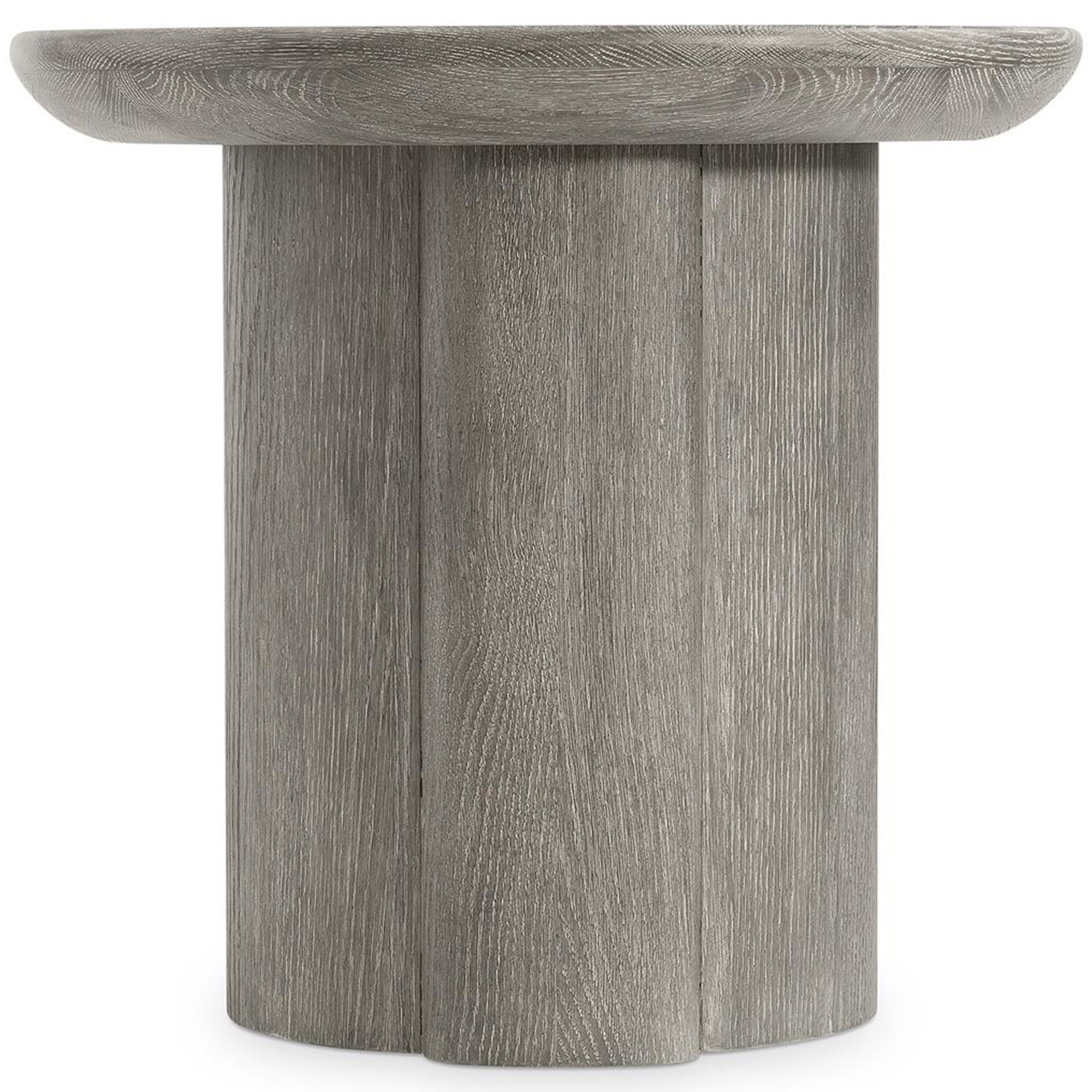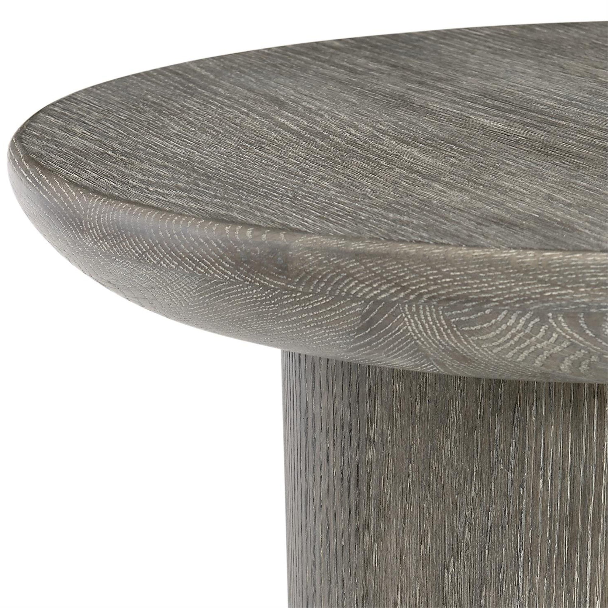 The Monolith Round Side Table showcases a harmonious balance of curves and linear detailing. Crafted from wirebrushed oak in a rich Puma finish, the design features a smooth round top set on a circular pedestal base, with a bold vertical panel accent that adds sculptural interest.