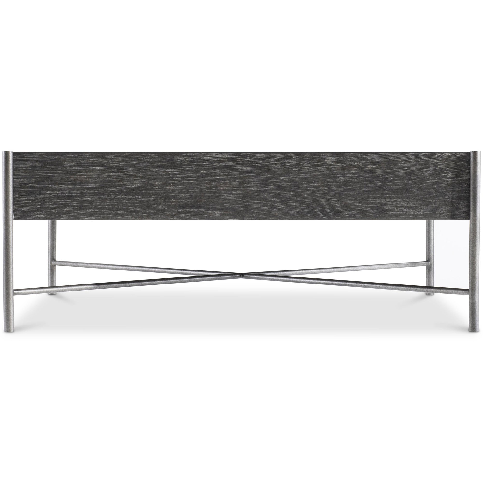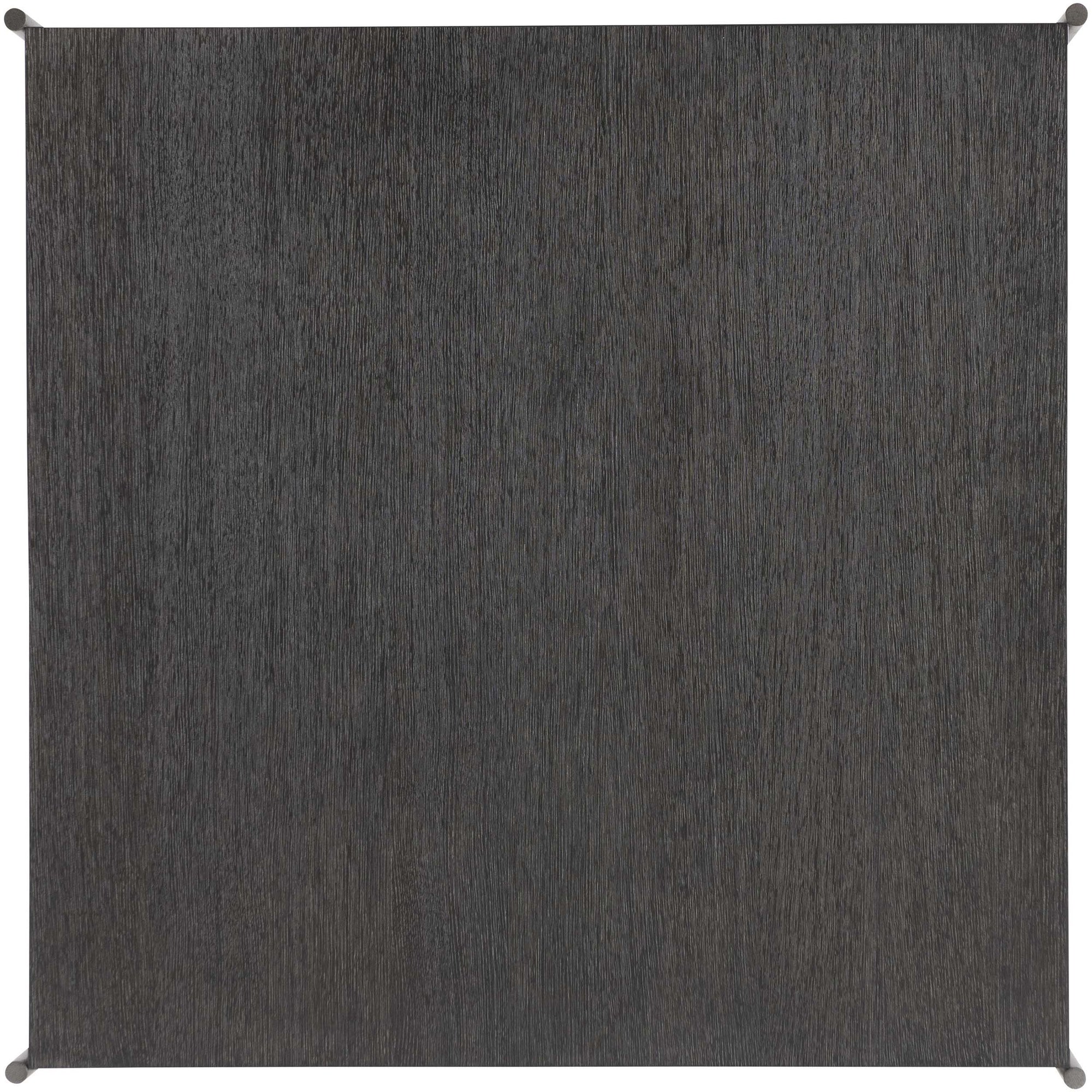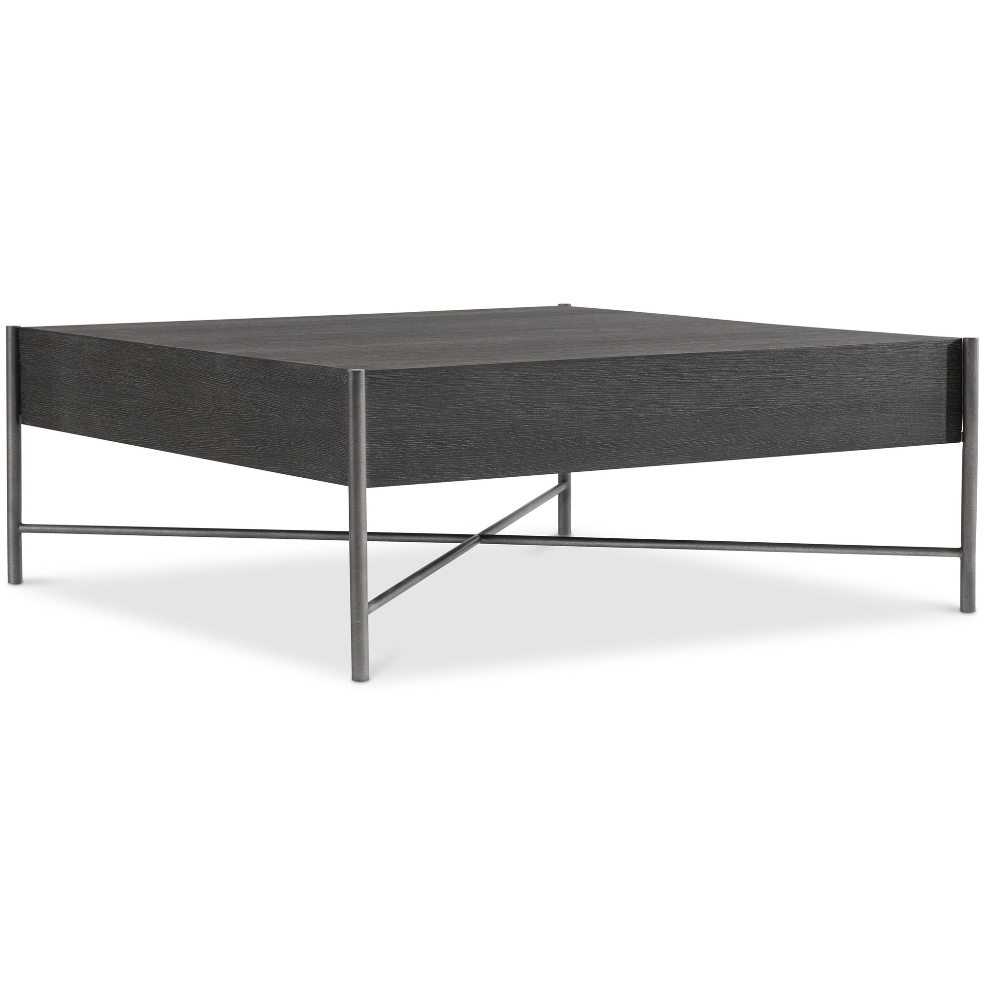 The Outline Cocktail Table showcases a minimalist design with a light, open structure. Slim metal pillars support each corner of the wooden top, which appears to float above an elegant X-shaped stretcher. Finished in a deep Kohl tone with subtle texture, the table balances strength and refinement for a modern aesthetic.