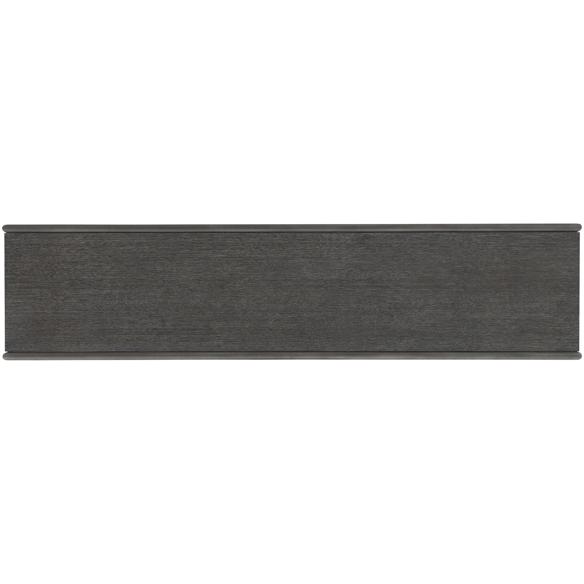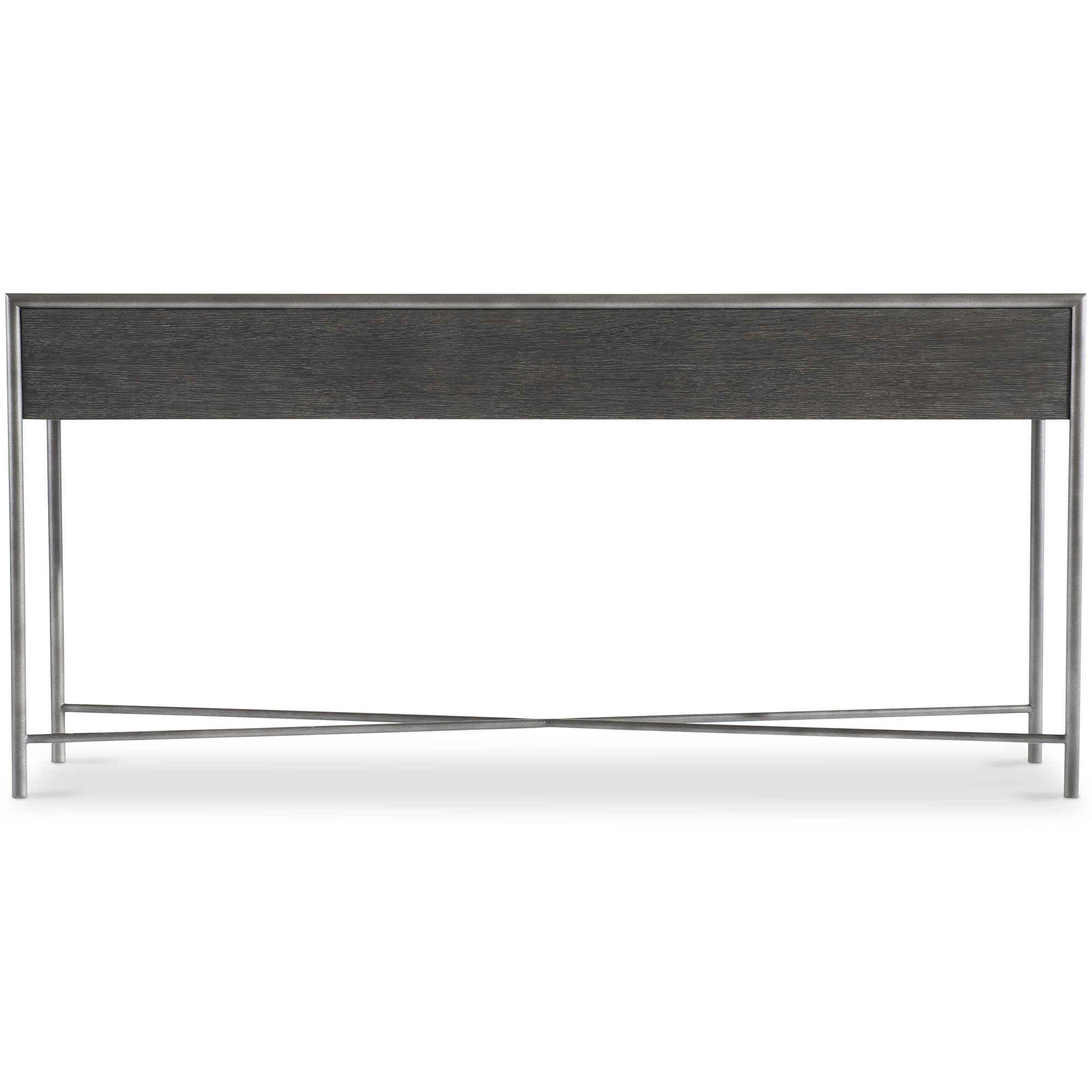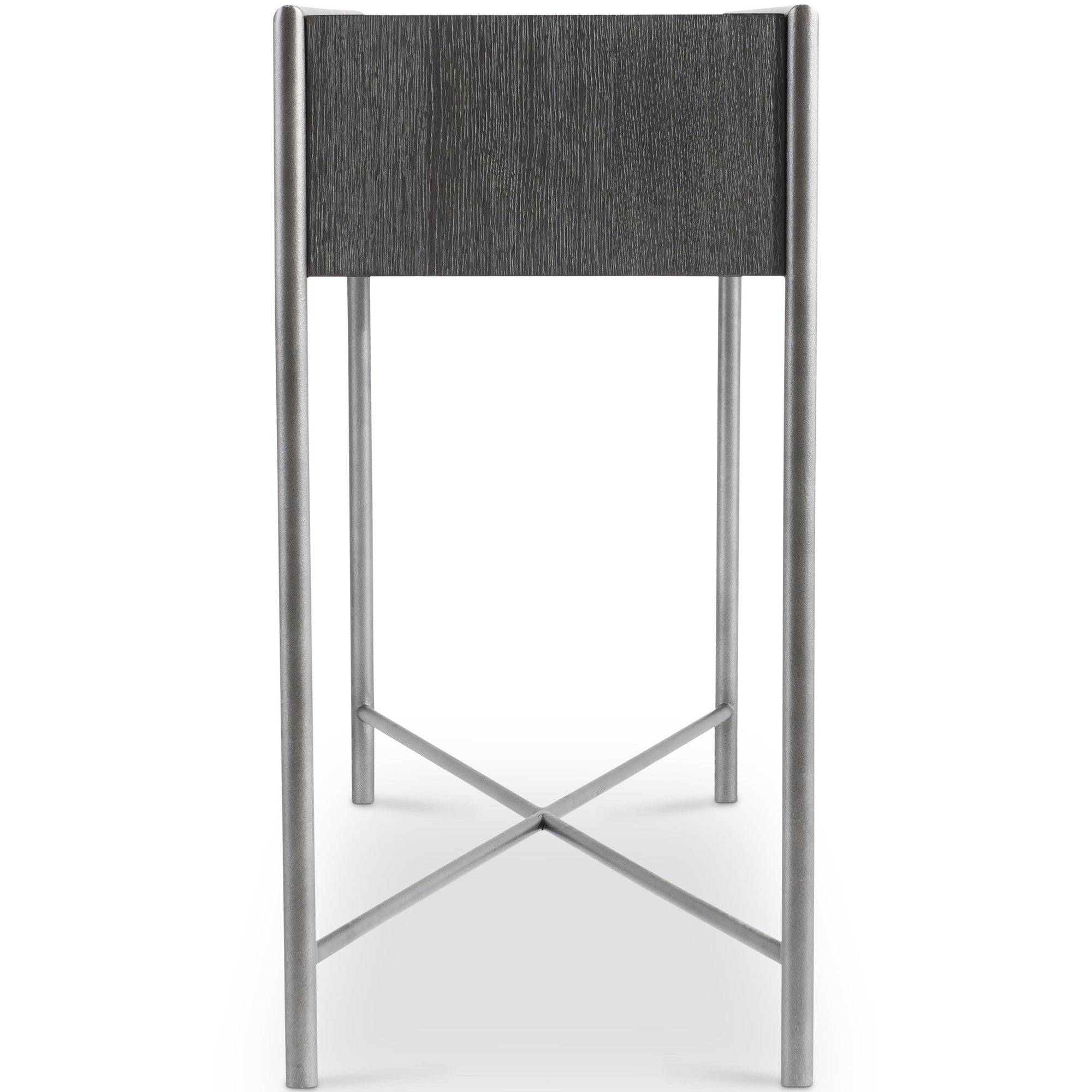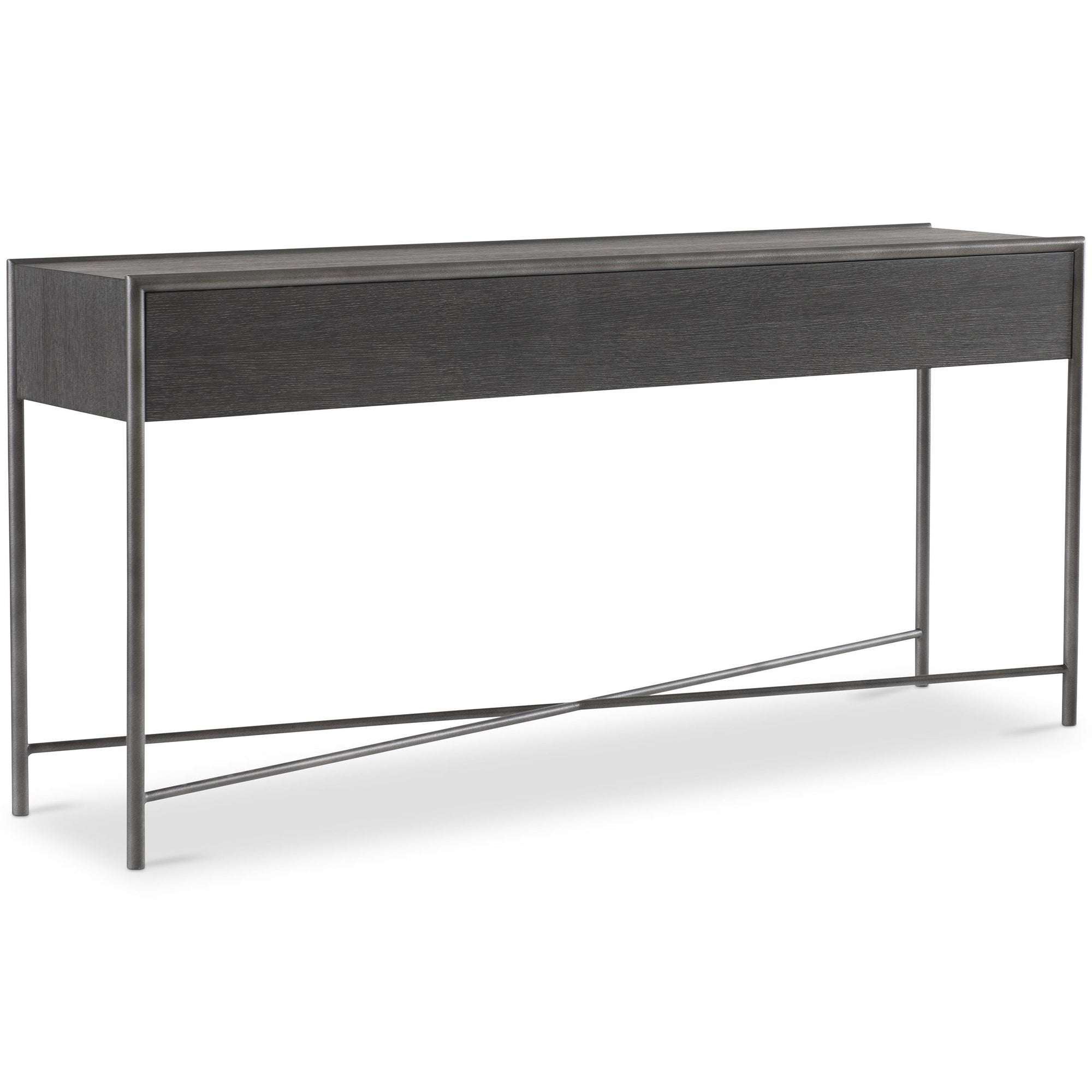 The Outline Console Table features a distinctive metal frame that wraps around the wooden tabletop. The metal finished in Atra extends to the floor and crosses to form a sleek stretcher. The look is casual yet refined, showcasing minimalist style and expert craftsmanship.