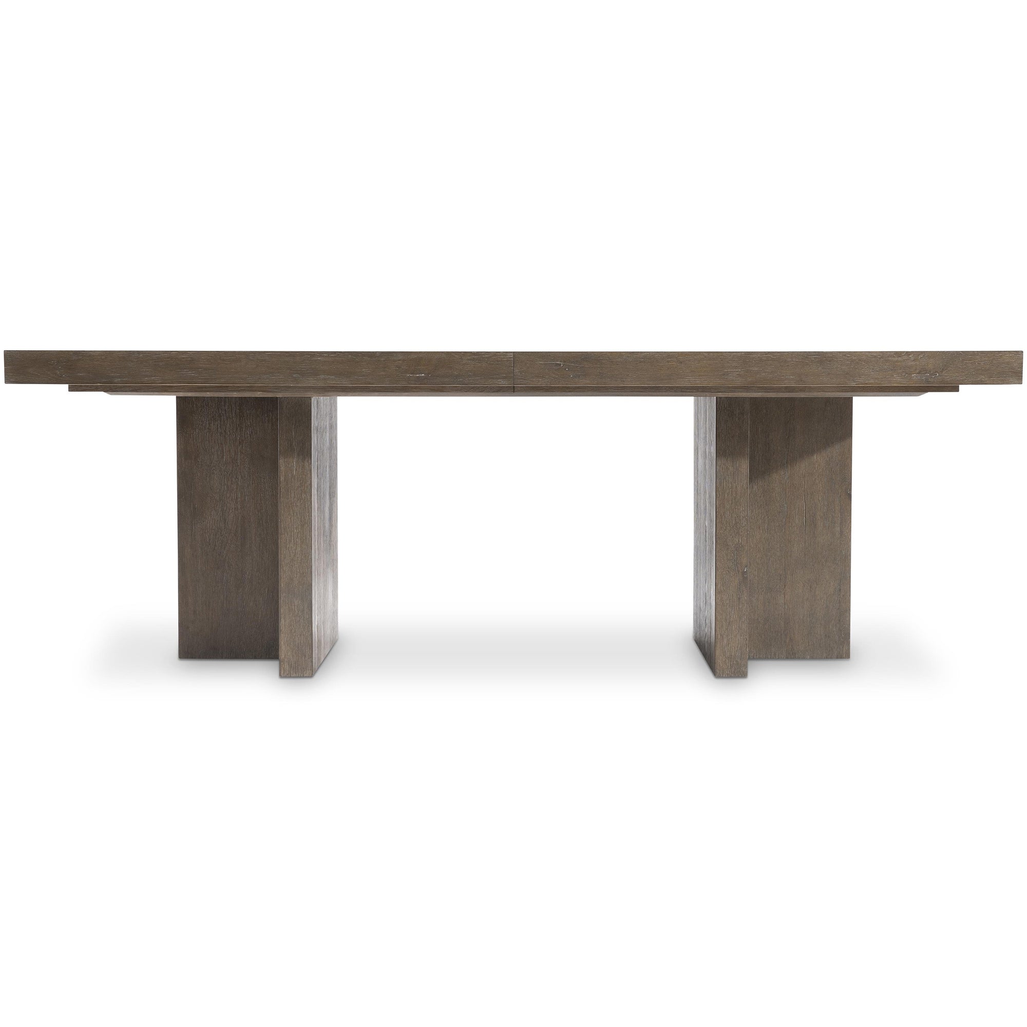 The Outline Rectangular Dining Table is inspired by the simple, bold forms of the Arts and Crafts style, making an organic statement in deeply textured, wire-brushed oak. The design features a substantial top supported by an angled double pedestal base formed from clean, rectilinear panels. Finished in a rich Cassel hue, this table includes a 20-inch leaf, allowing you to easily extend the surface for larger gatherings.