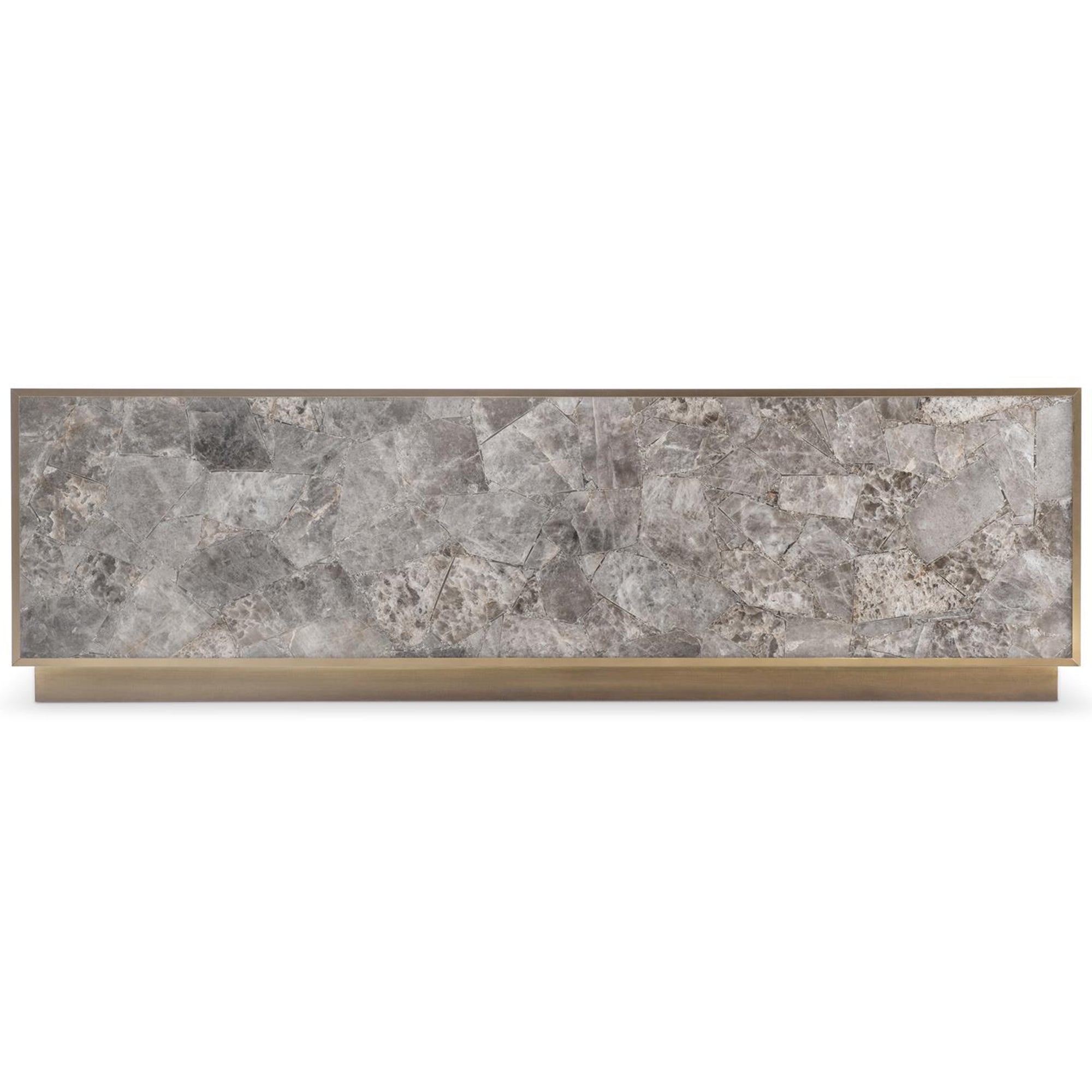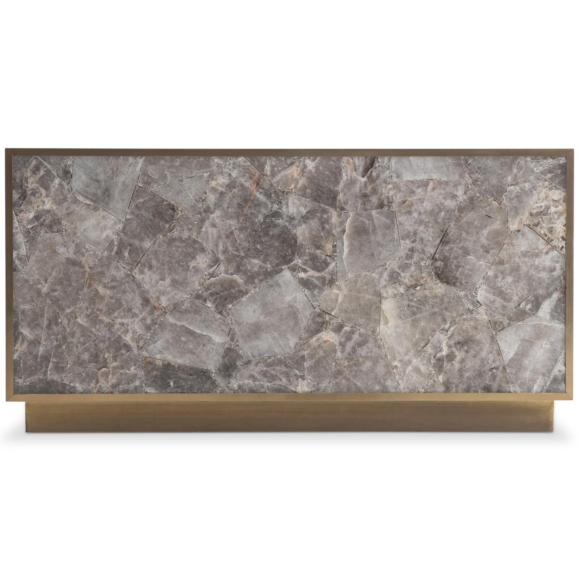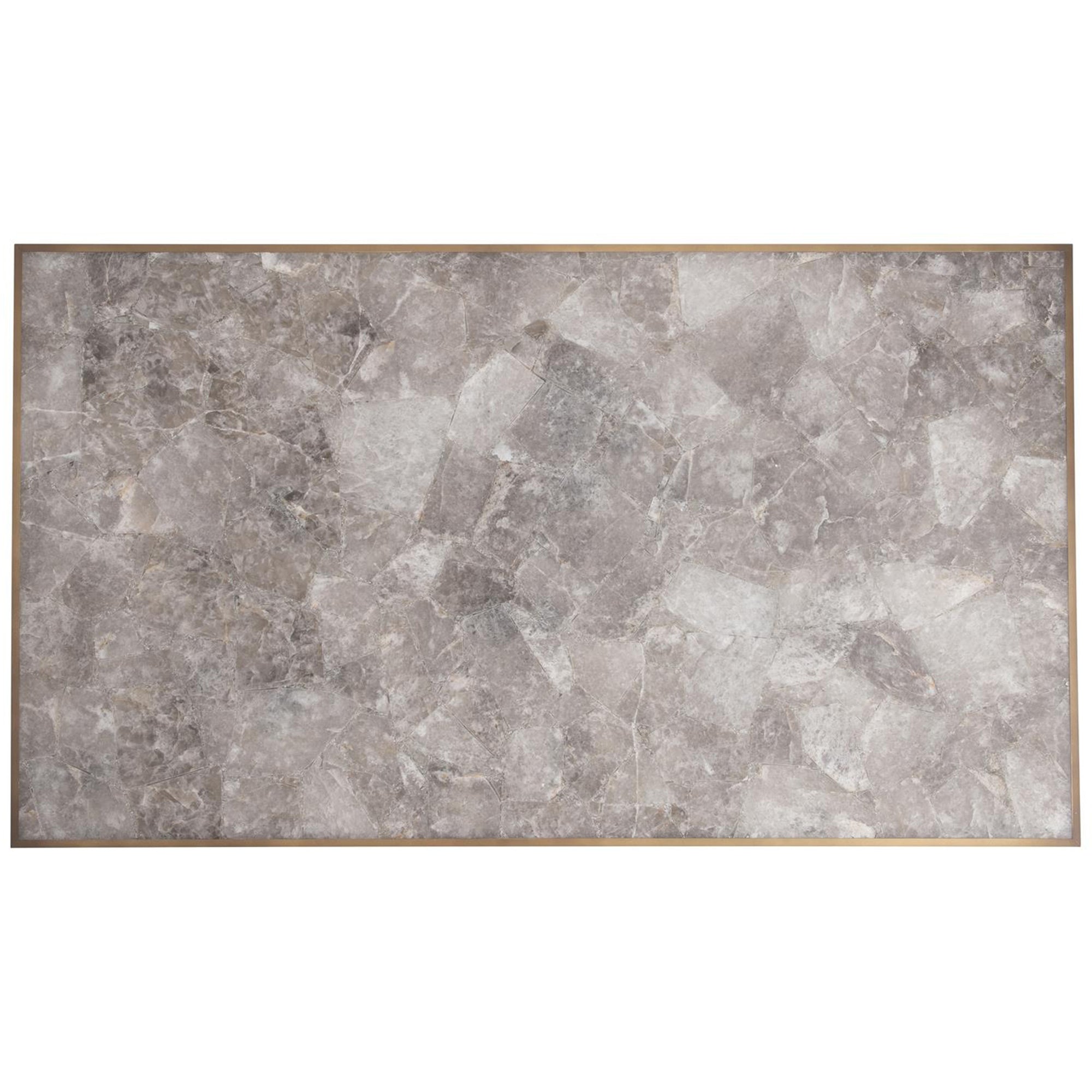 The Tildon Cocktail Table showcases natural luxury with a bold geometric silhouette. Framed in Aged Brass, panels of smoky quartz form a striking surface and sides, highlighting the natural beauty of the stone. Resting on a low plinth base and equipped with hidden casters, this glamorous piece merges organic materiality with refined metallic detail.
