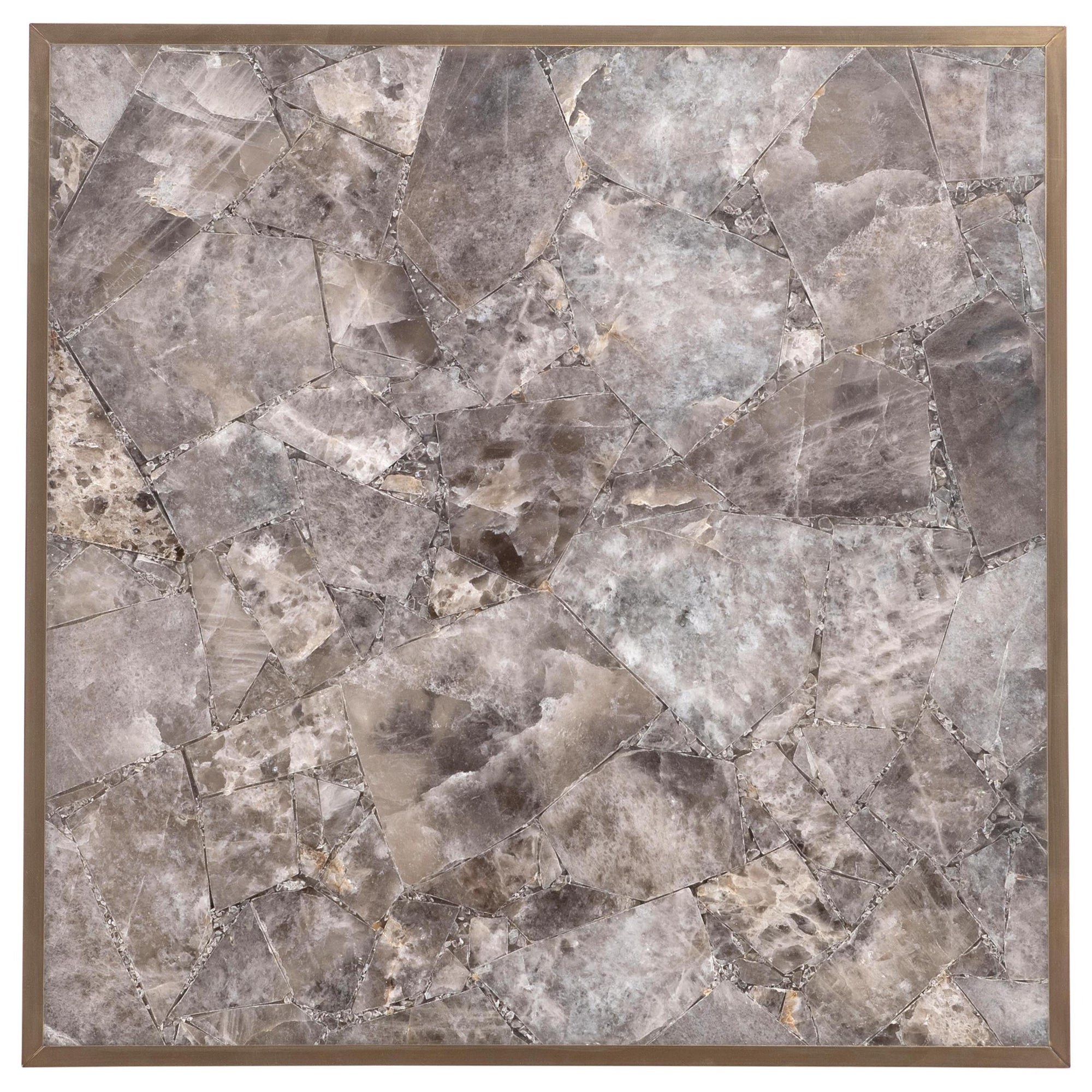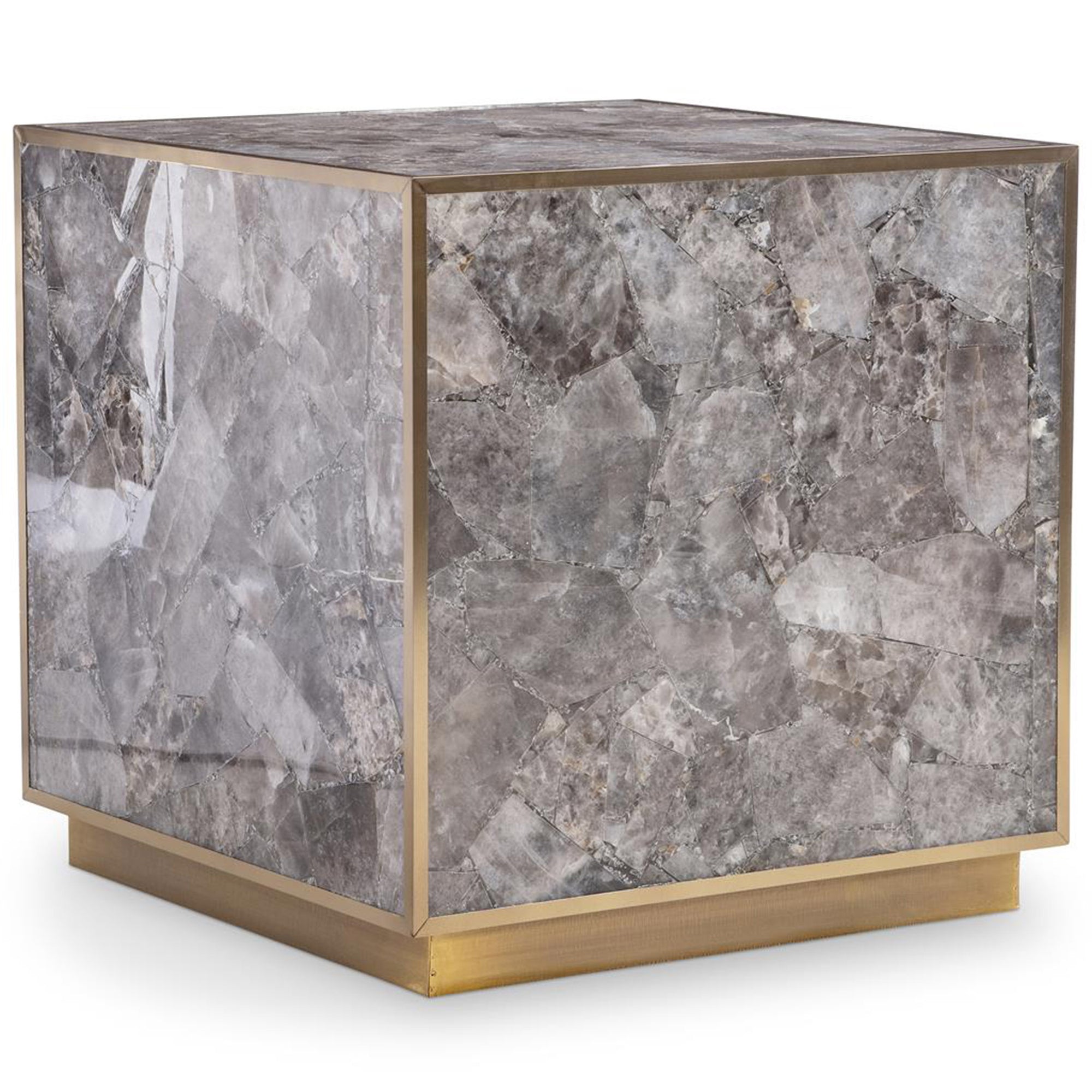 The Tildon Side Table blends natural stone with sleek brass framing for a bold, sculptural look. Featuring smoky quartz panels and a plinth base, this square side table exudes elevated style. Finished in luxurious Aged Brass, it brings organic beauty and modern glam to any space.