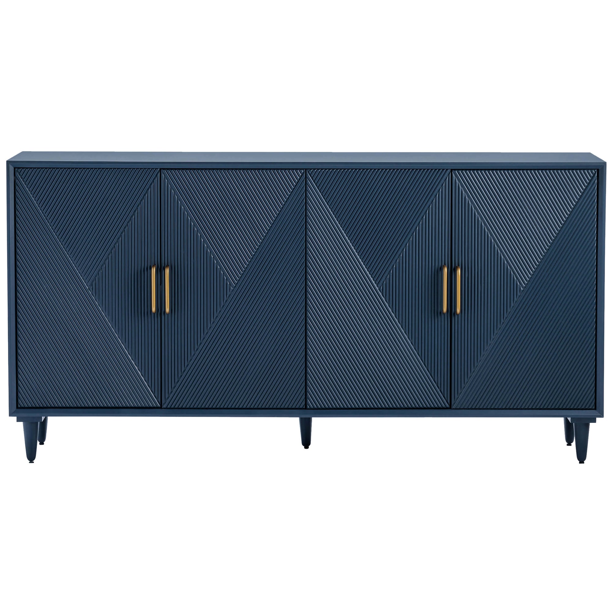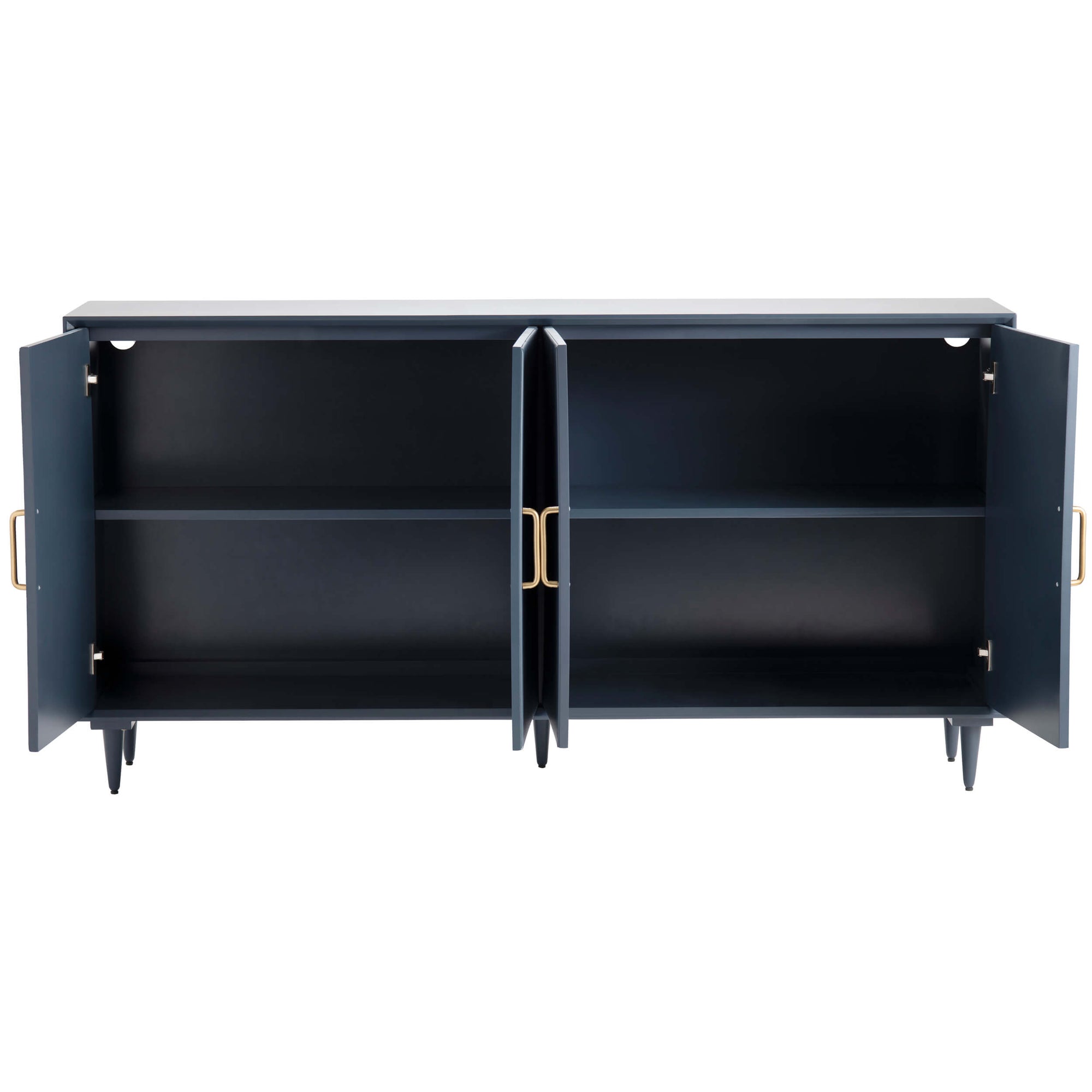 The Arvada 4-Door Sideboard combines bold style with practical storage for your dining or living space. Crafted from acacia wood, its striking blue finish is beautifully accented by sleek gold door pulls for a touch of modern elegance. Diagonal detailing across each cabinet door adds visual interest, while the dark exterior offers a refined balance. With four spacious doors, this sideboard provides ample room to organize dining essentials or entertainment accessories. Versatile and eye-catching, it’s the perfect blend of function and contemporary design.