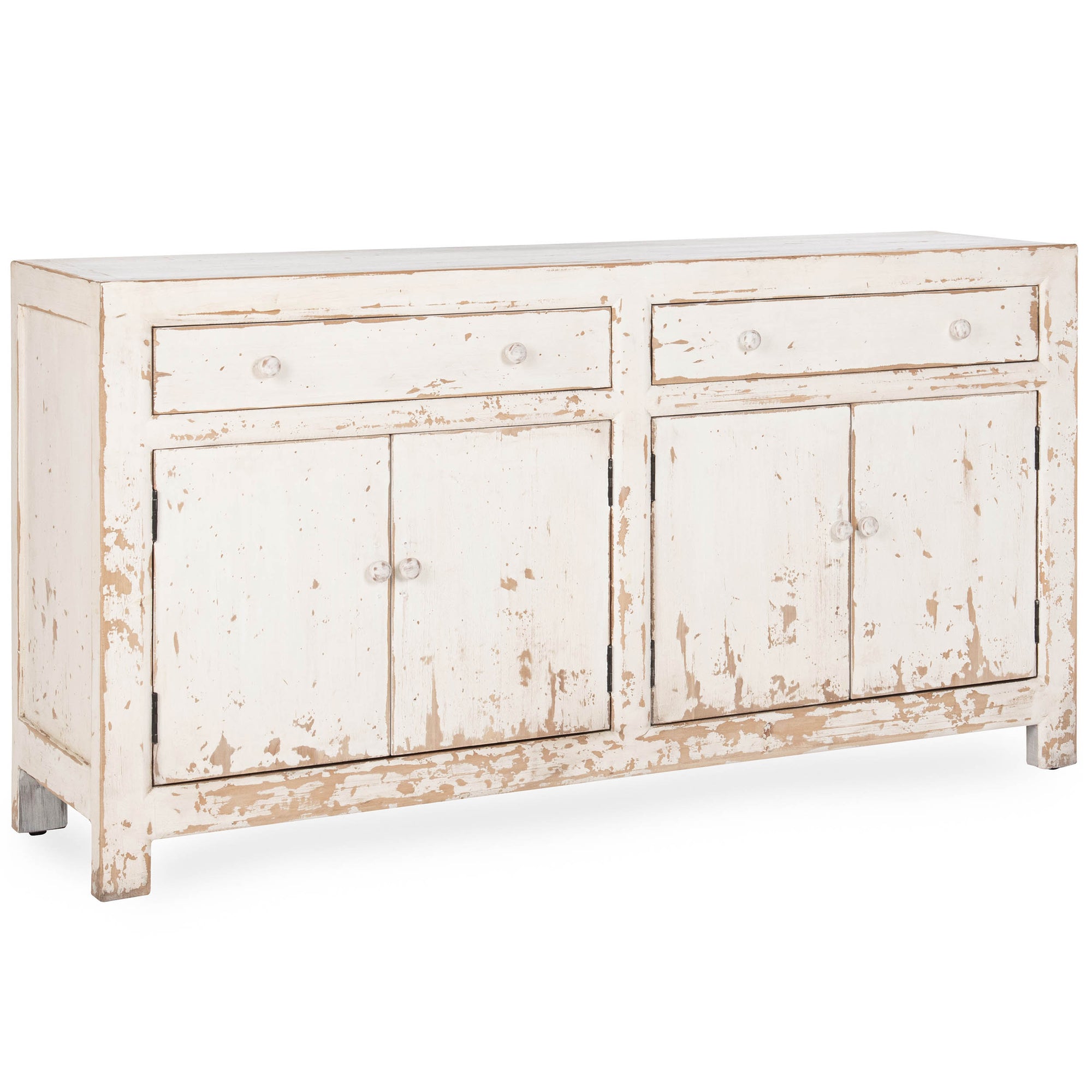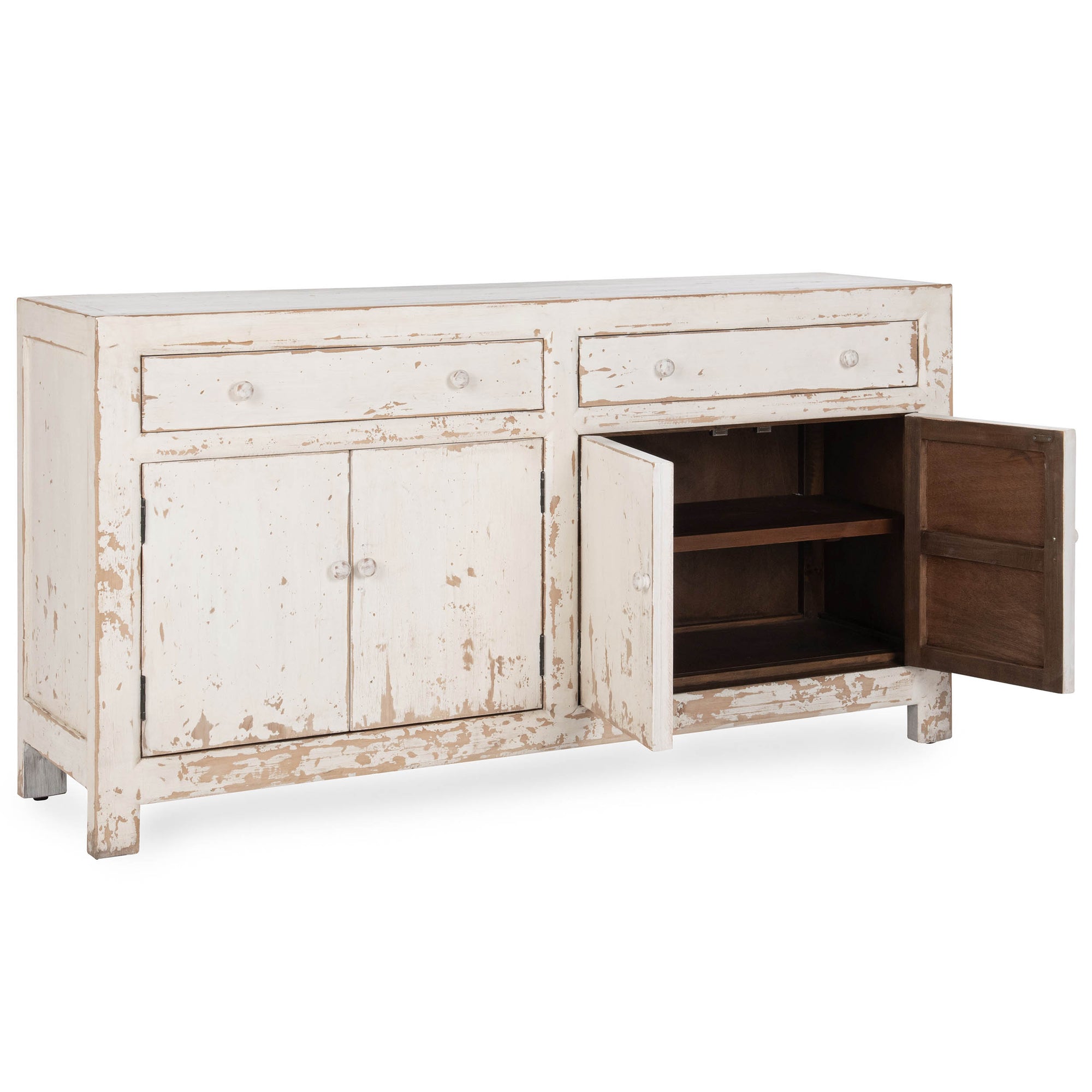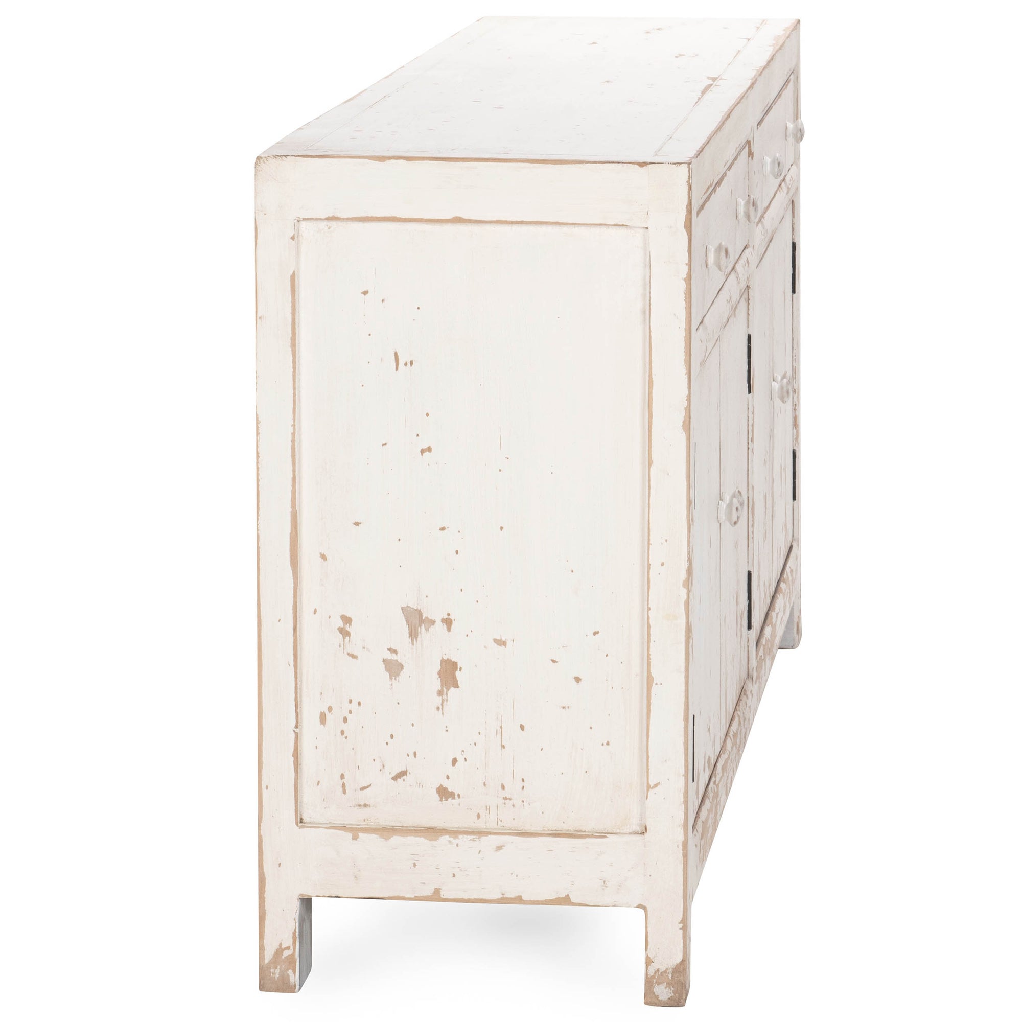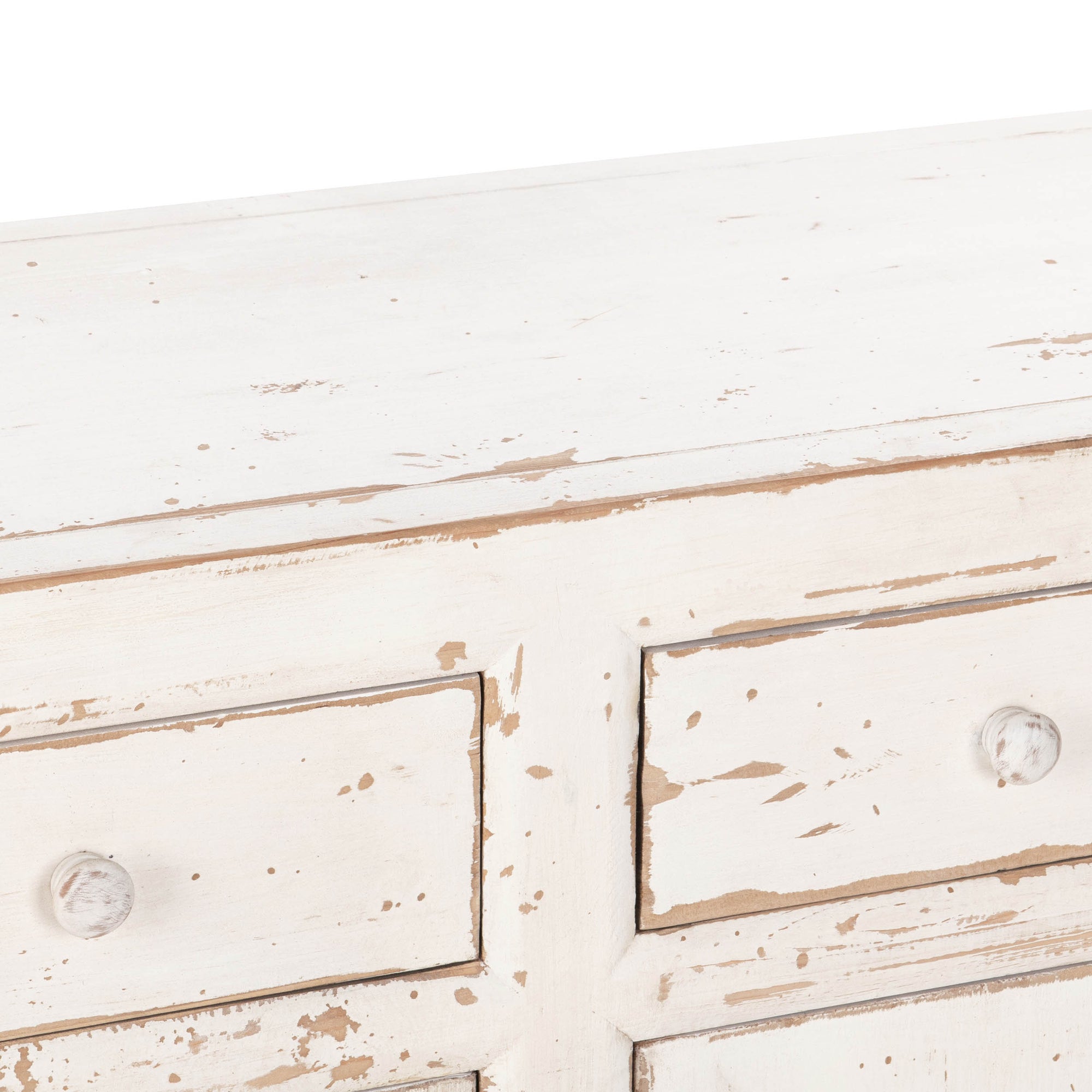 The Holden Buffet is expertly crafted from reclaimed pine, showcasing the natural grain and markings of the original lumber. Its distressed Worn White finish and tonal knobs give it the appearance of a treasured, found piece, combining rustic charm with functional elegance.